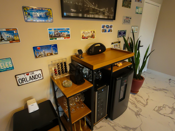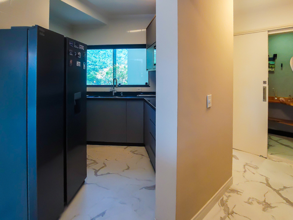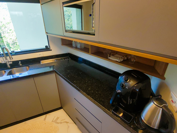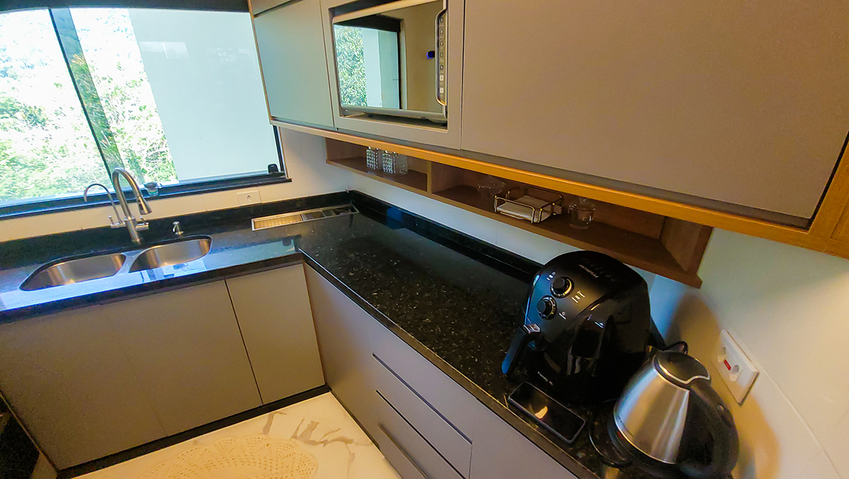 Cozinha americana integrada, equipada com eletrodomésticos modernos