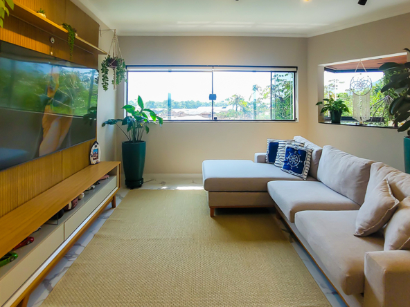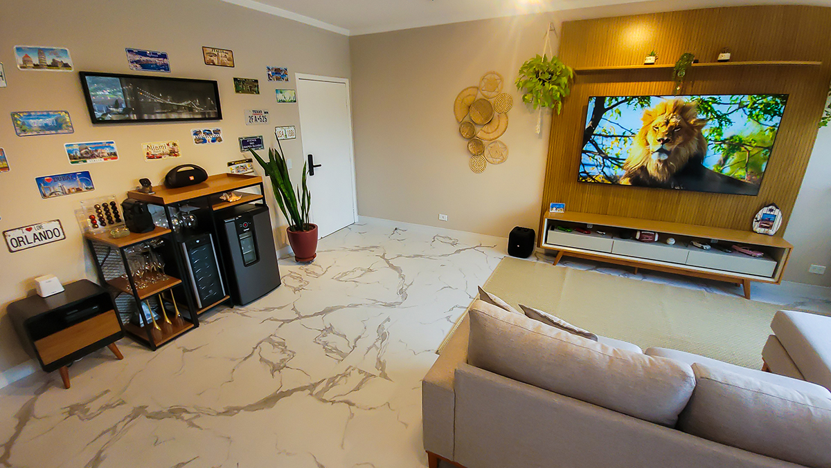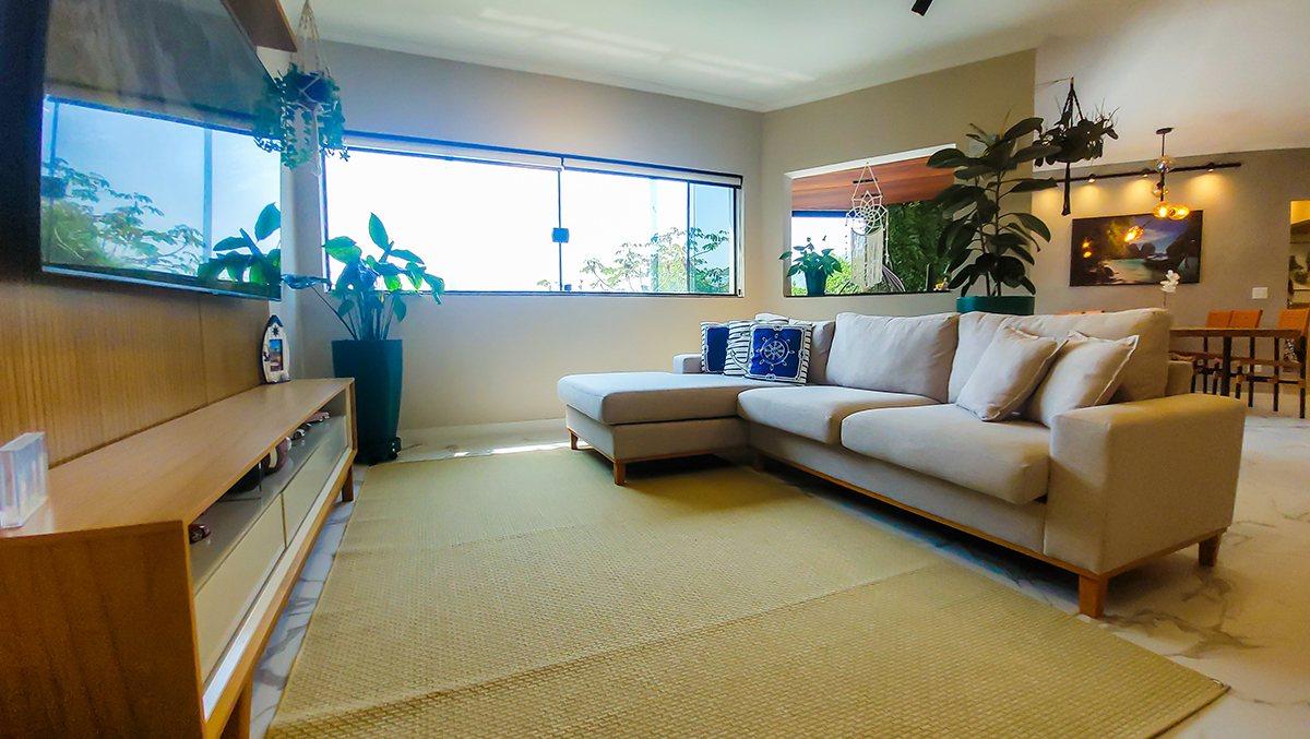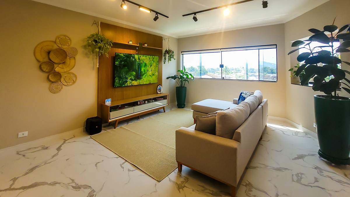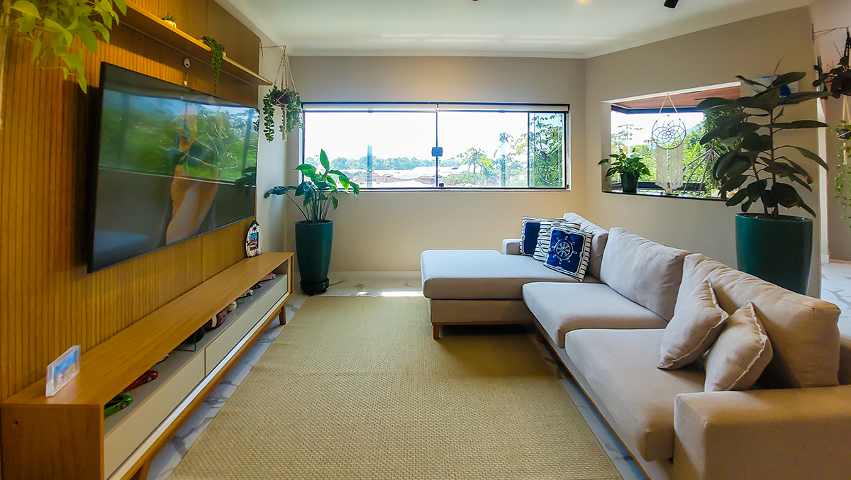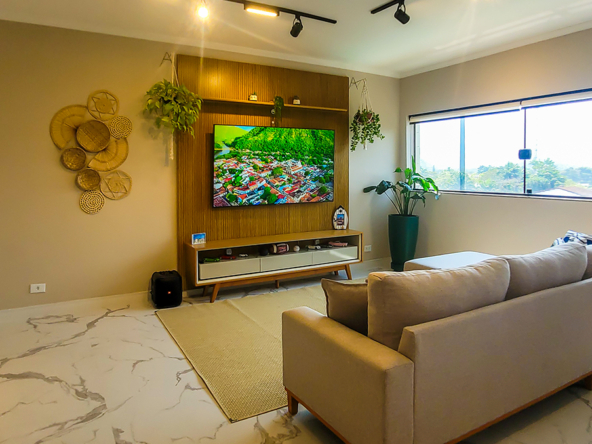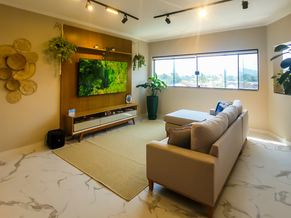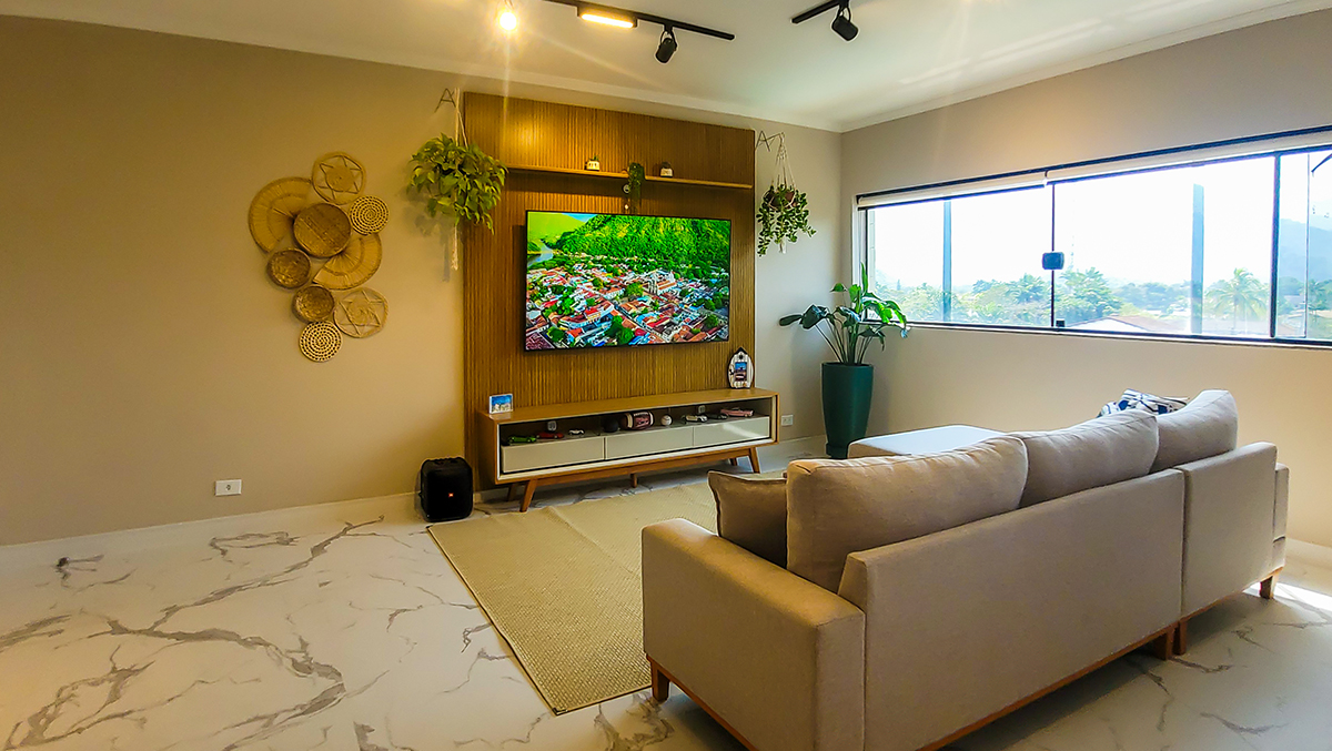 Living espaçoso, com TV e área de convivência