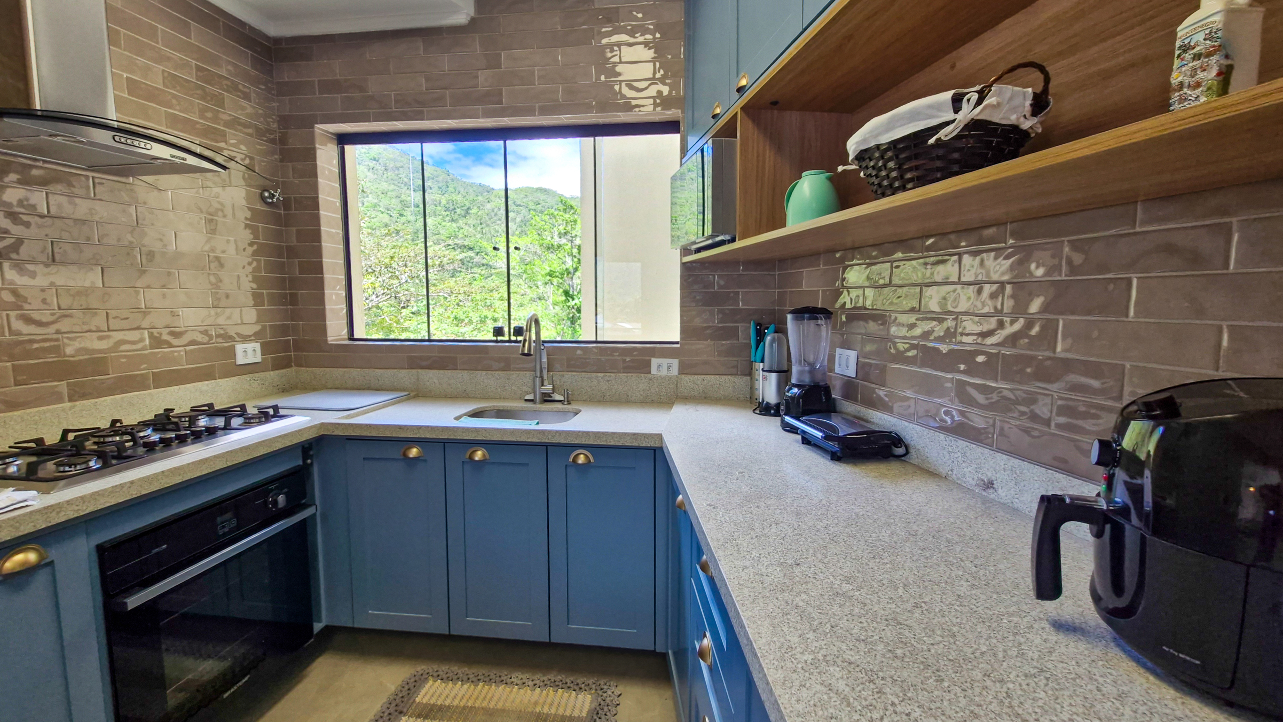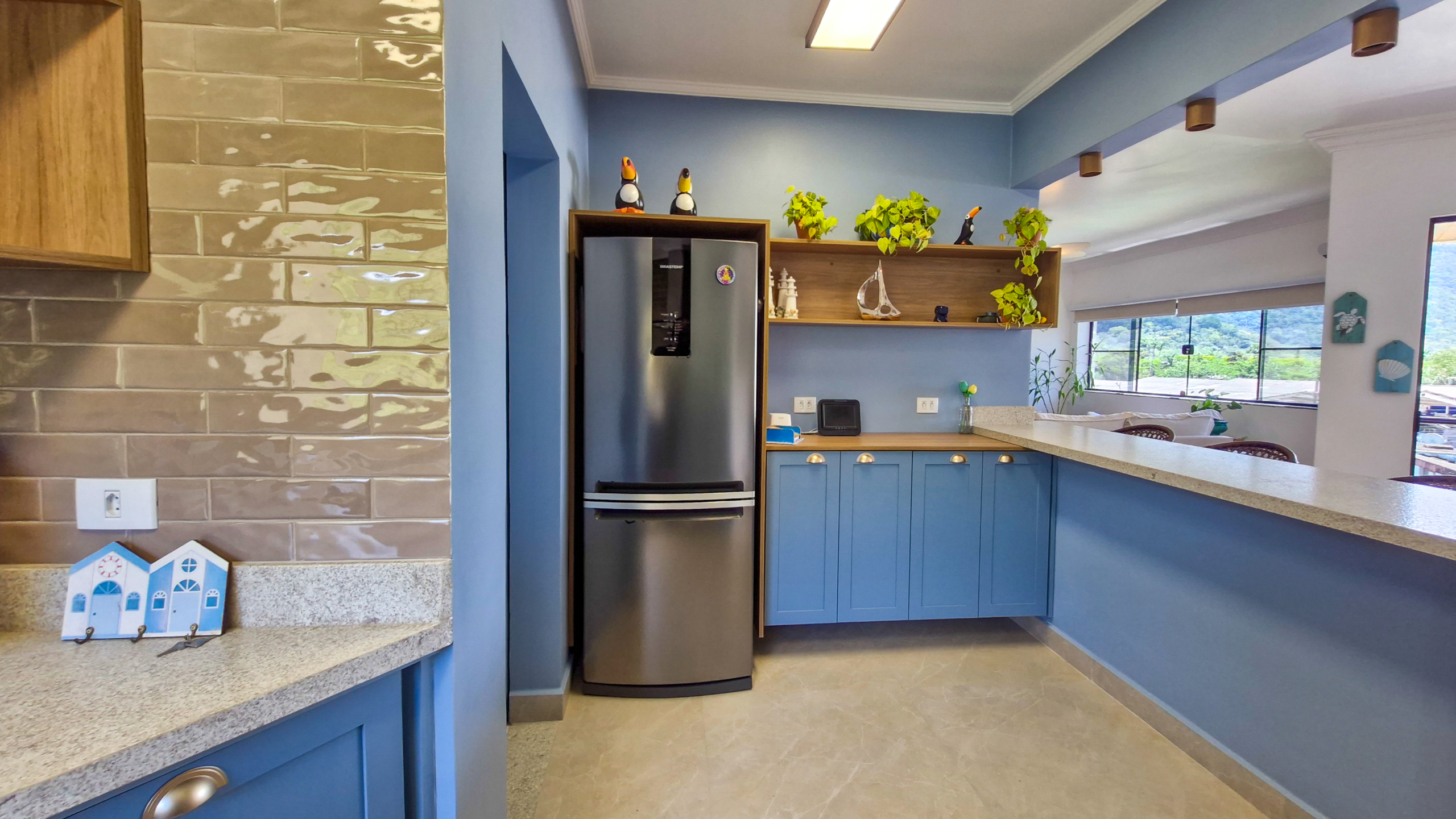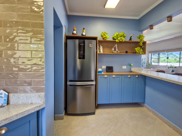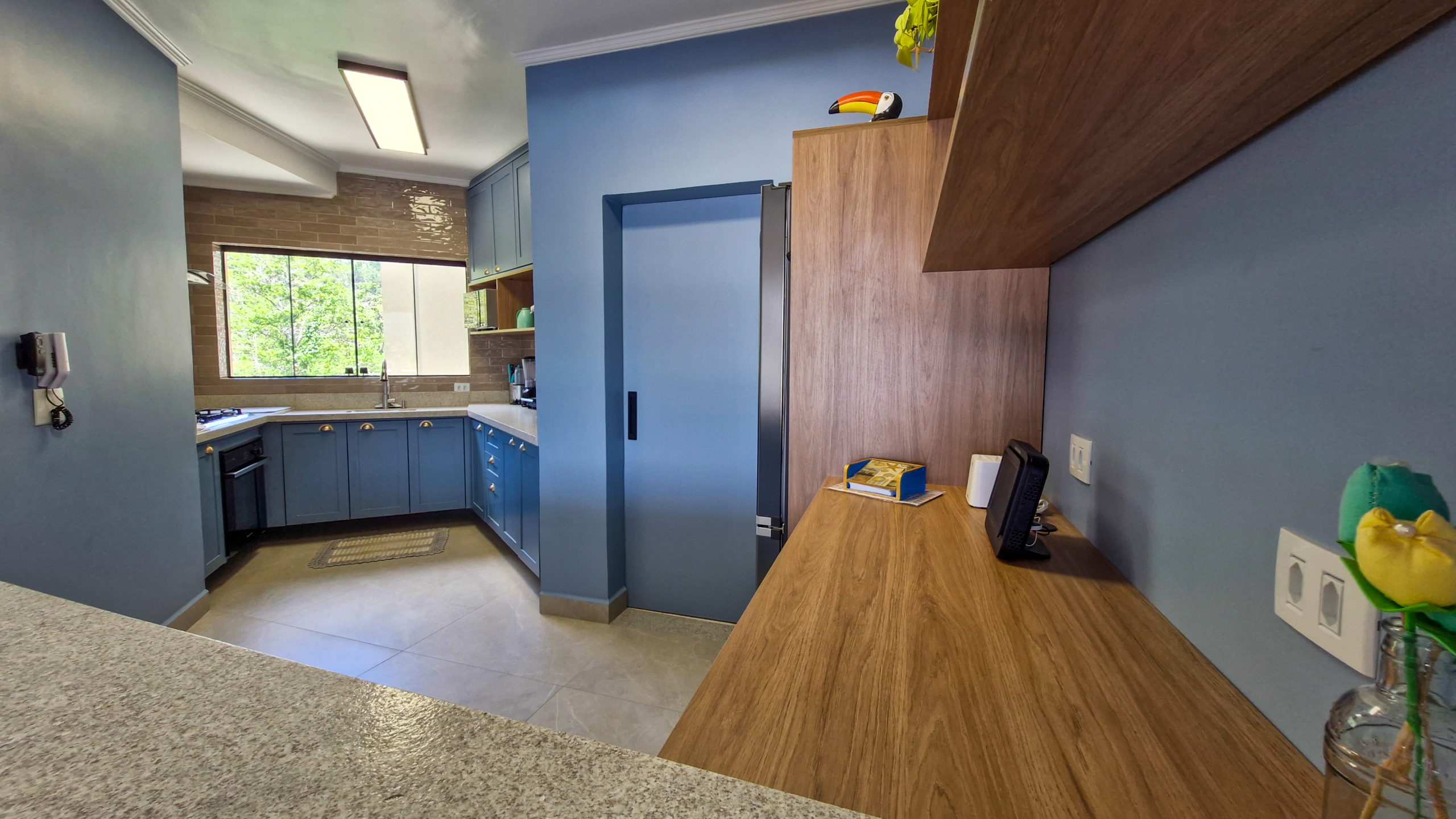 Cozinha americana integrada, equipada com eletrodomésticos modernos