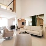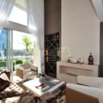 Elevador privativo. Sala de estar ampliada com pé direito duplo, ambiente de living com lareira ecológica em travertino romano.Mezanino com home theater tela double screen, projector HD e som ambiente.