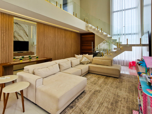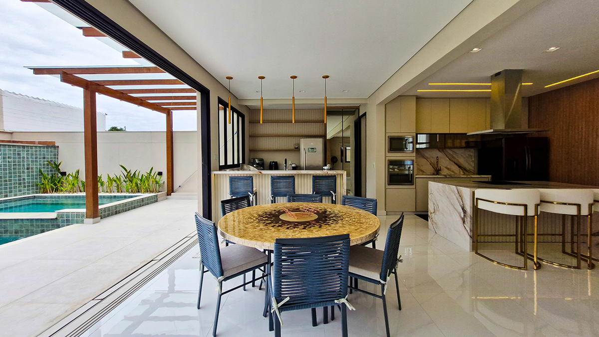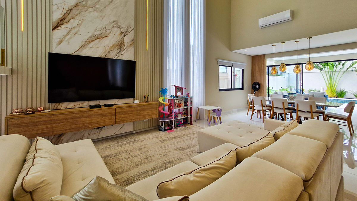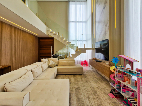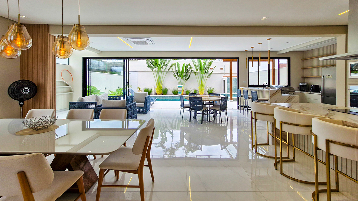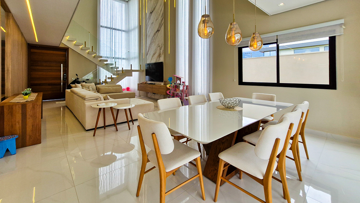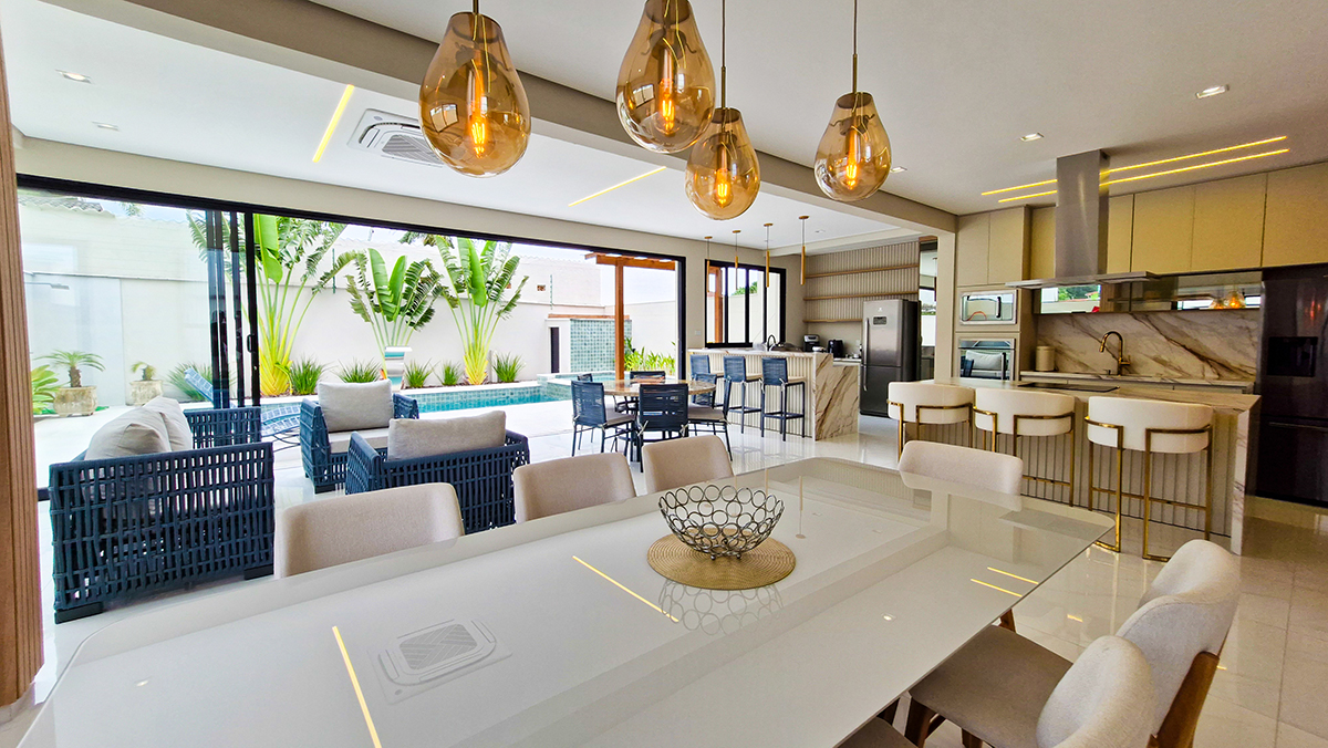Living imponente em conceito aberto, com pé-direito duplo, integrando sala de estar, sala de jantar e área gourmet interna. Grandes esquadrias garantem excelente iluminação natural, ventilação cruzada e conexão total com a área externa.