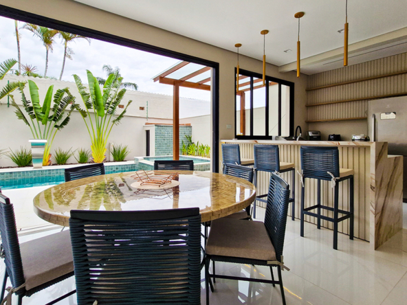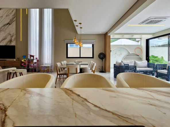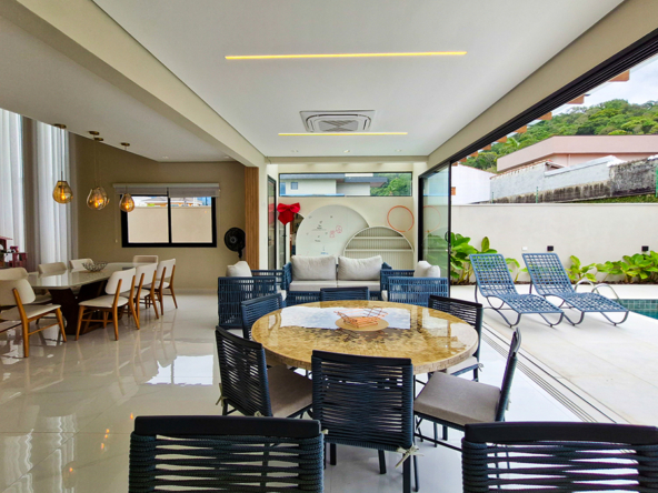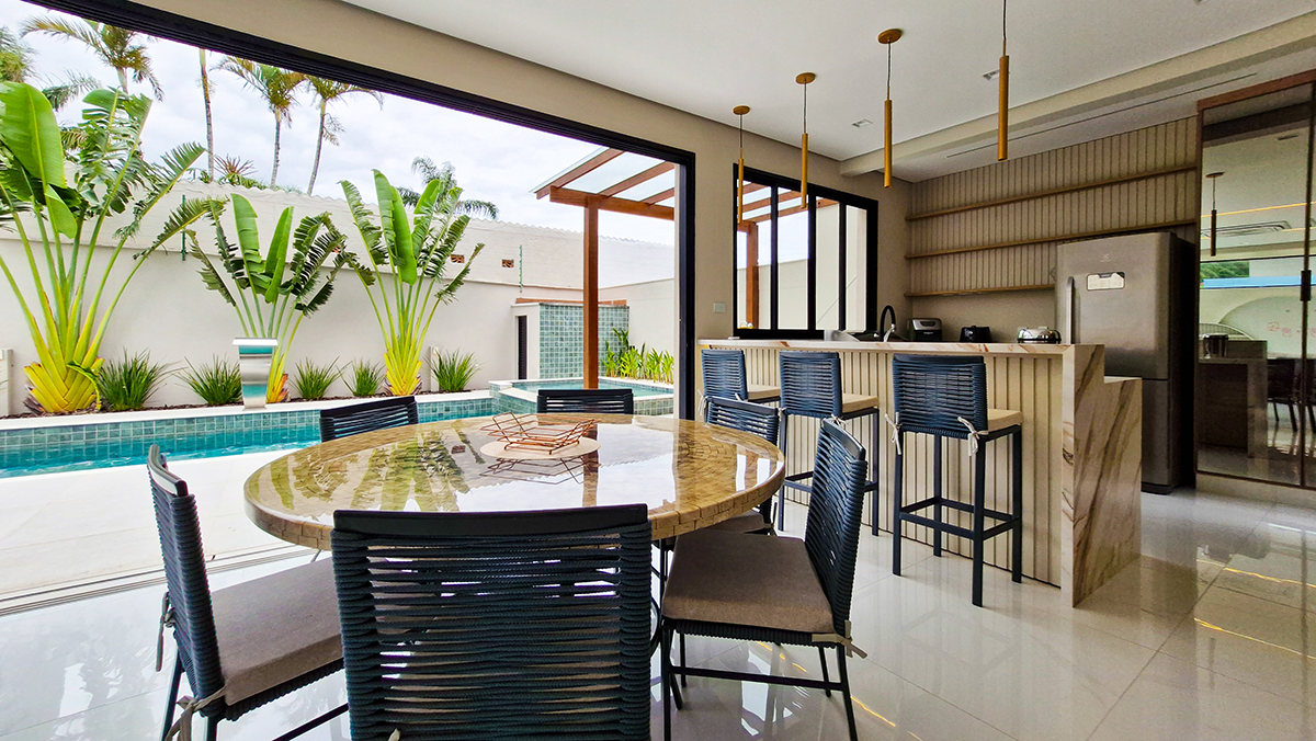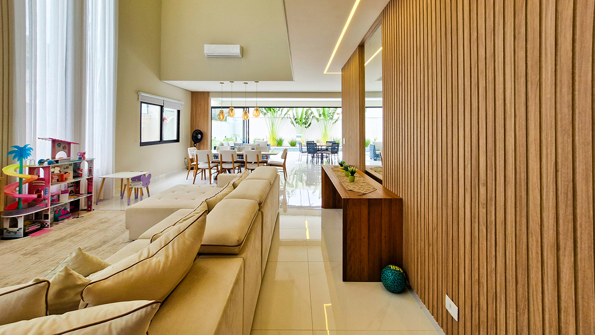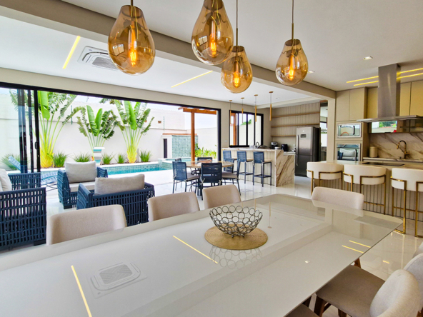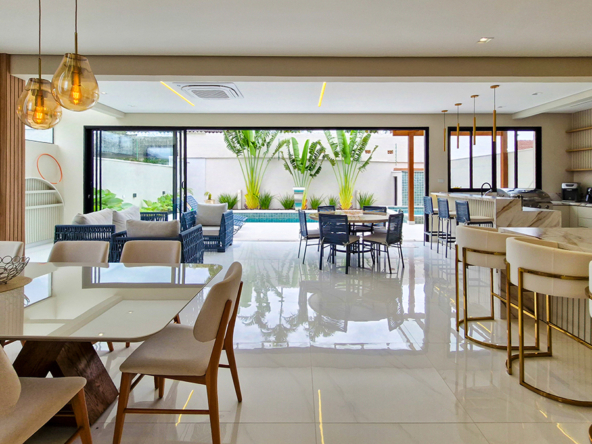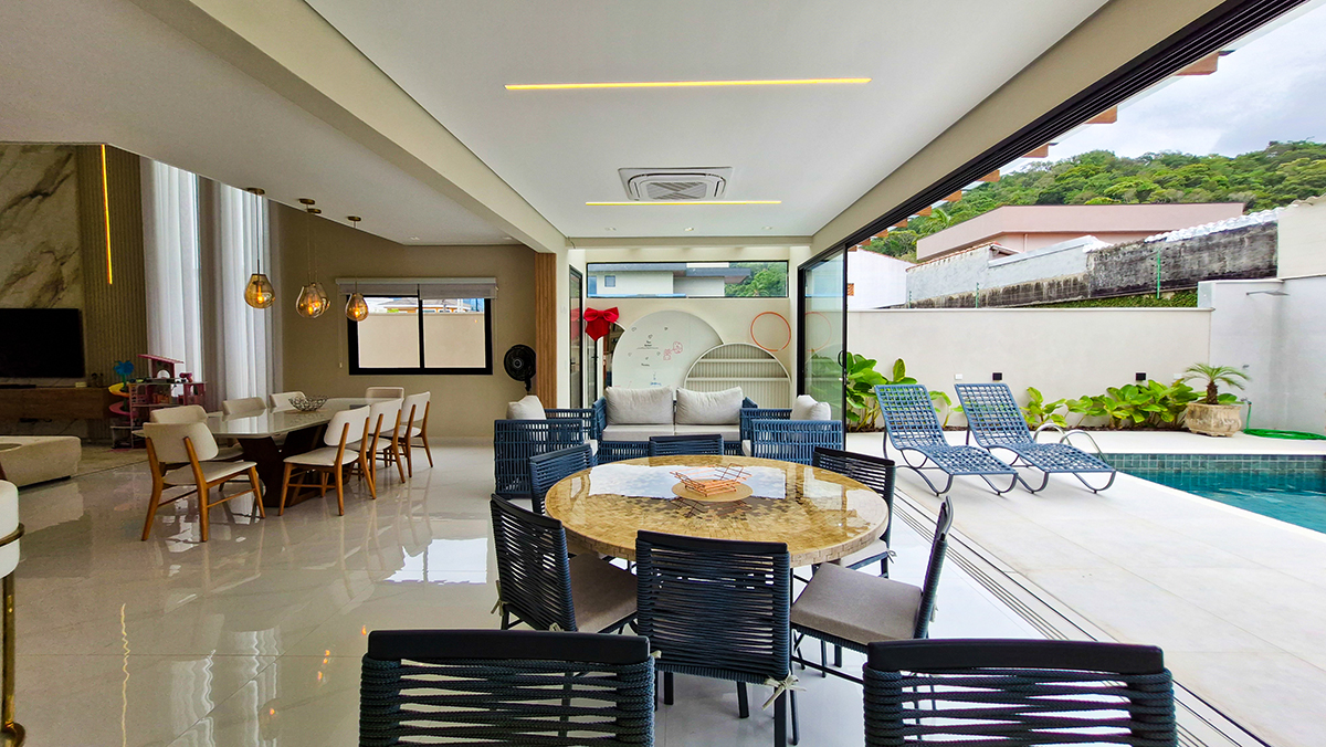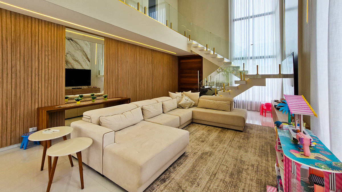 Living imponente em conceito aberto, com pé-direito duplo, integrando sala de estar, sala de jantar e área gourmet interna. Grandes esquadrias garantem excelente iluminação natural, ventilação cruzada e conexão total com a área externa.