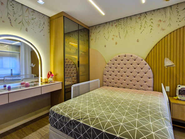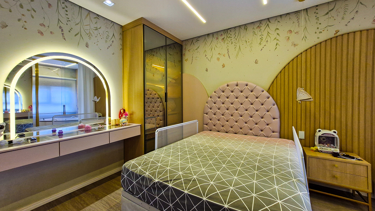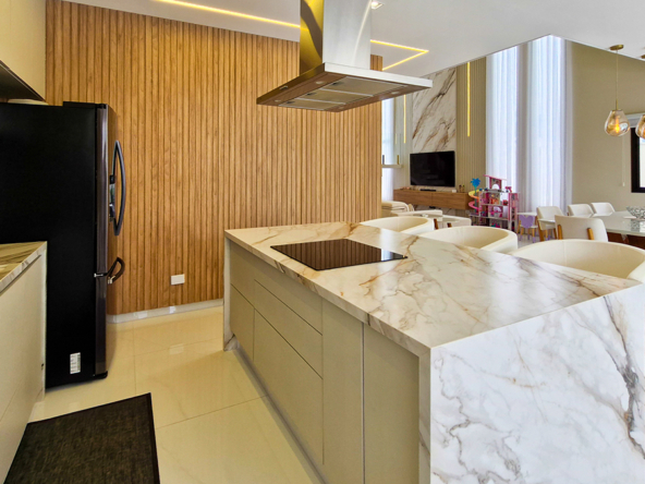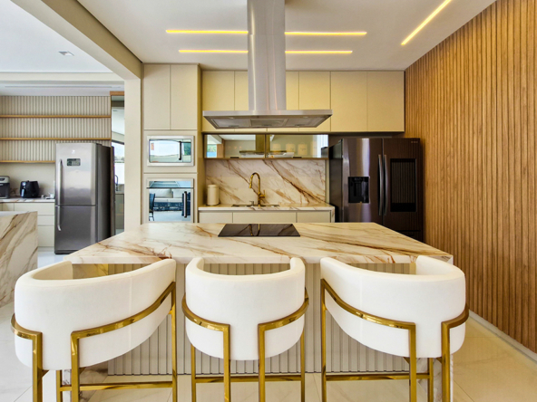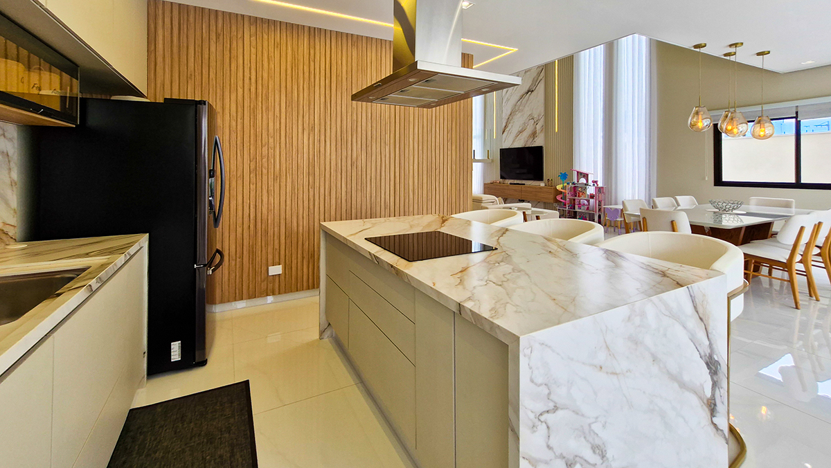 O projeto de interiores combina revestimentos em madeira, pedra natural e iluminação em LED, criando um ambiente sofisticado, moderno e acolhedor.