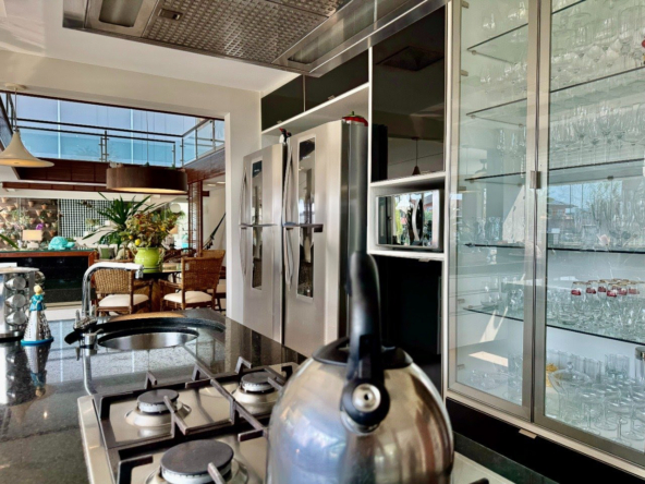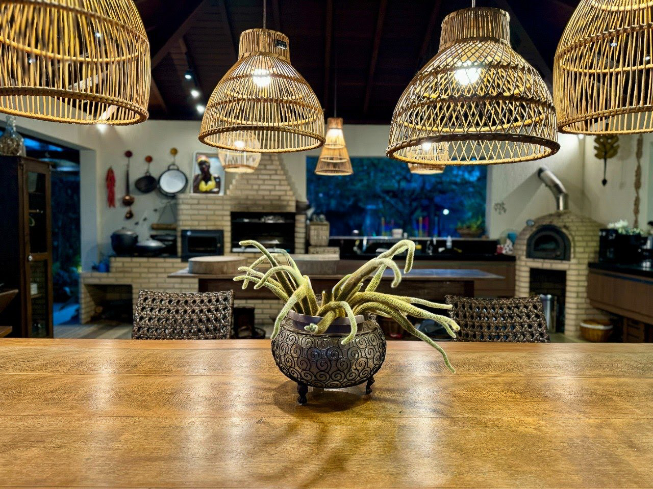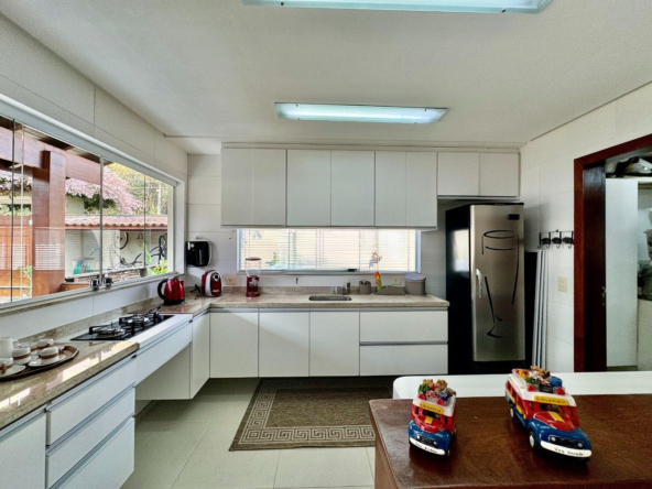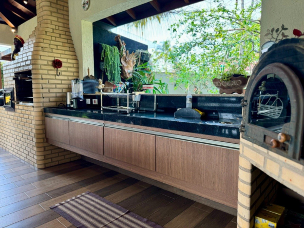 Área gourmet interna, climatizada, com forno de pizza, churrasqueira a gás, churrasqueira à carvão, máquina de crepe e freezer. Cozinha super equipada.