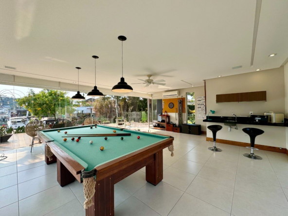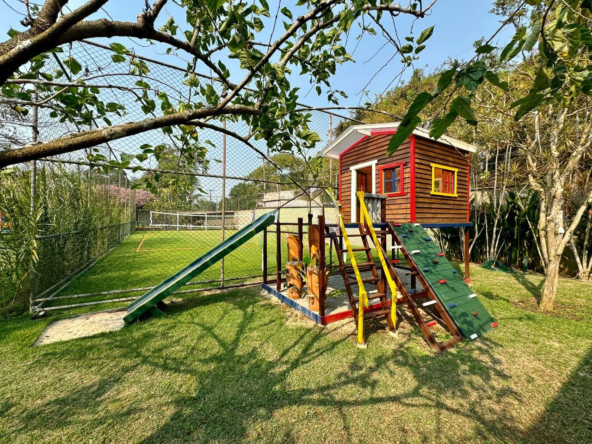 Cozinha gourmet externa para com fogão à lenha, forno de pizza, churrasqueira e grande mesa de refeições. Sala de jogos com mesa de sinuca oficial, jogo de dardo, banheiro e som.