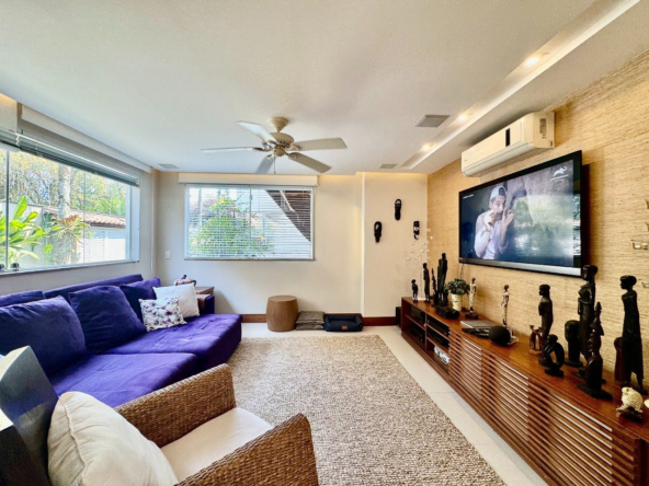 Ampla sala climatizada dividida em ambientes com sala de estar e jantar. Sala com home theater com tv de 60 polegadas.