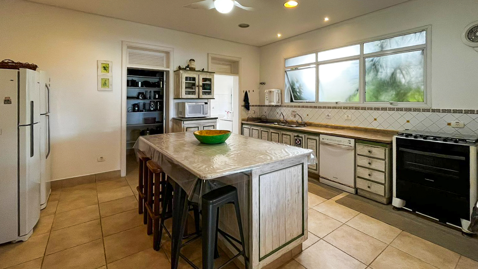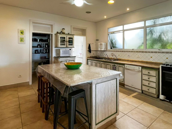 Cozinha completa com 2 geladeiras, 2 freezers, filtro de água, lava-louças, micro-ondas, fogão convencional e fogão industrial, louças e utensílios (talheres, panelas, eletrodomésticos), despensa, lavanderia com máquina de lavar 16 kg e secadora.