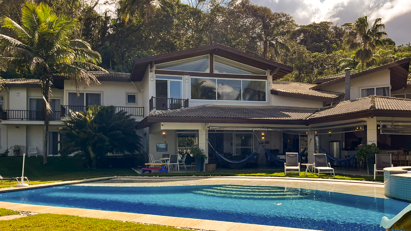 7 Suítes, todas com ar-condicionado e varanda, sendo 3 suítes master com banheira de hidromassagem e 1 suíte no térreo. Hall de entrada com Lavabo. Roupas de cama e banho completa.