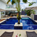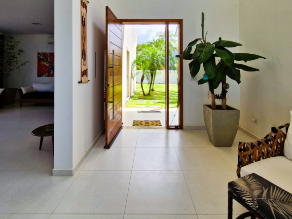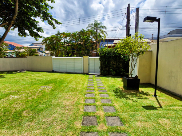 Fachada & Acesso Fachada contemporânea em tons claros com volumes arquitetônicos modernos, muro de privacidade e portão eletrônico. Jardim frontal com grama bem cuidada e palmeiras que remetem ao clima tropical.