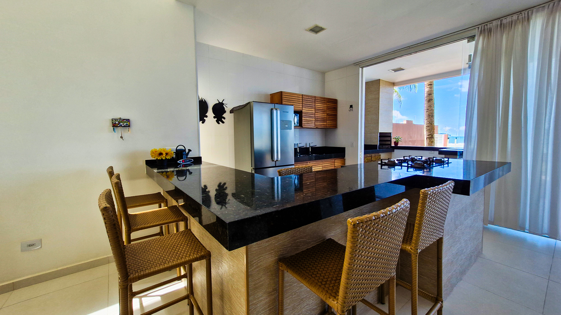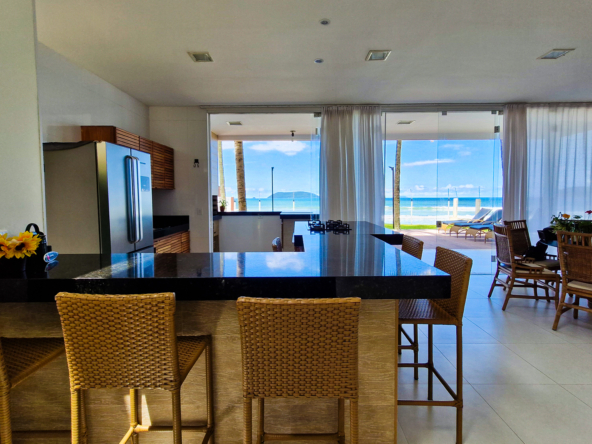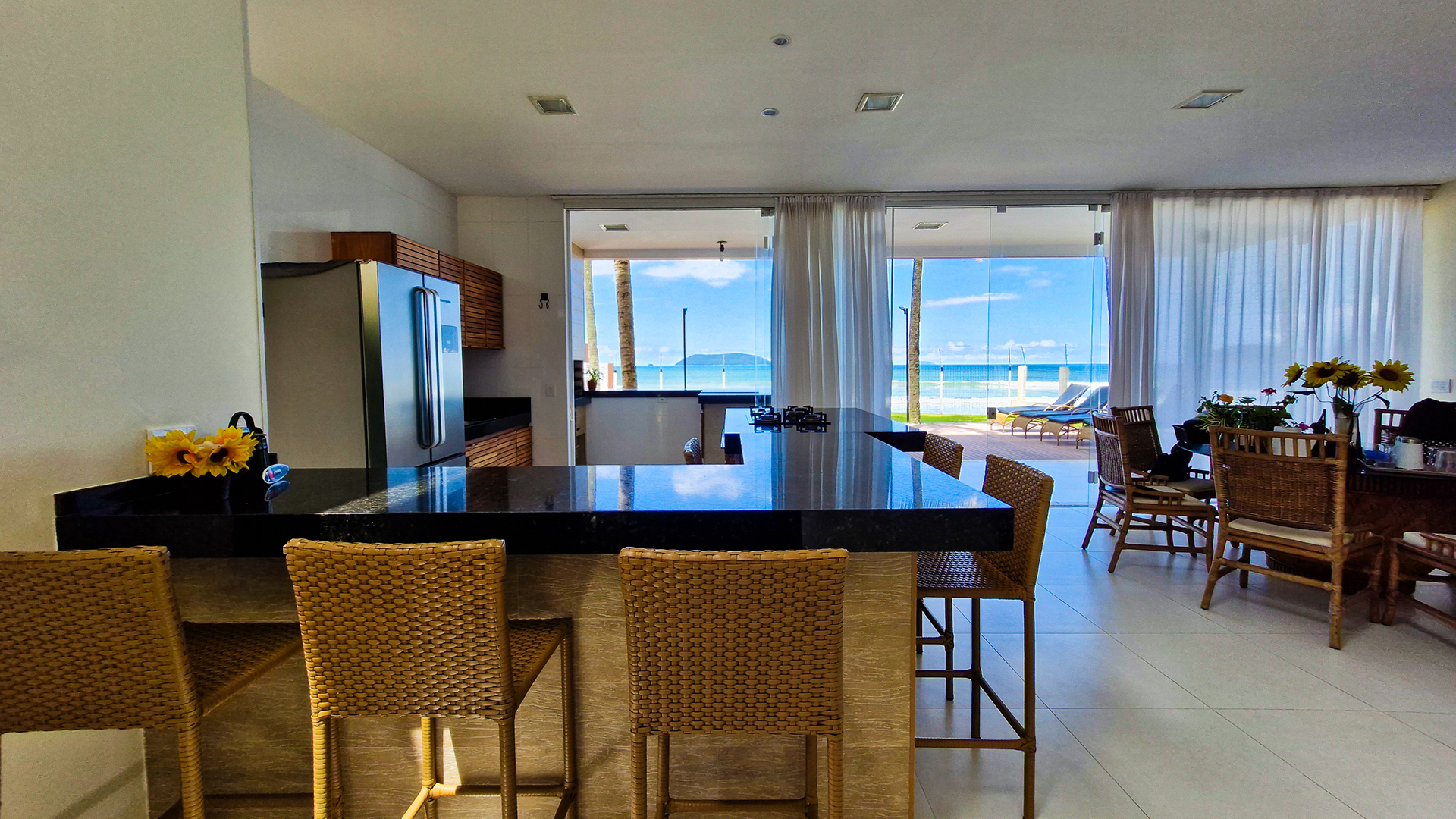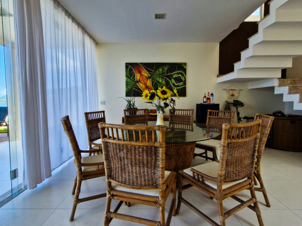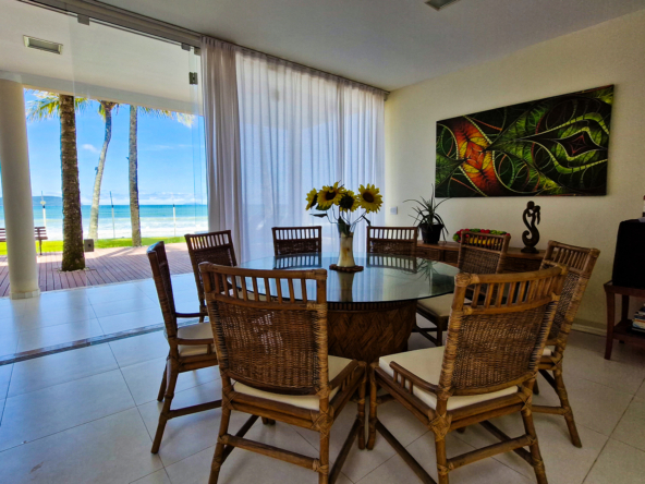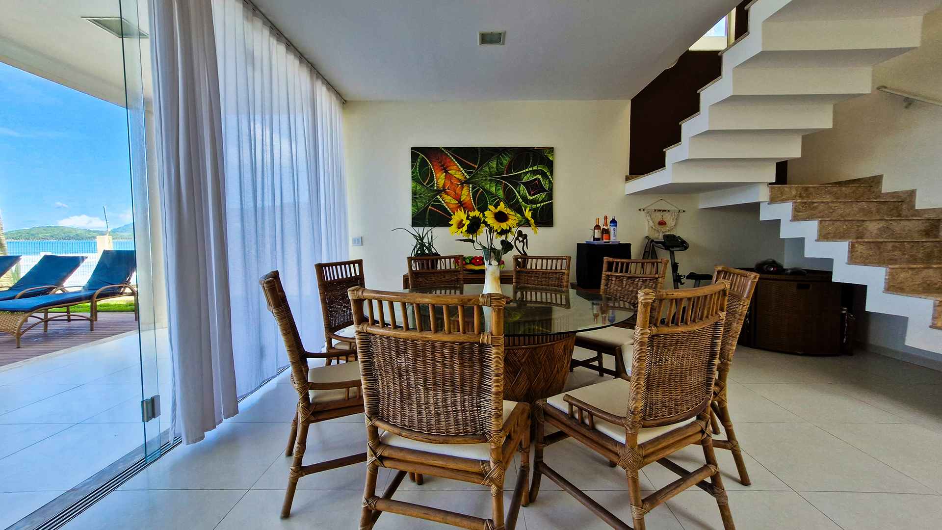 Sala de jantar com mesa para 8 lugares e vista para o mar