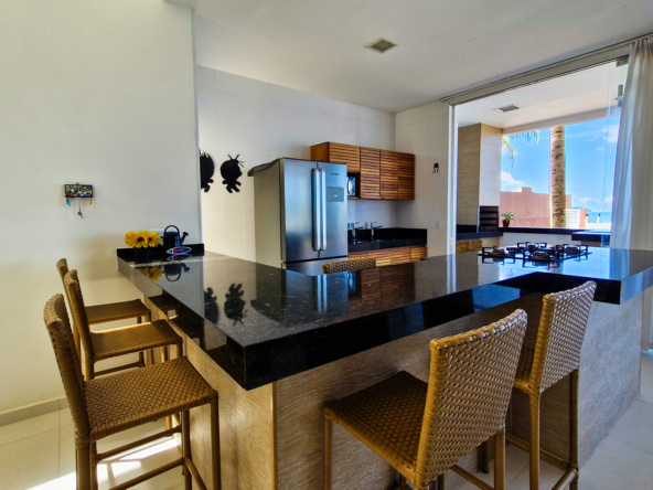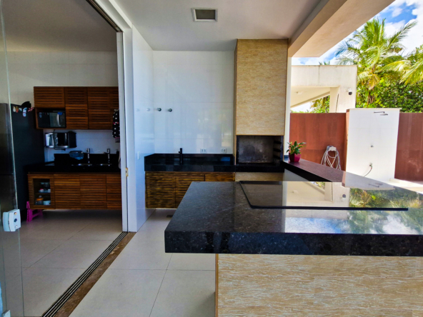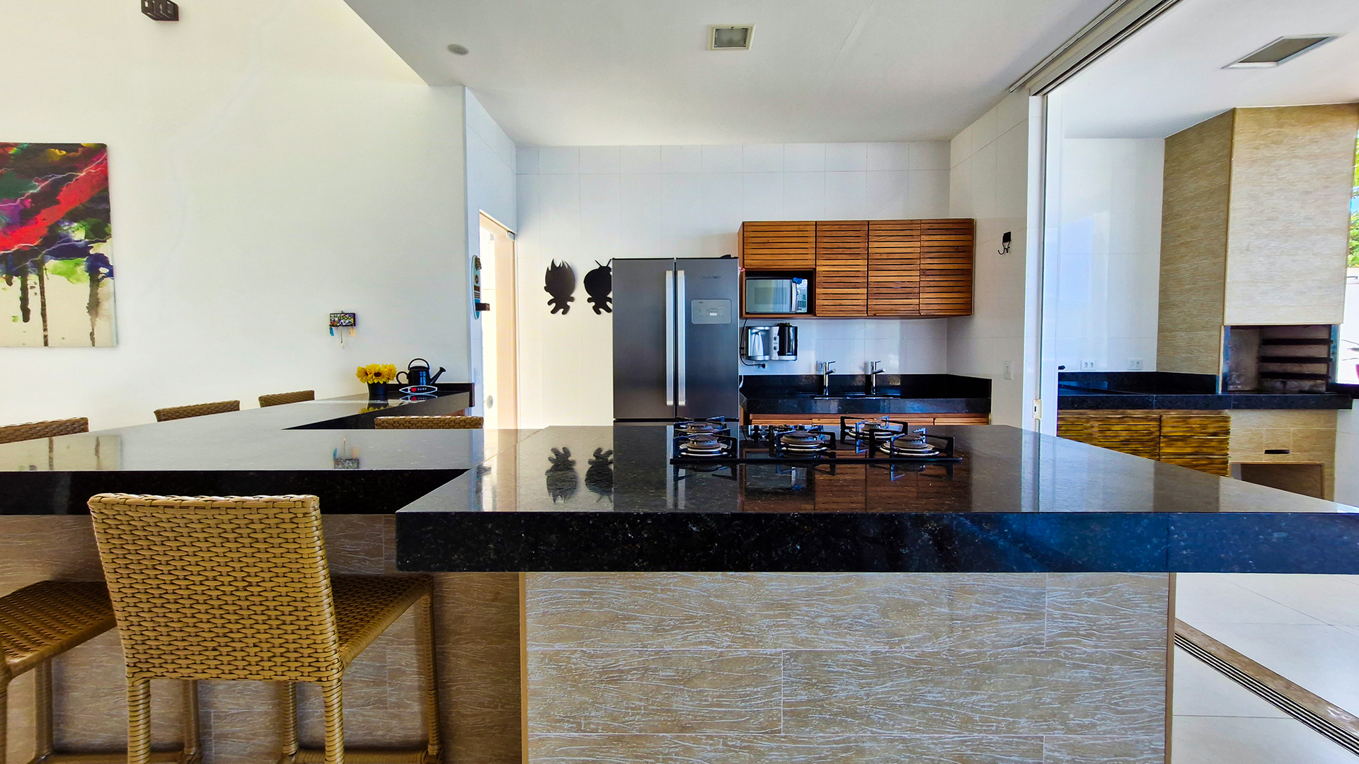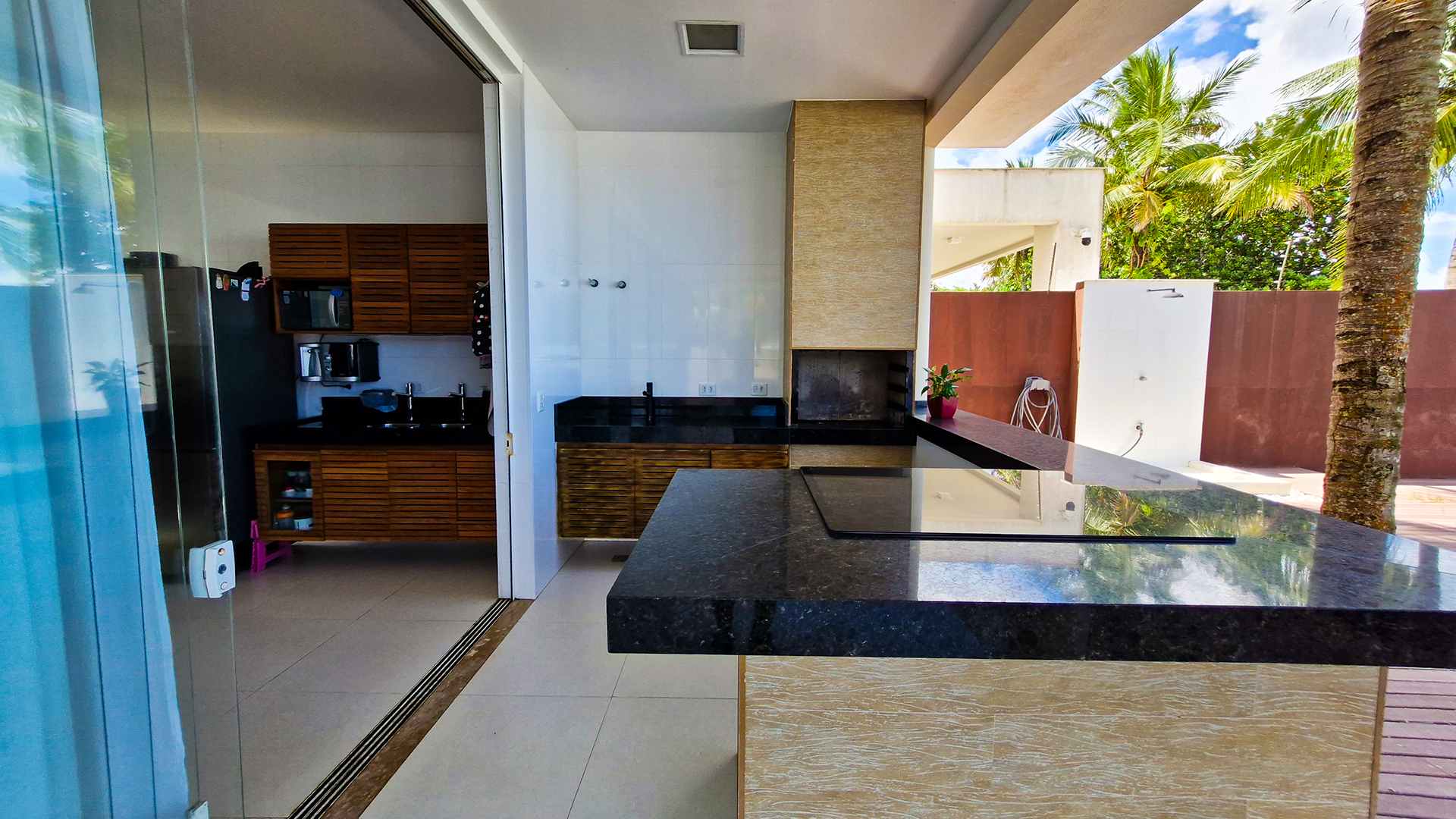 Varanda gourmet coberta com churrasqueira e bancada em granito preto