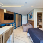 Sala de estar, jantar e cozinha integrados com pé-direito duplo