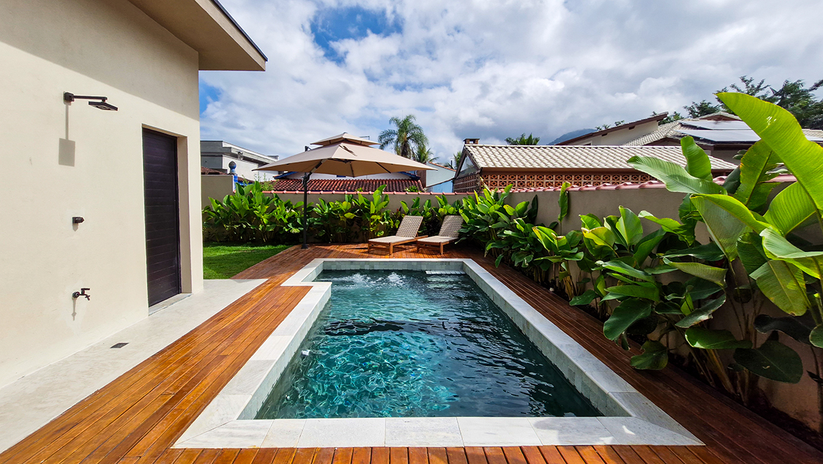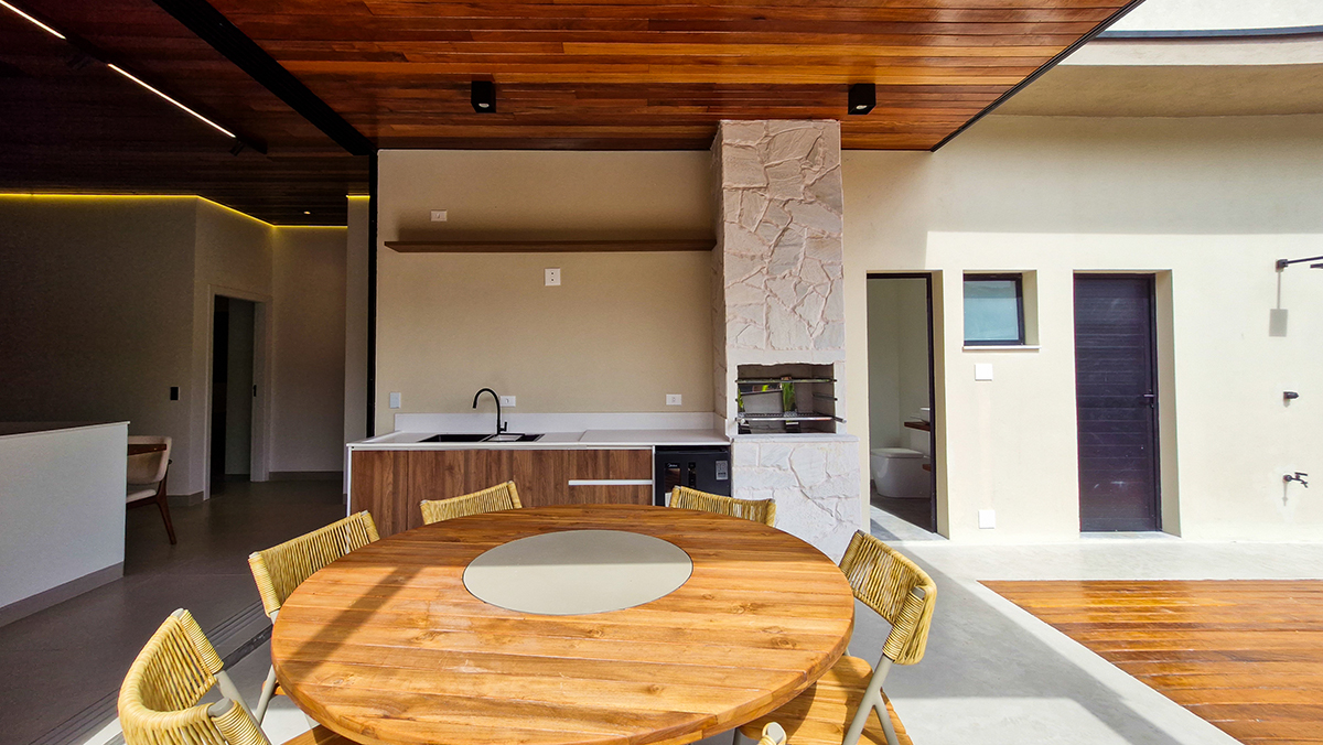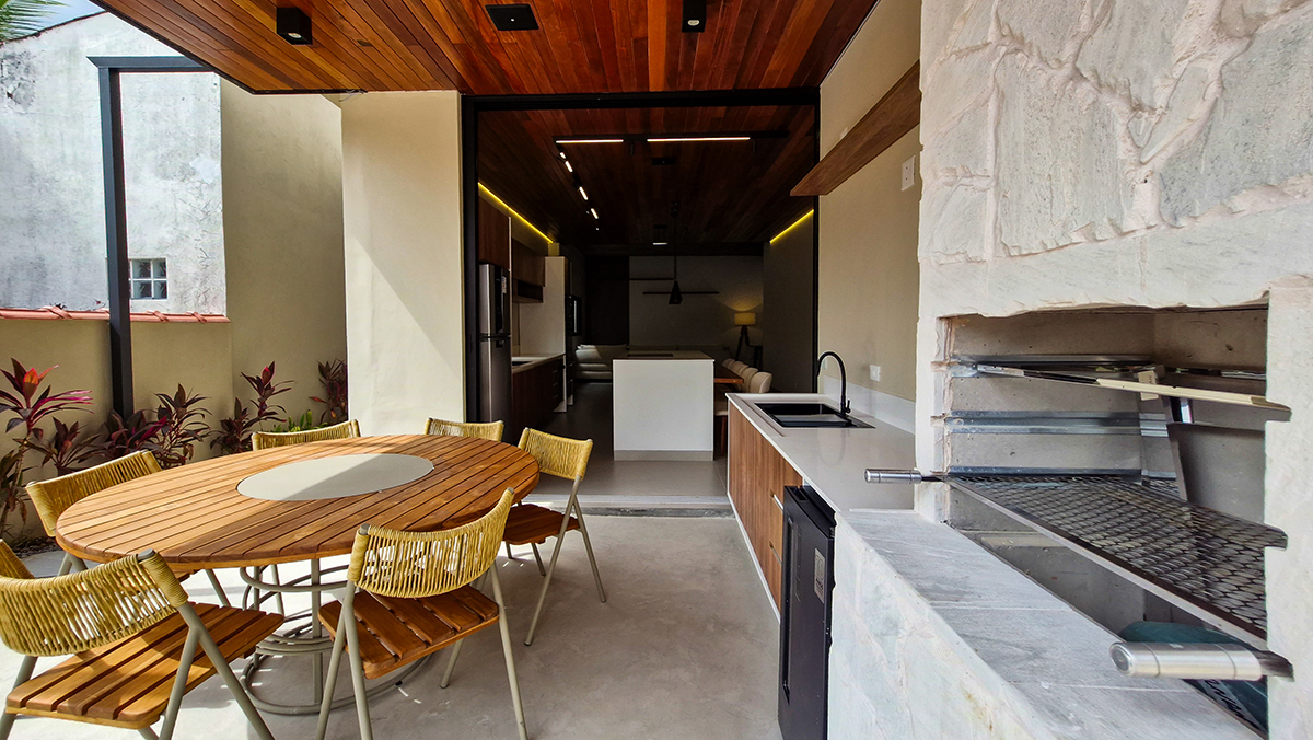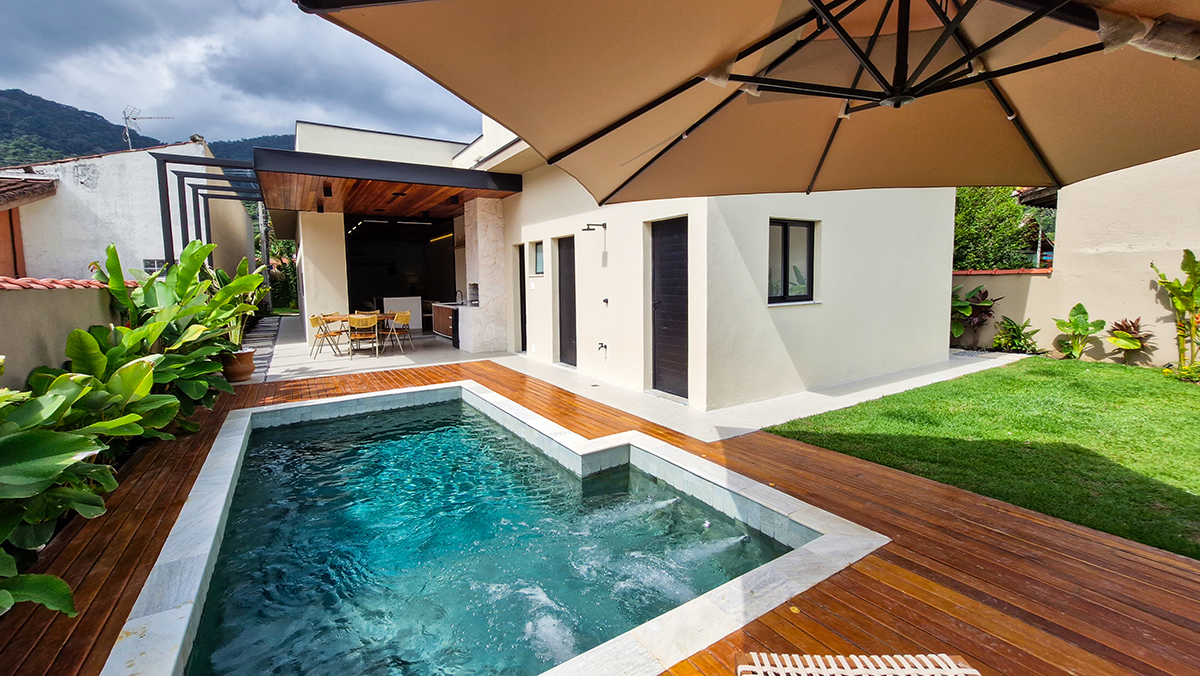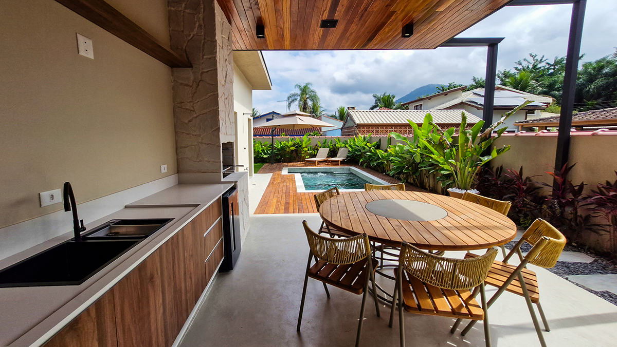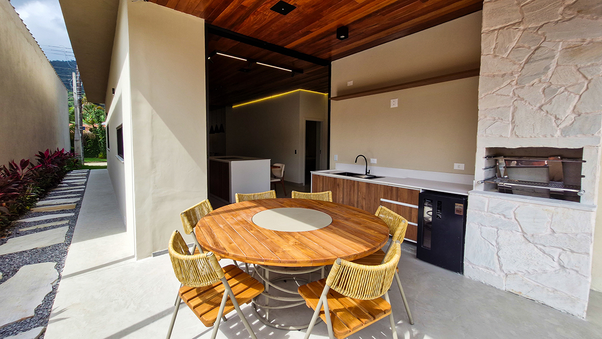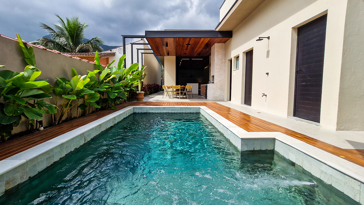 A área externa é um verdadeiro convite ao lazer: piscina revestida em pedra Hijau, material importado da Indonésia com propriedades térmicas e sensoriais, equipada com hidromassagem e cascata que nasce do beiral, além de um paisagismo completo que traz privacidade e atmosfera tropical.