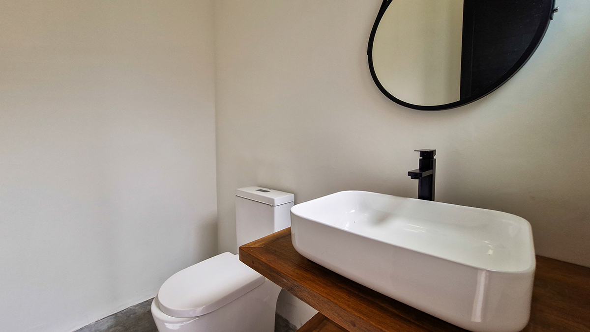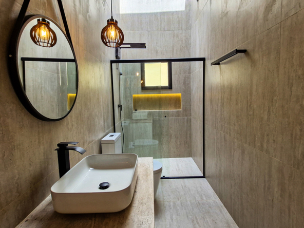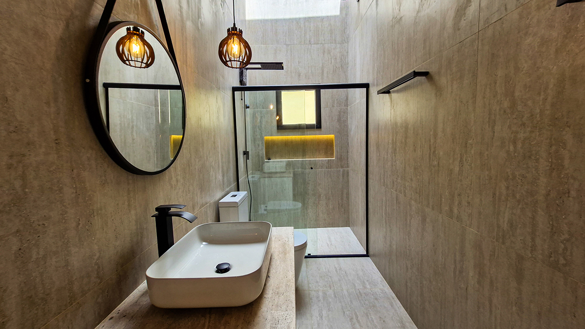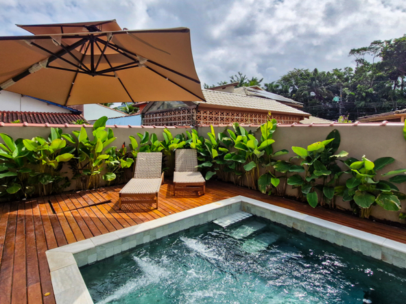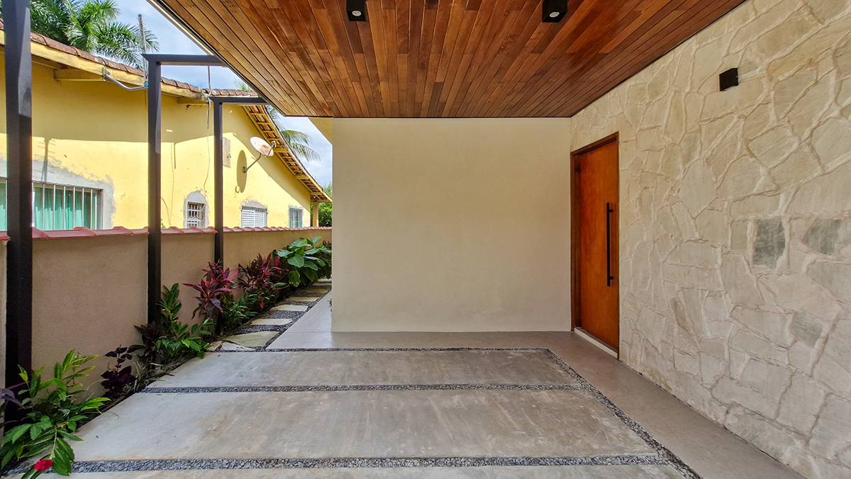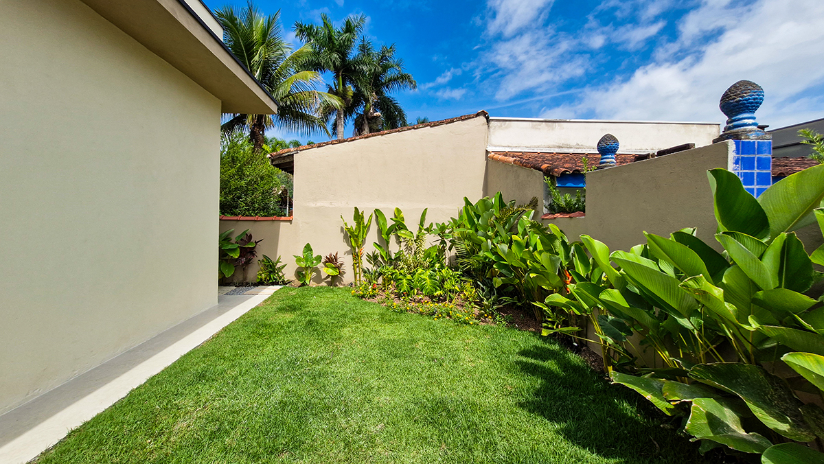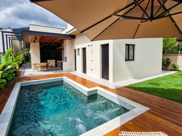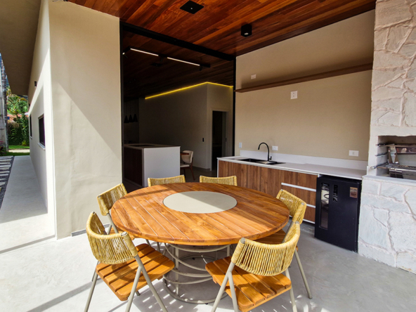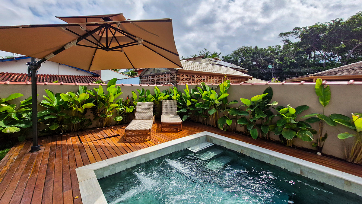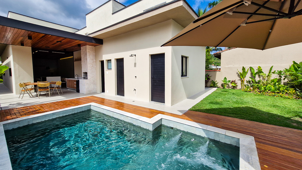 A área externa é um verdadeiro convite ao lazer: piscina revestida em pedra Hijau, material importado da Indonésia com propriedades térmicas e sensoriais, equipada com hidromassagem e cascata que nasce do beiral, além de um paisagismo completo que traz privacidade e atmosfera tropical.