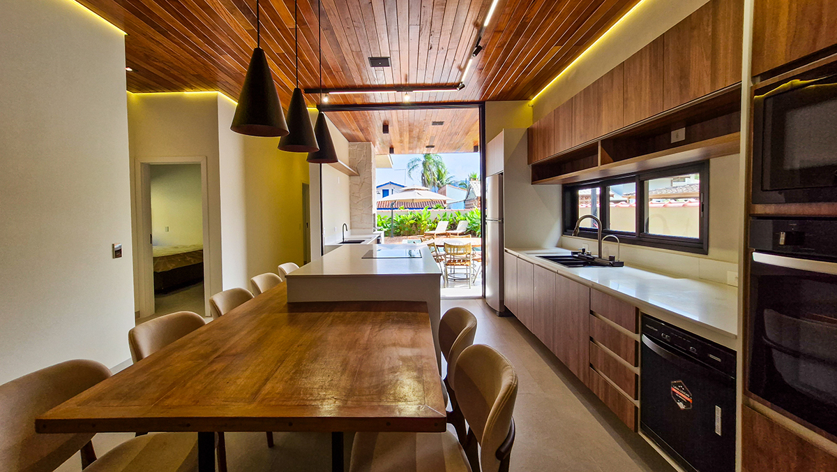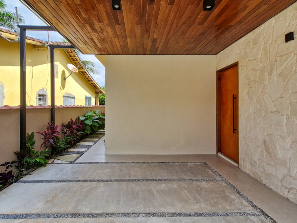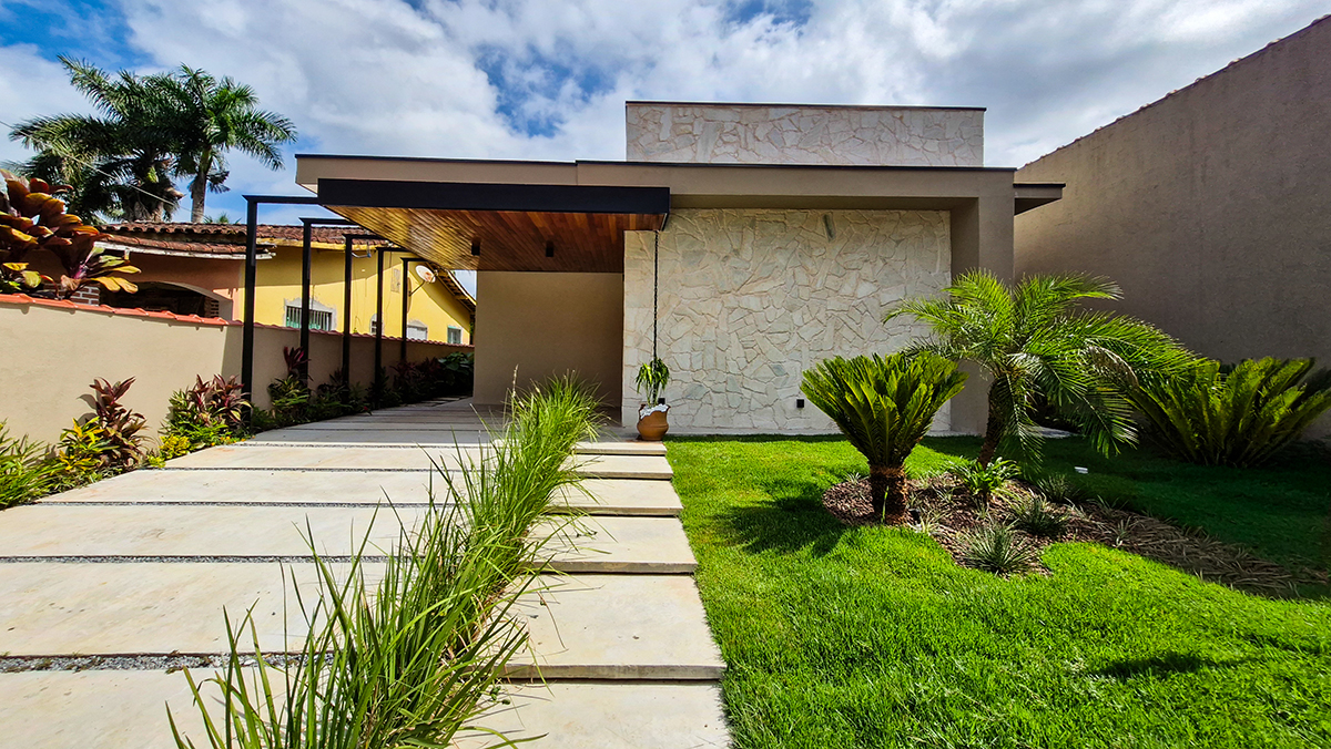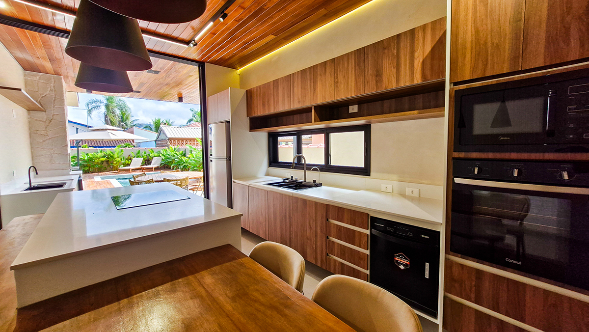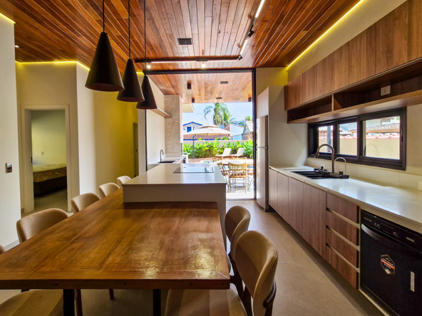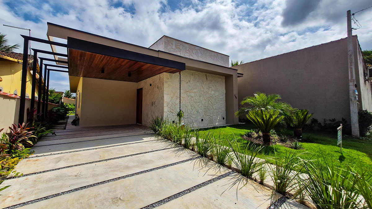 Internamente, o imóvel conta com 3 suítes confortáveis, lavabo, lavanderia e hobby box, além de marcenaria planejada e acabamentos de alto padrão — com destaque para os 70m² de pedra natural Atacama aplicados na fachada e área gourmet, e o uso de madeira garapeira em todo o forro e deck, reforçando o conceito sofisticado com identidade praiana.