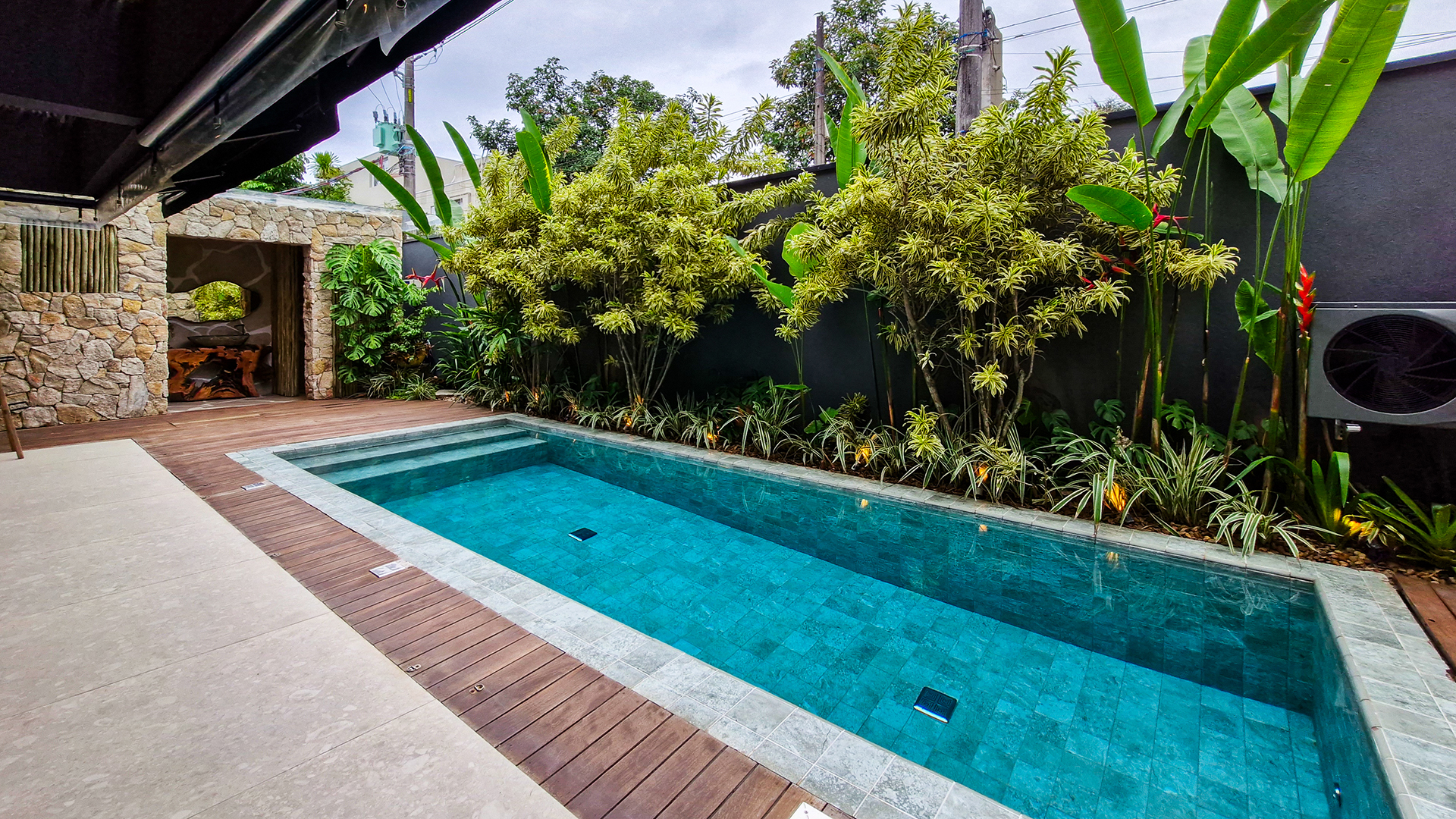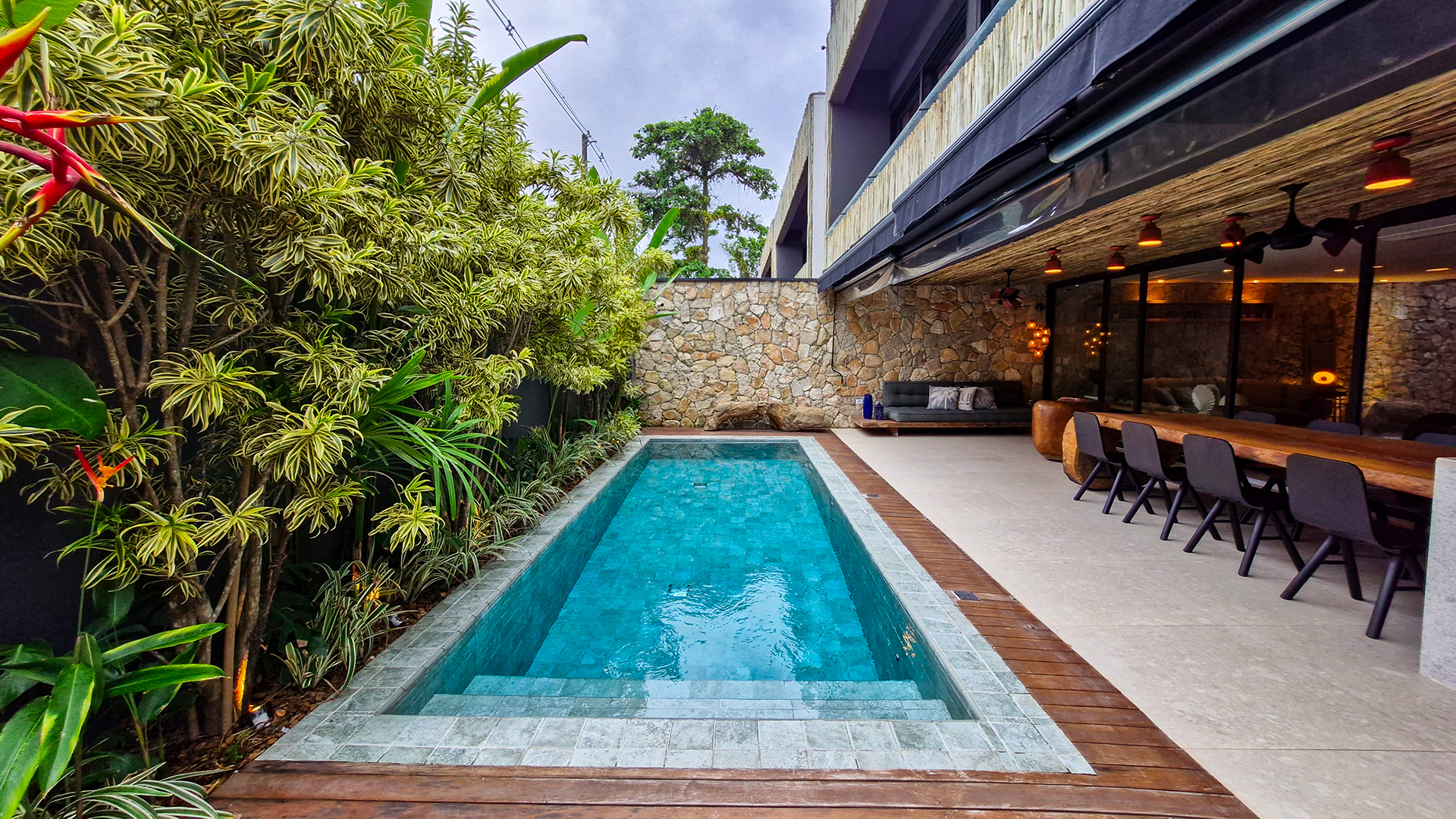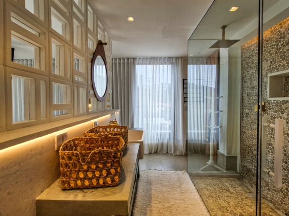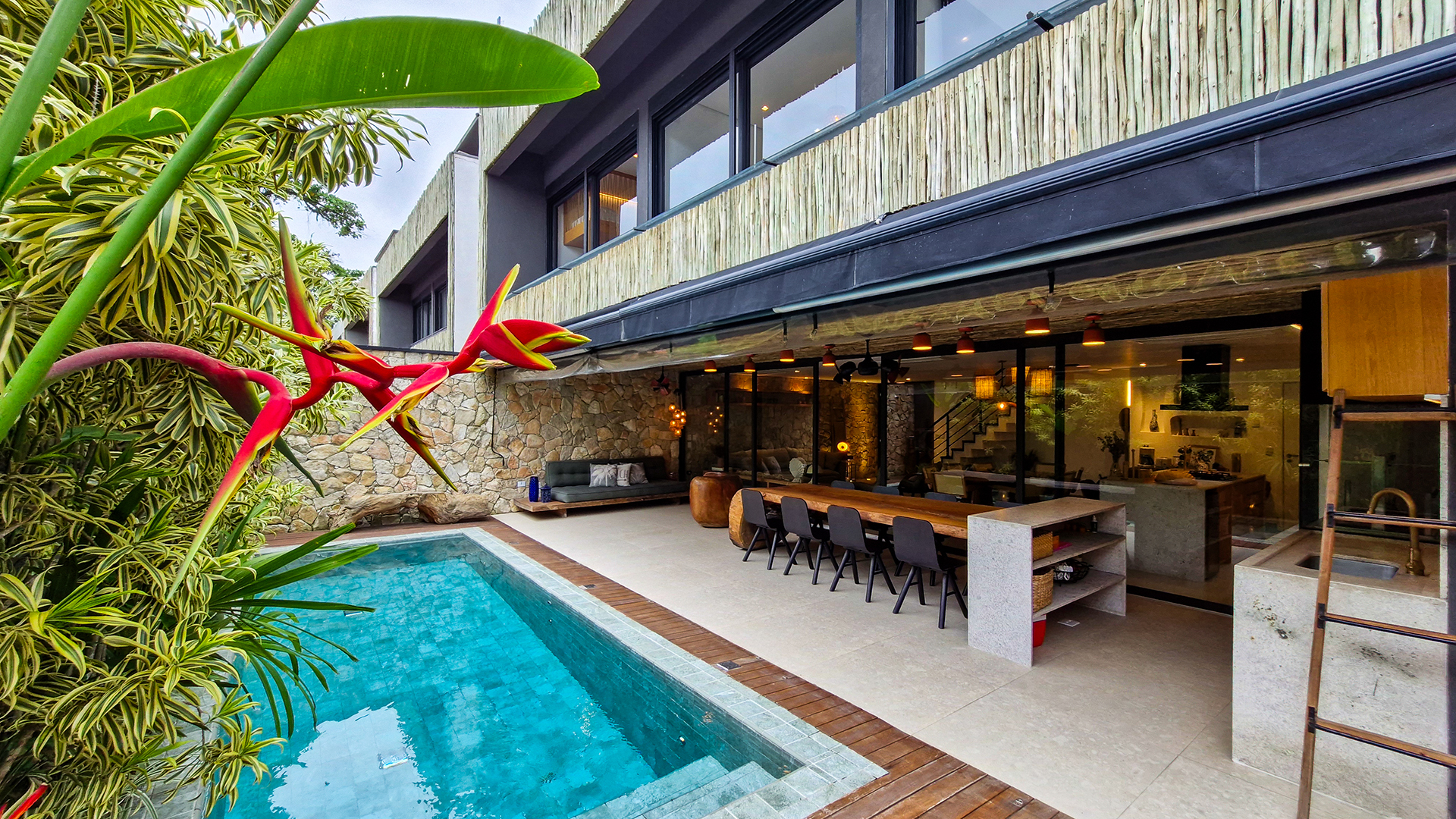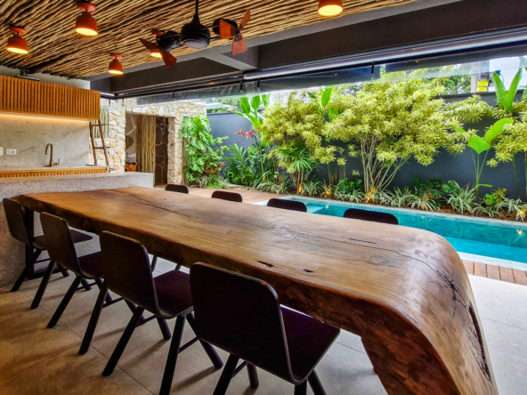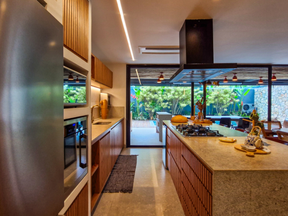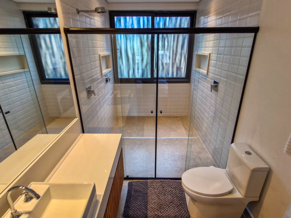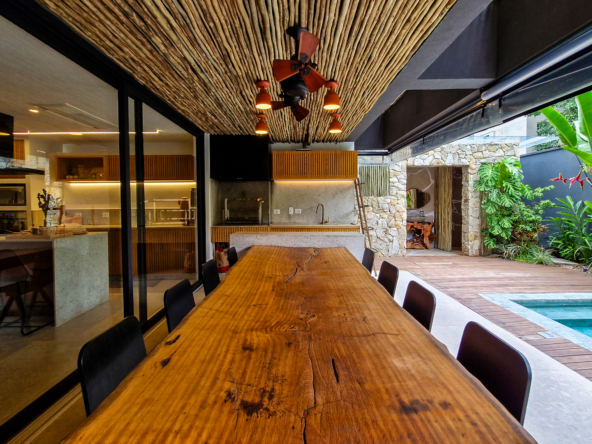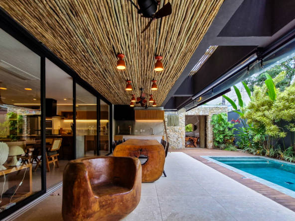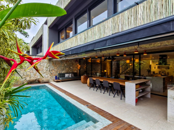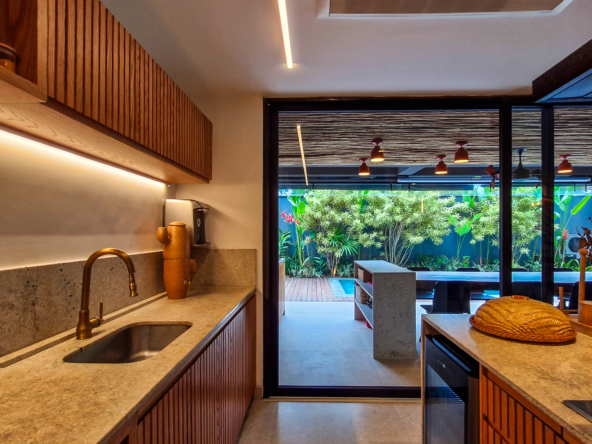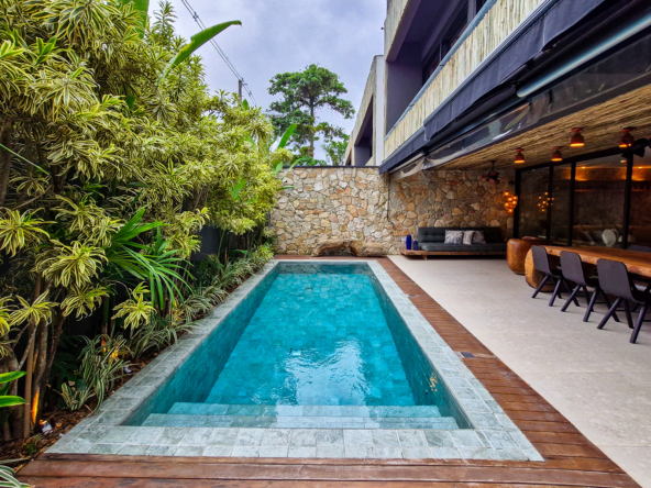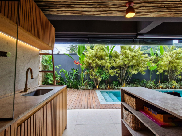 A área externa é um verdadeiro refúgio privativo: piscina com sistema de aquecimento por troca de calor e tratamento salinizado, envolta por paisagismo tropical exuberante. O espaço conta ainda com vestiário completo, ducha e lavabo externo, trazendo praticidade total para momentos de lazer.