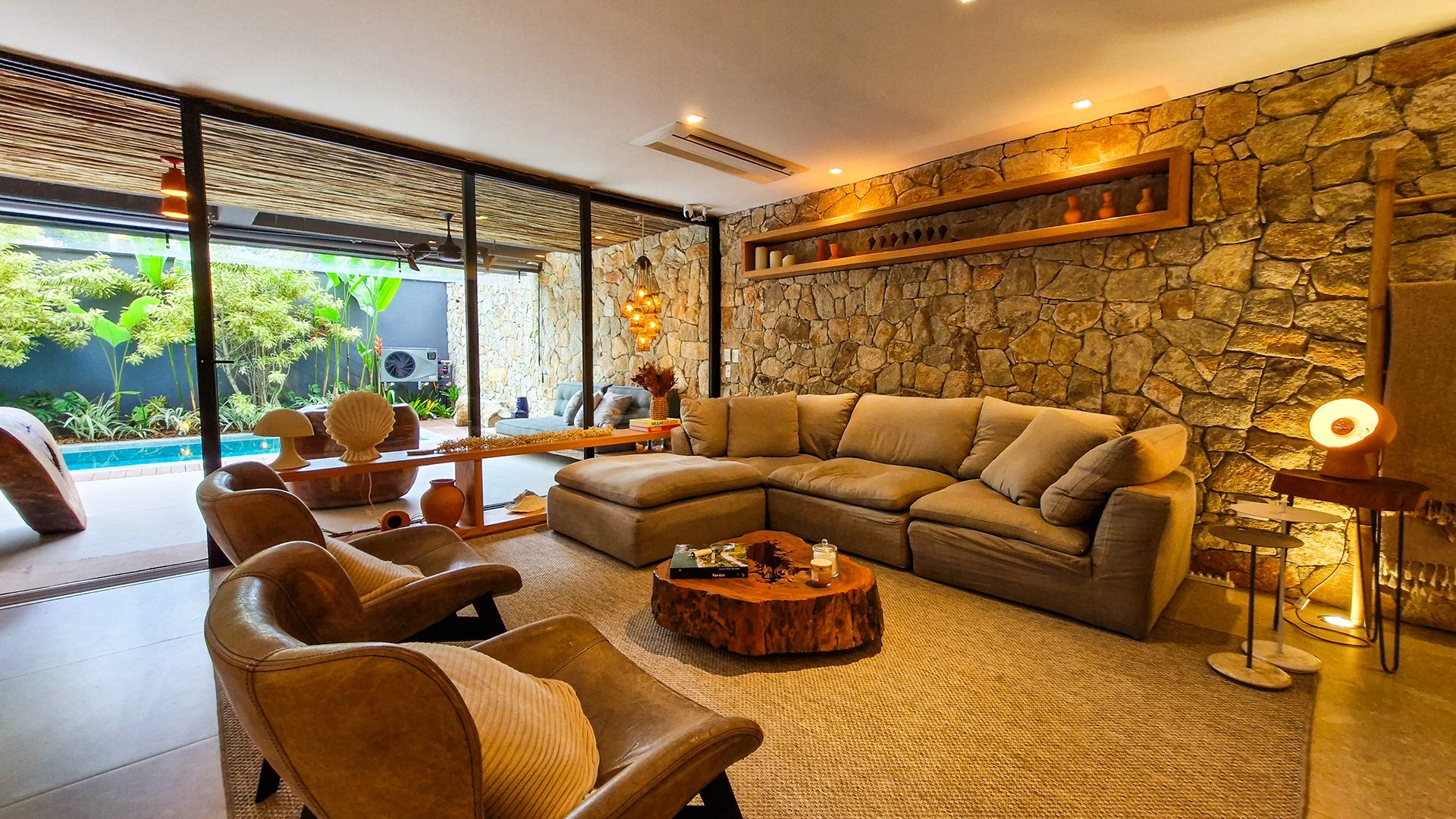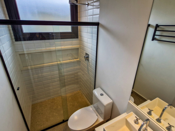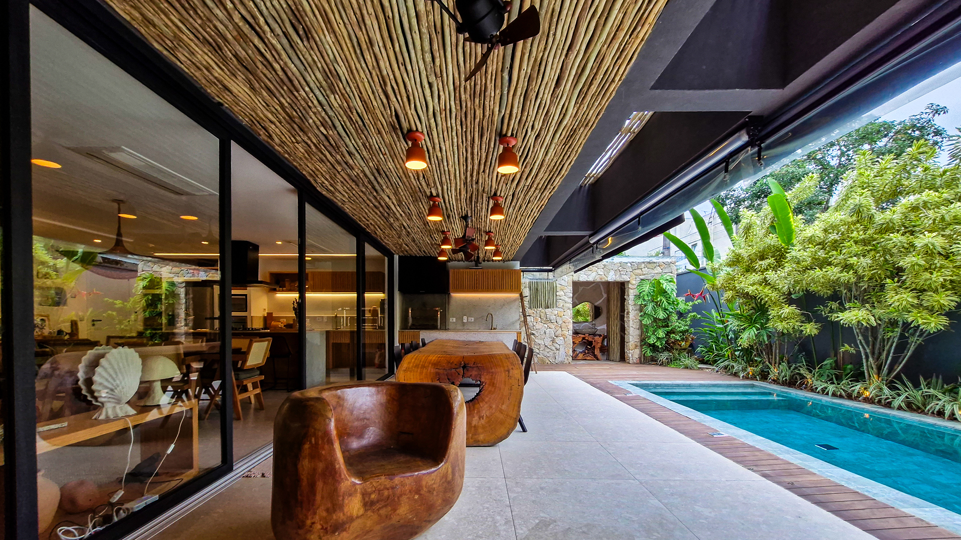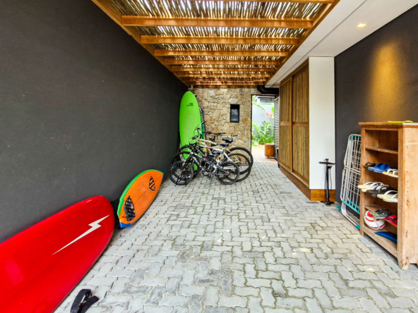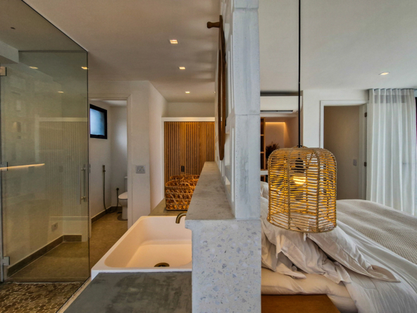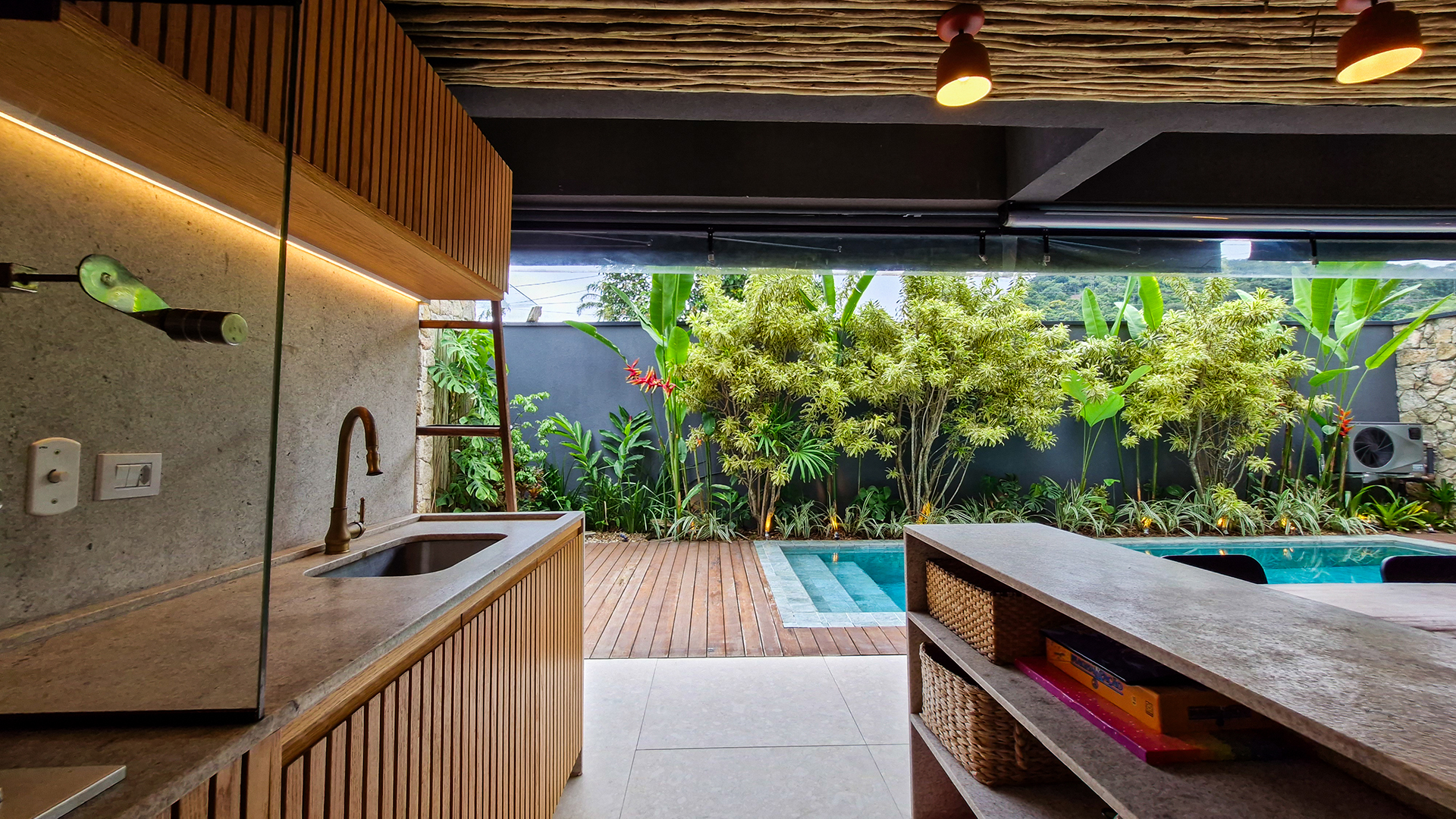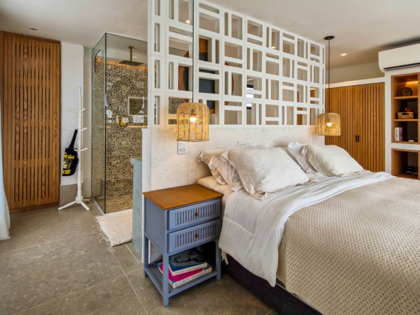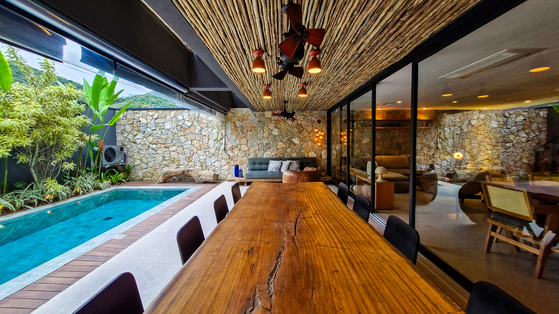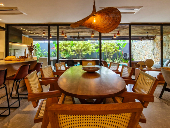 A área externa é um verdadeiro refúgio privativo: piscina com sistema de aquecimento por troca de calor e tratamento salinizado, envolta por paisagismo tropical exuberante. O espaço conta ainda com vestiário completo, ducha e lavabo externo, trazendo praticidade total para momentos de lazer.