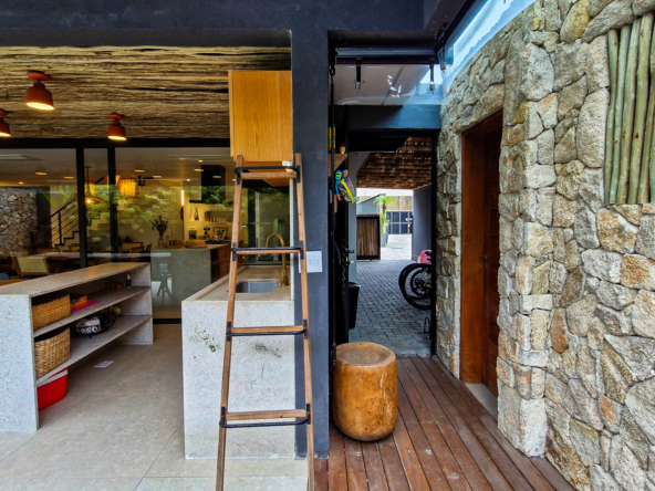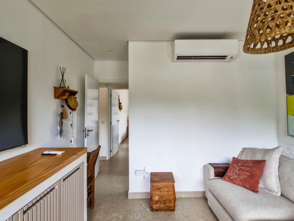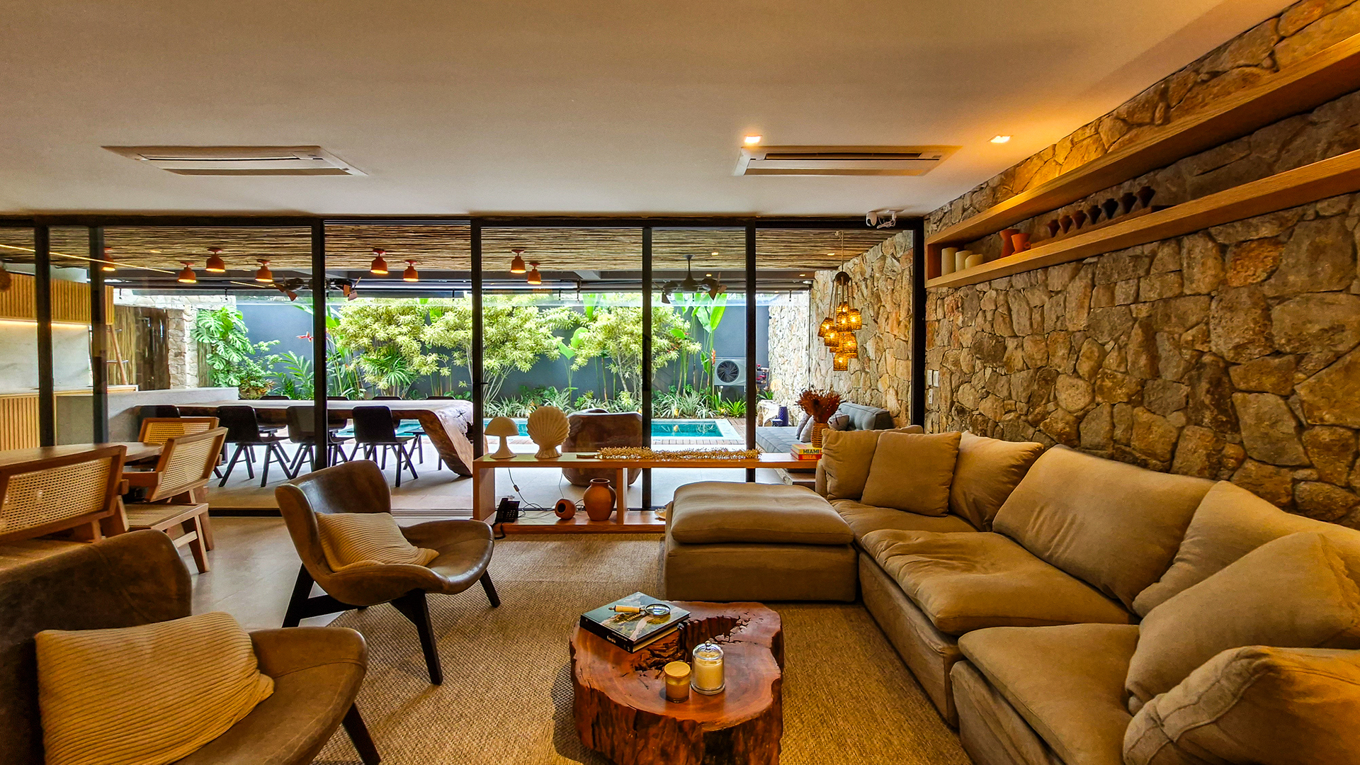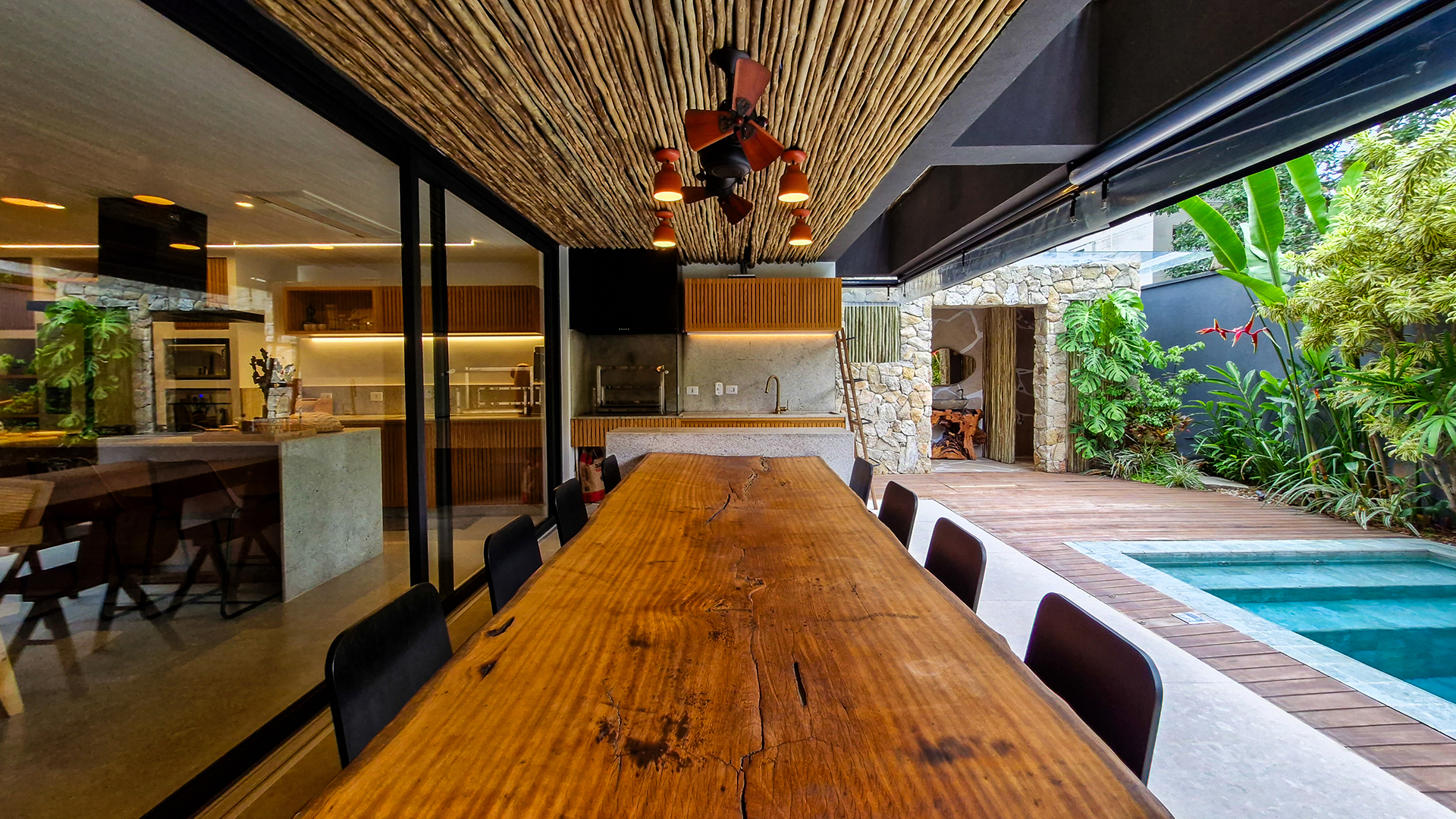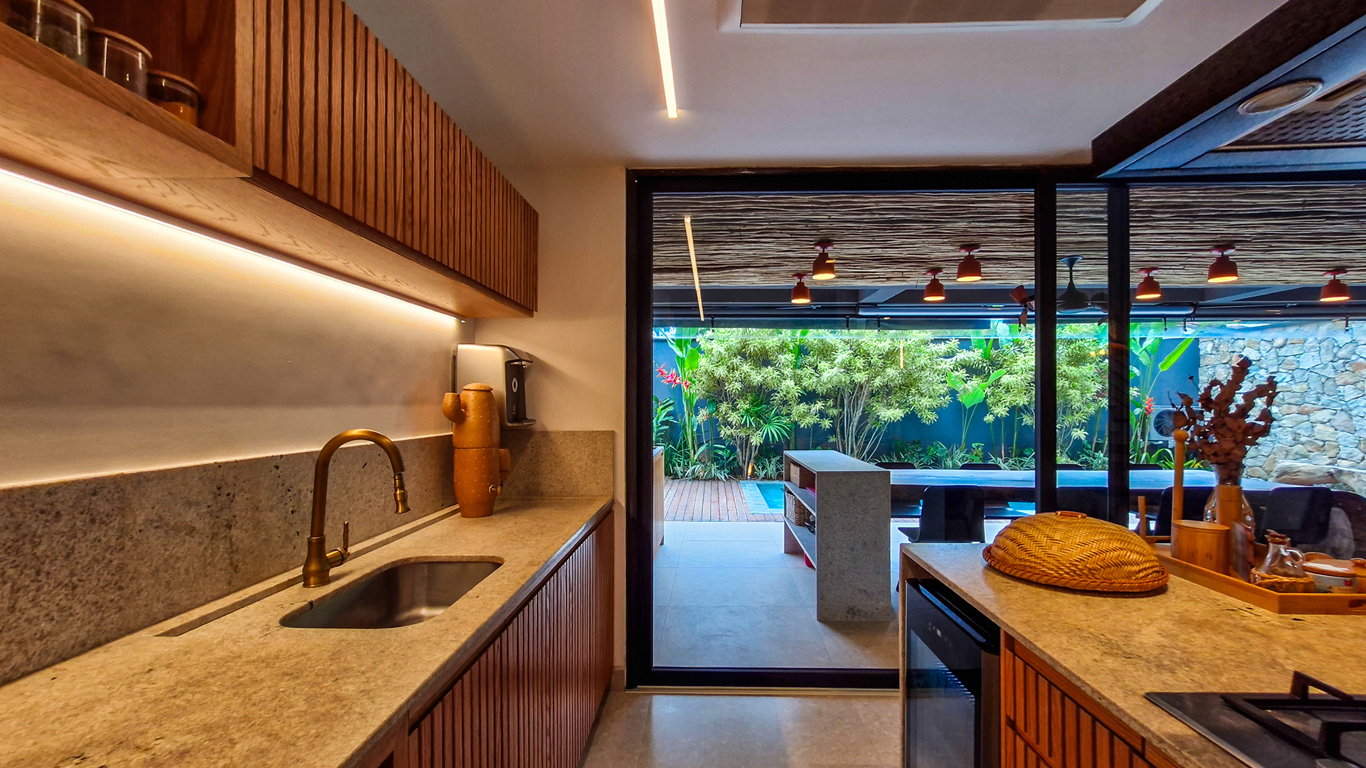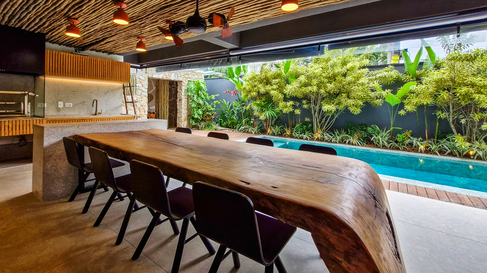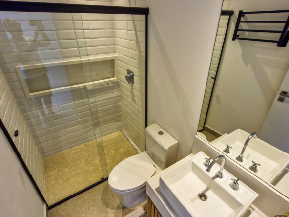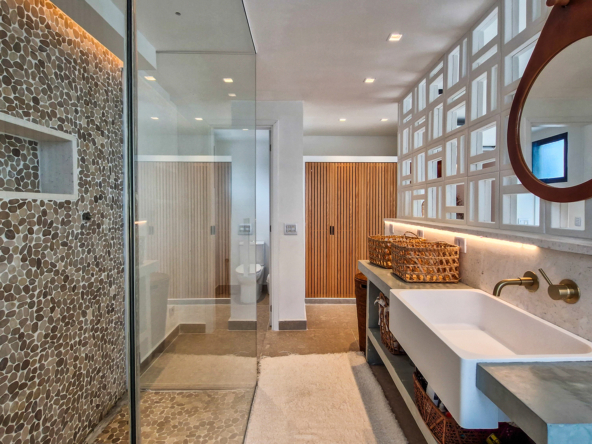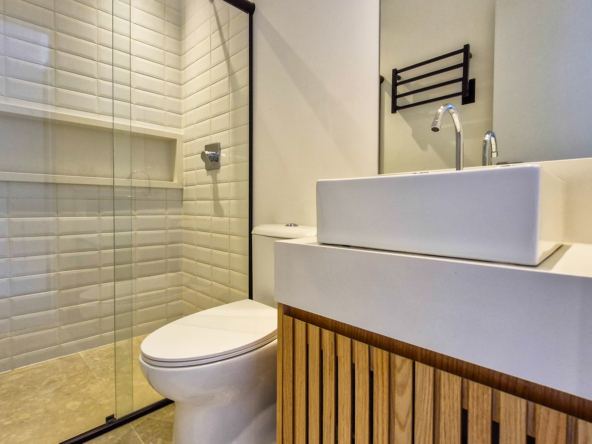 A área externa é um verdadeiro refúgio privativo: piscina com sistema de aquecimento por troca de calor e tratamento salinizado, envolta por paisagismo tropical exuberante. O espaço conta ainda com vestiário completo, ducha e lavabo externo, trazendo praticidade total para momentos de lazer.