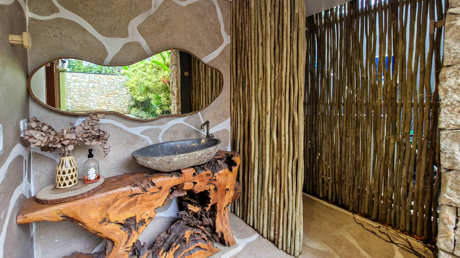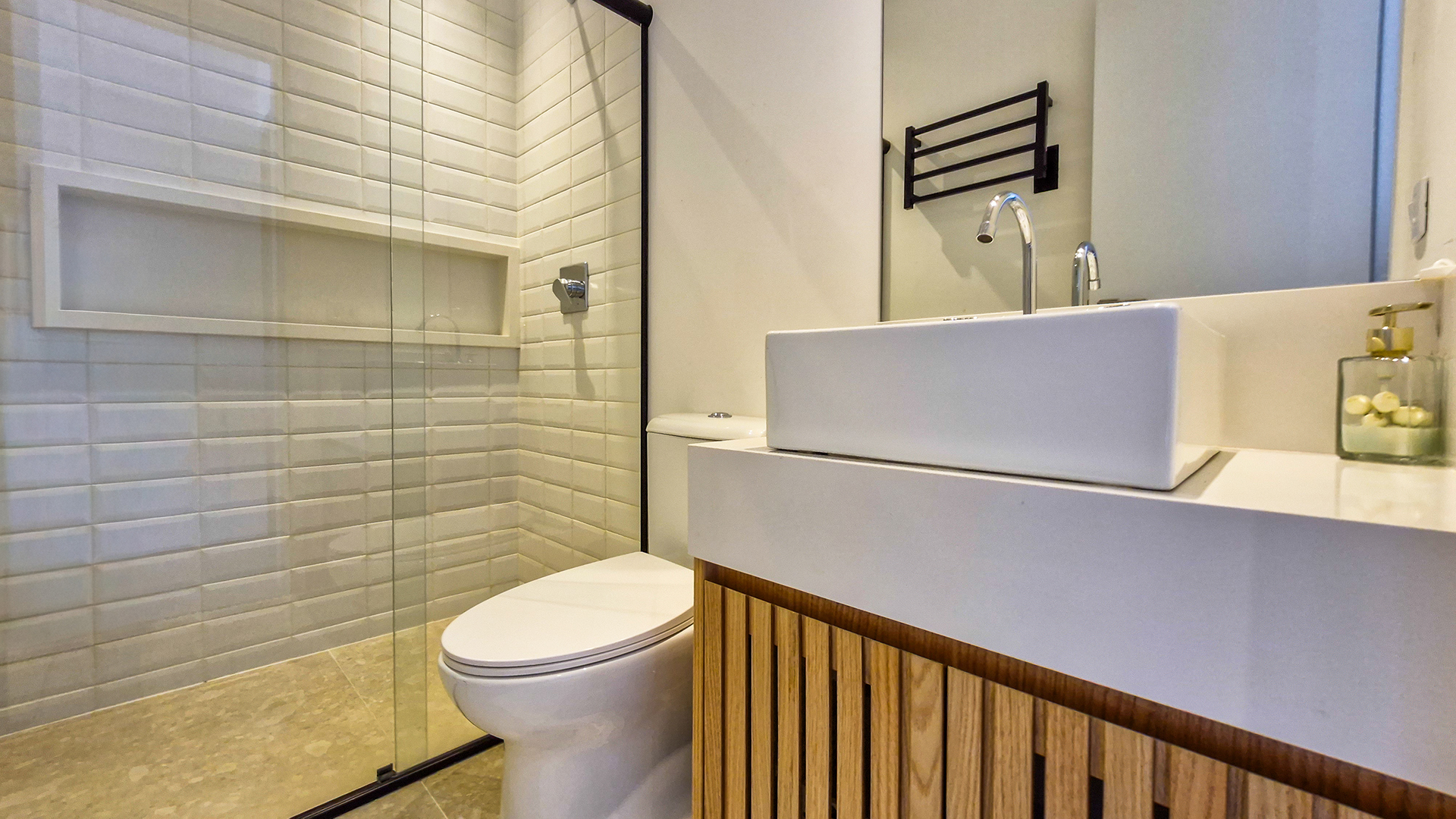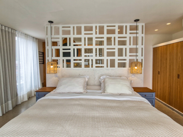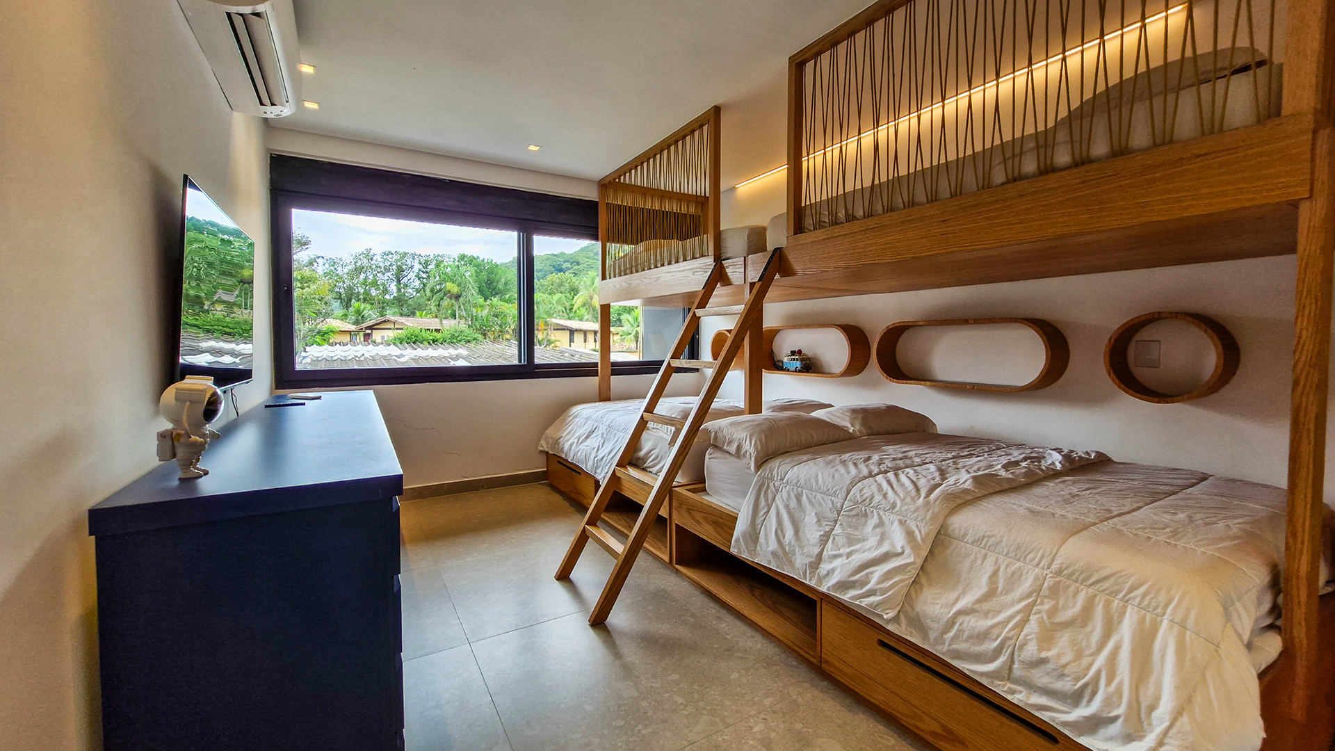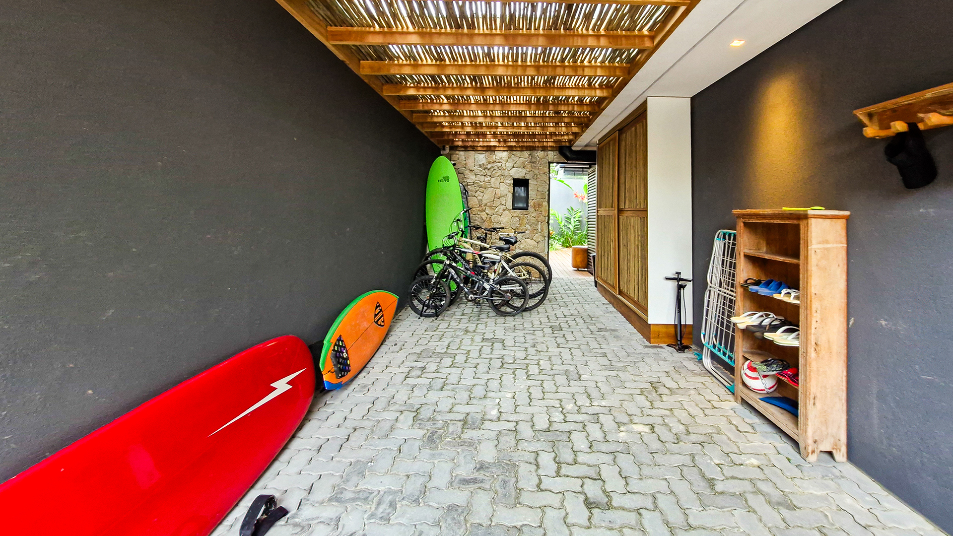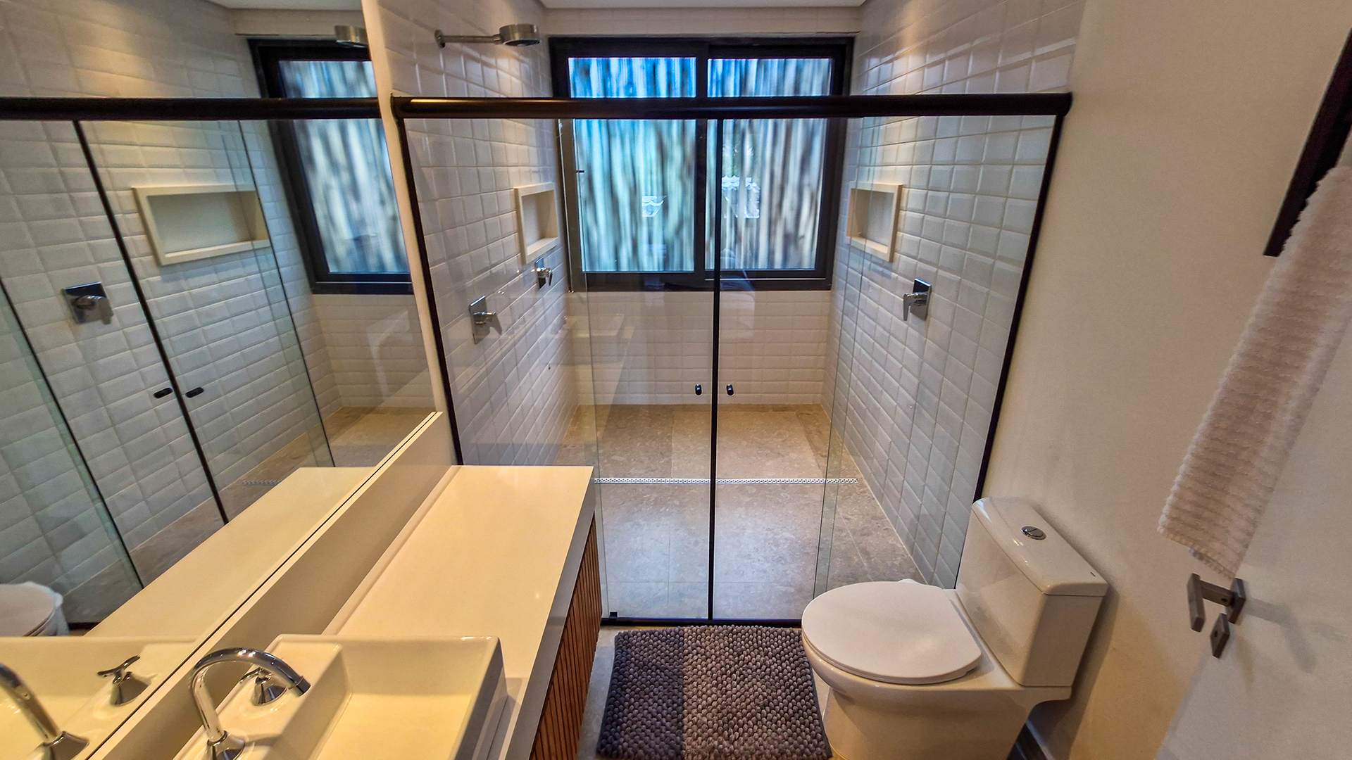 A área externa é um verdadeiro refúgio privativo: piscina com sistema de aquecimento por troca de calor e tratamento salinizado, envolta por paisagismo tropical exuberante. O espaço conta ainda com vestiário completo, ducha e lavabo externo, trazendo praticidade total para momentos de lazer.