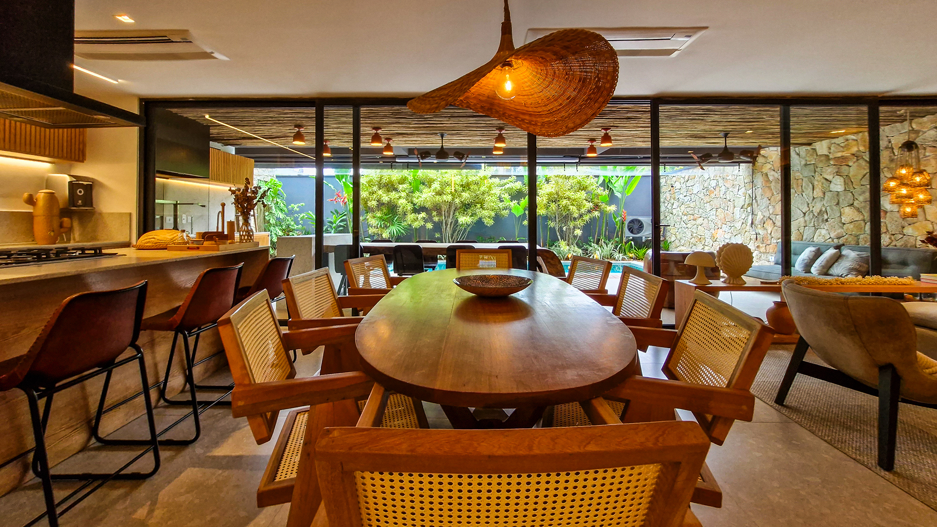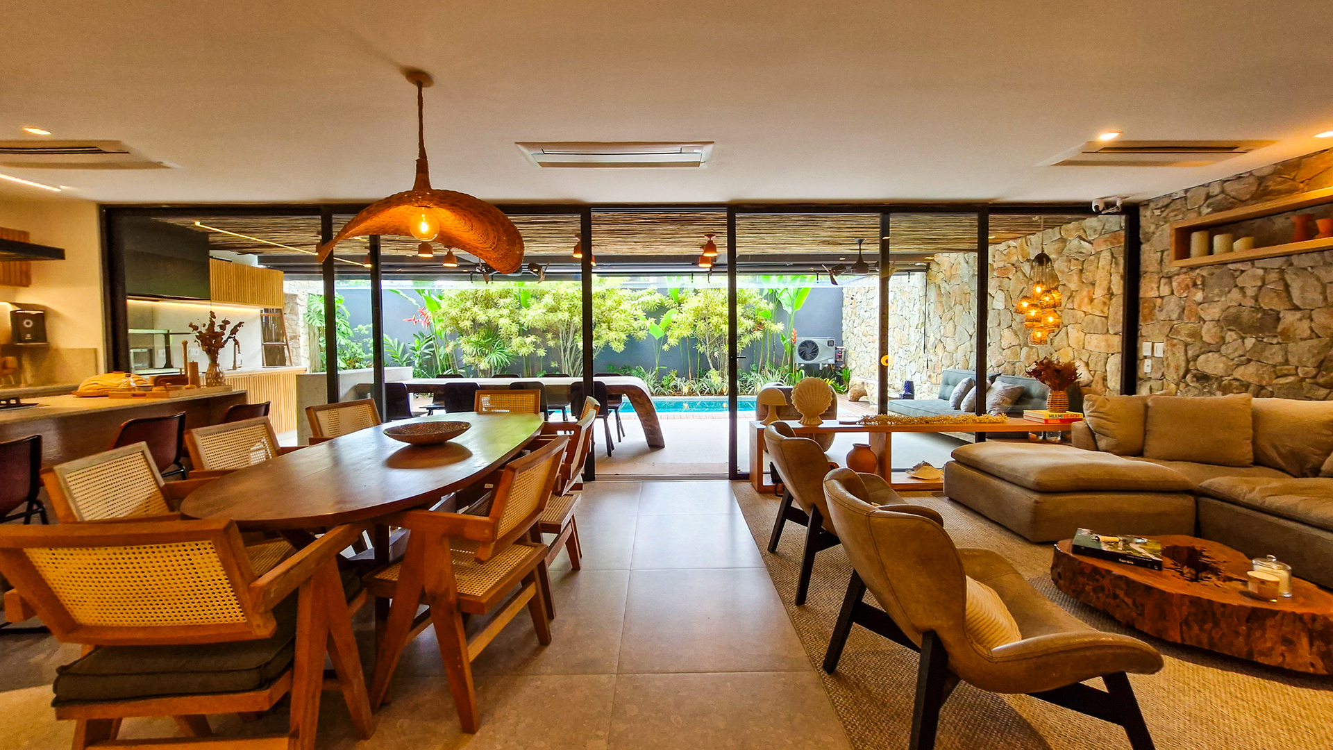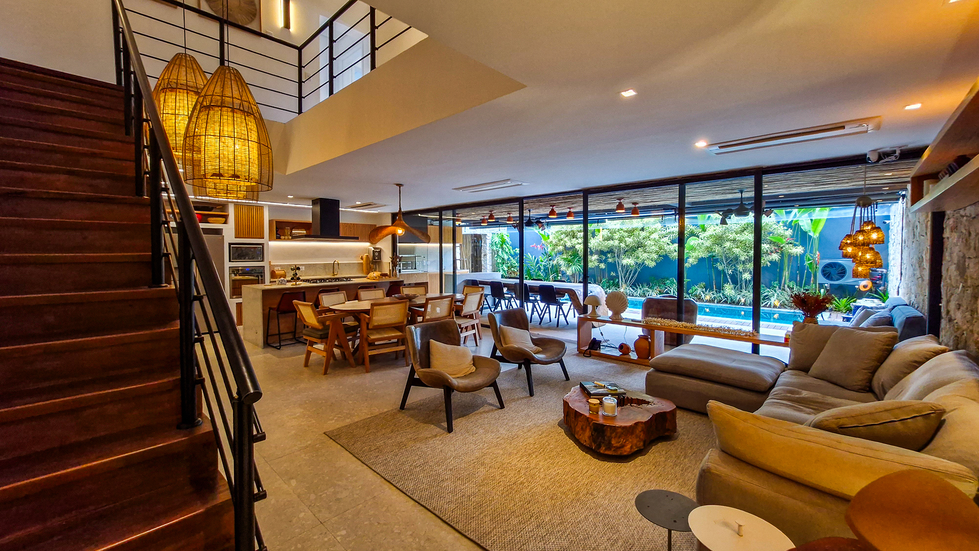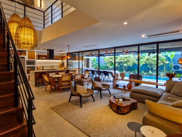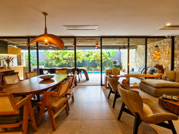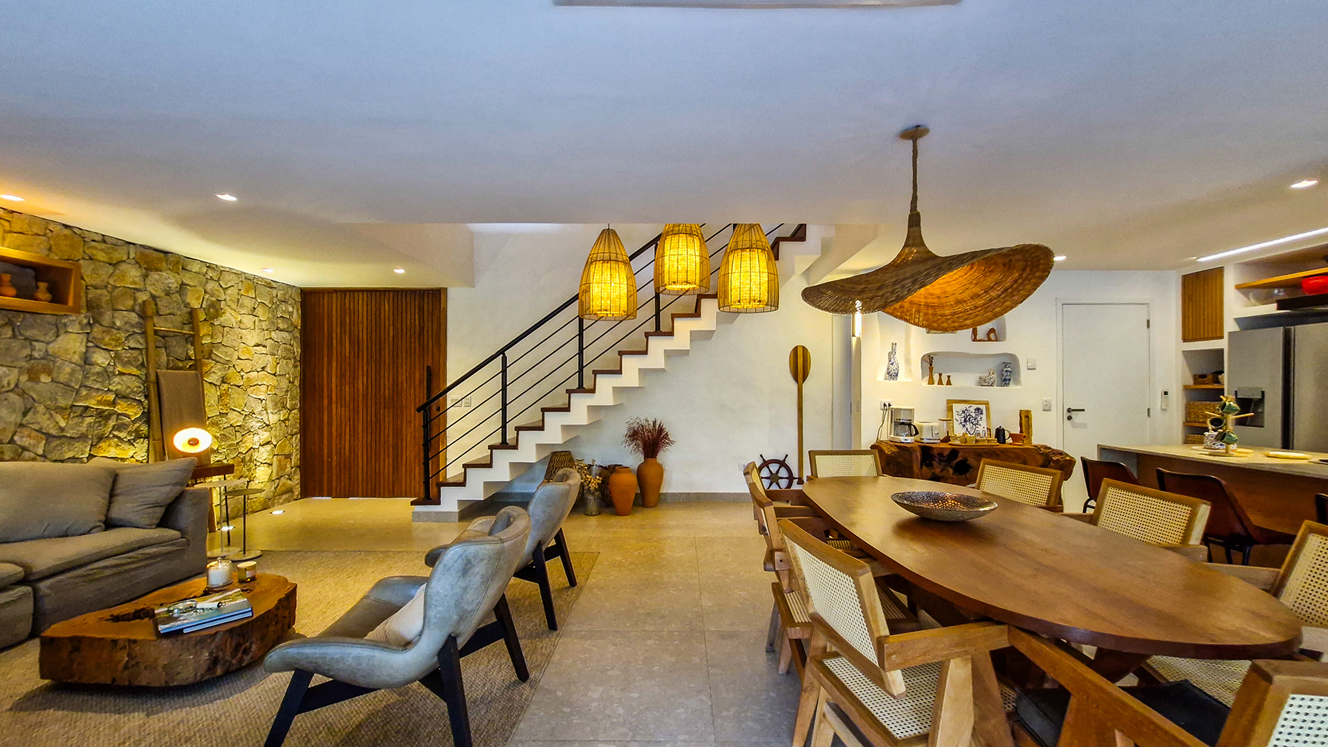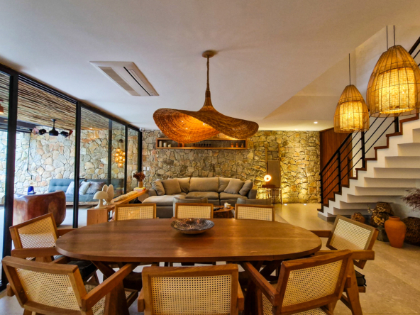 Logo na entrada, a arquitetura contemporânea com elementos naturais já antecipa o padrão elevado. Internamente, o projeto valoriza o conceito aberto: sala de estar, jantar e cozinha formam um ambiente amplo e integrado, complementado por lavabo interno e uma fluidez perfeita para o dia a dia e para receber.