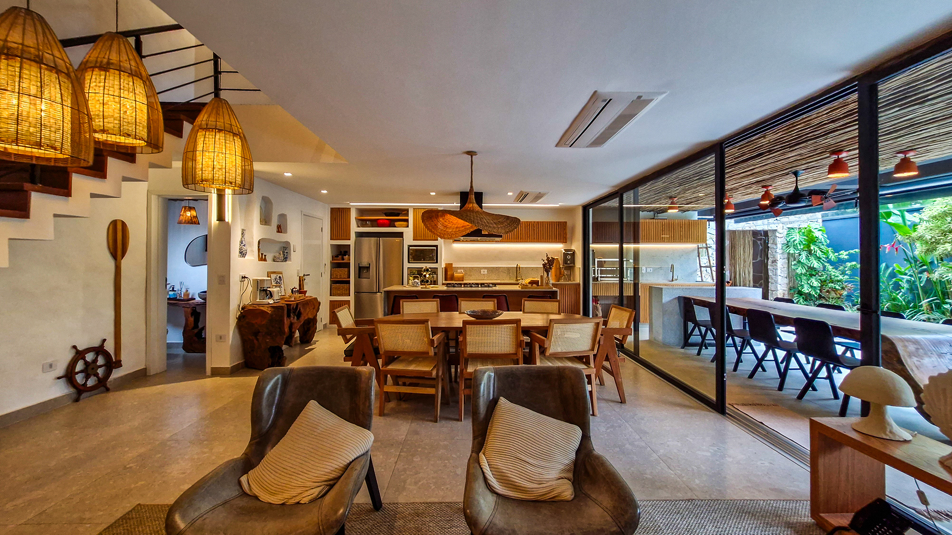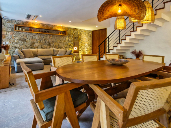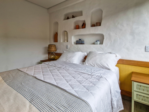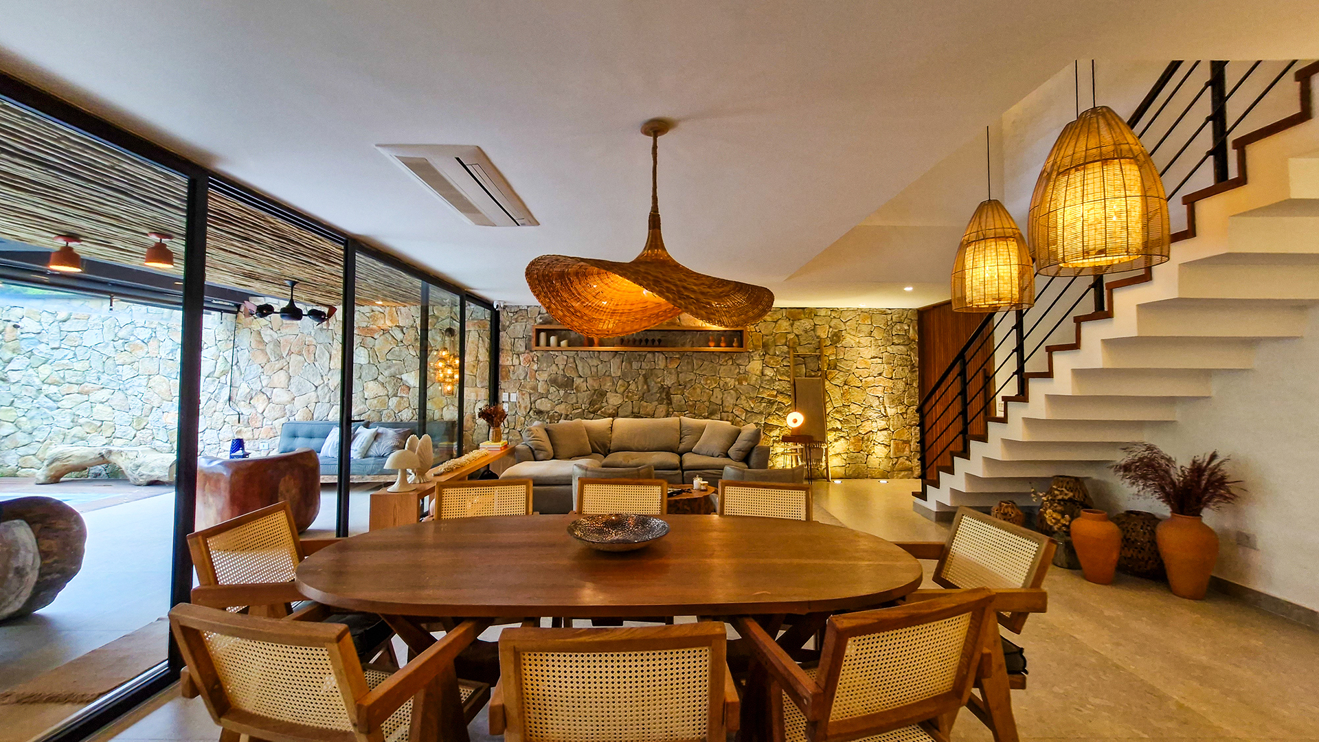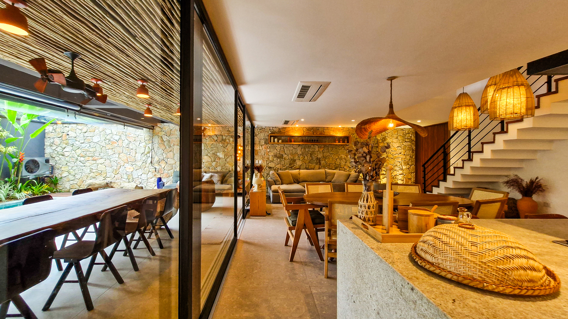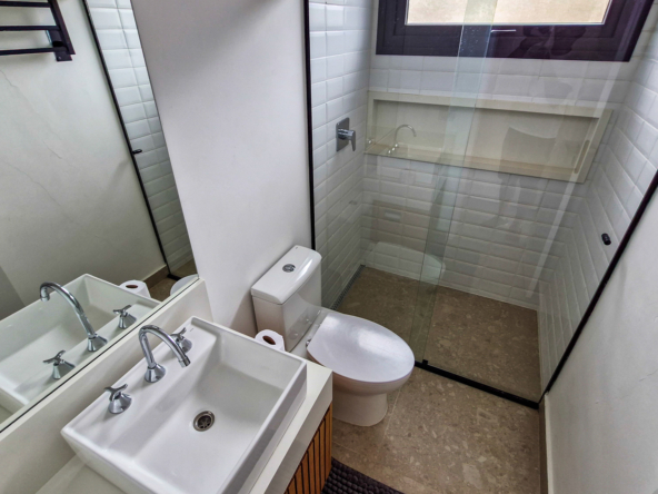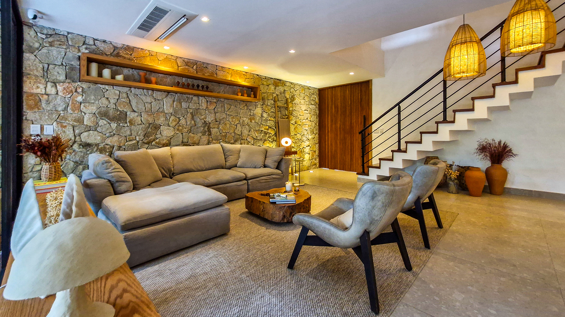 Logo na entrada, a arquitetura contemporânea com elementos naturais já antecipa o padrão elevado. Internamente, o projeto valoriza o conceito aberto: sala de estar, jantar e cozinha formam um ambiente amplo e integrado, complementado por lavabo interno e uma fluidez perfeita para o dia a dia e para receber.