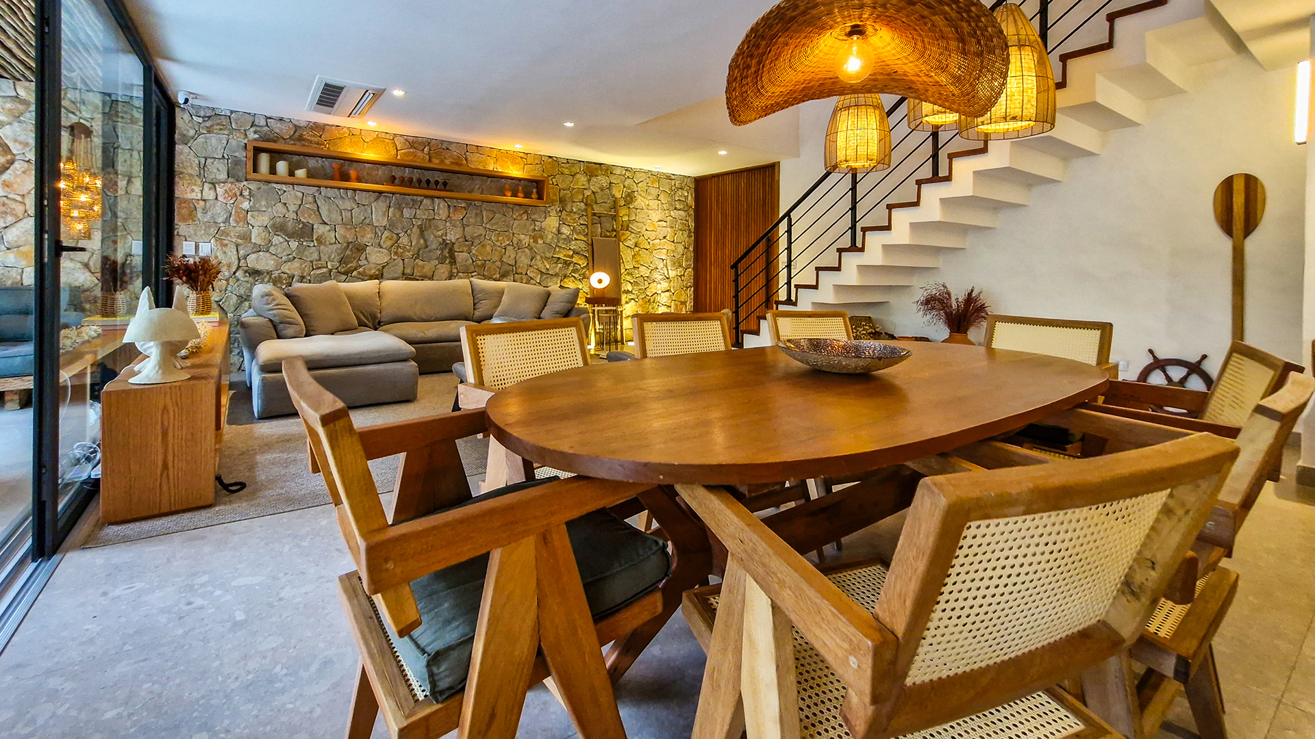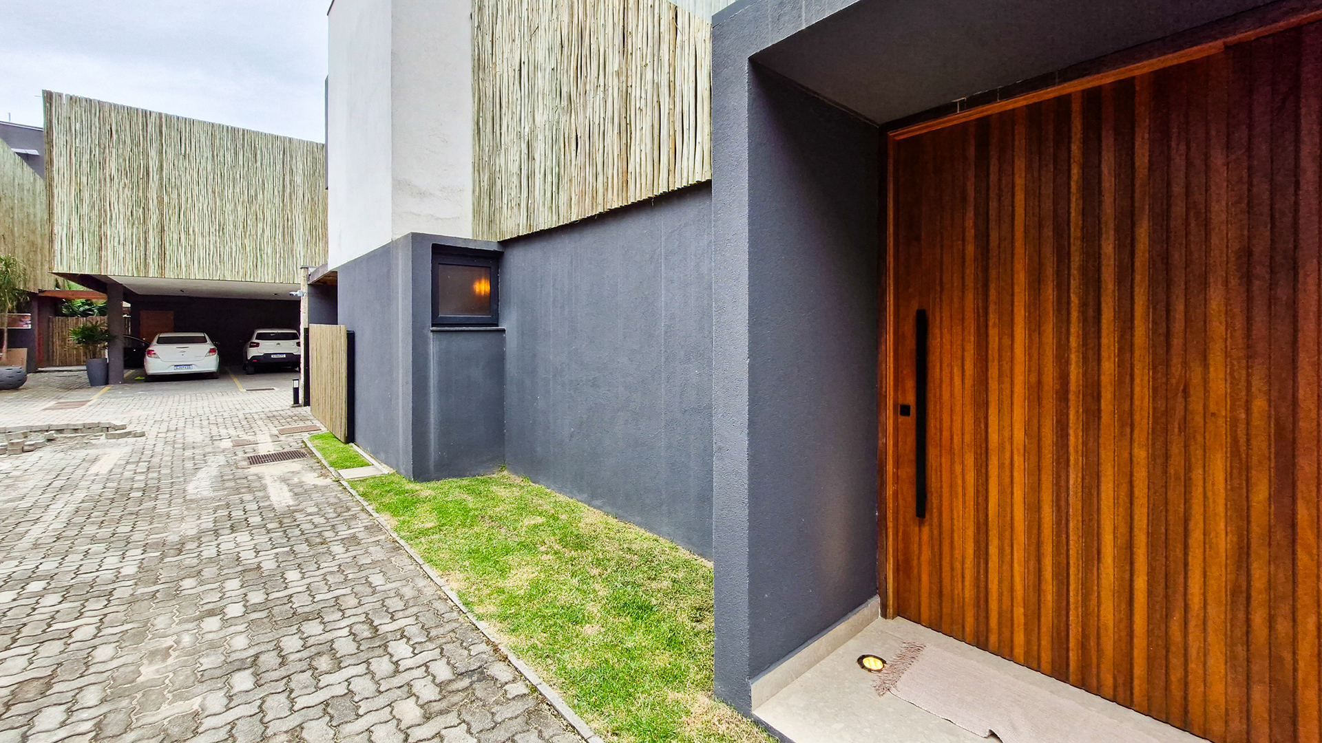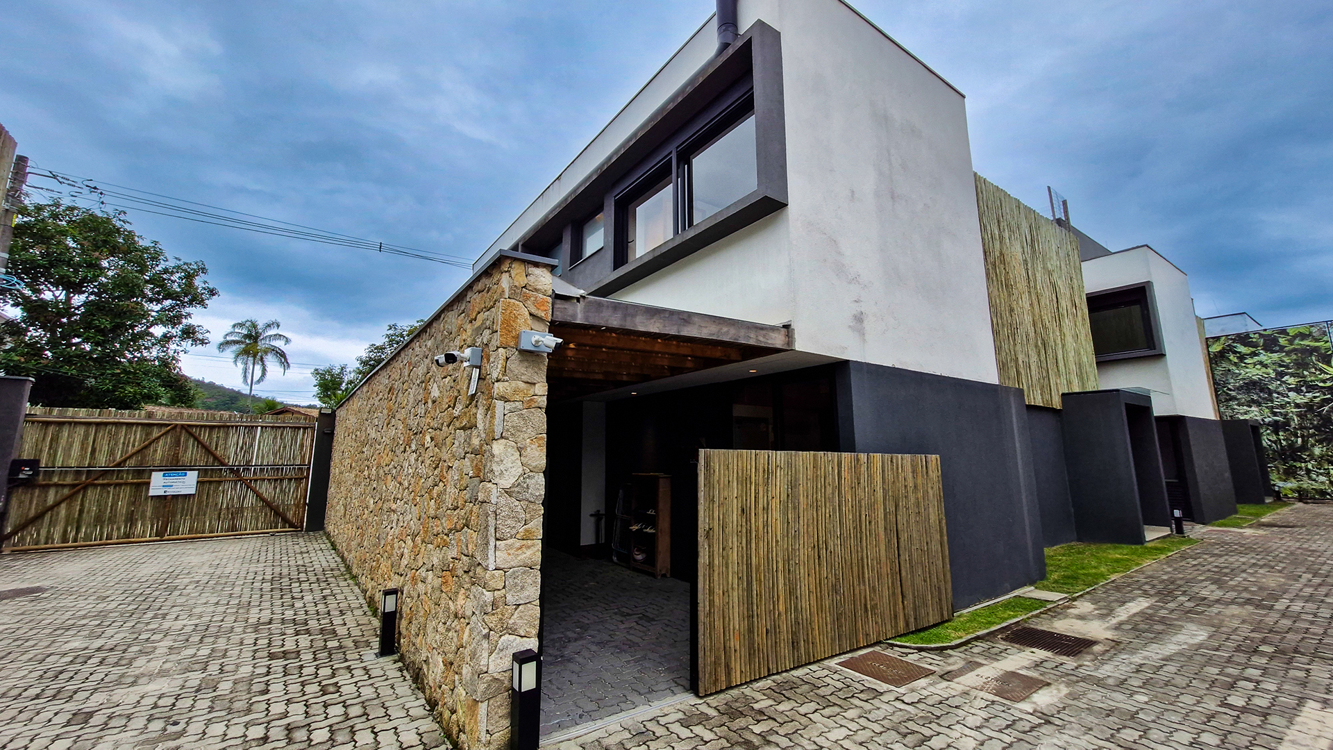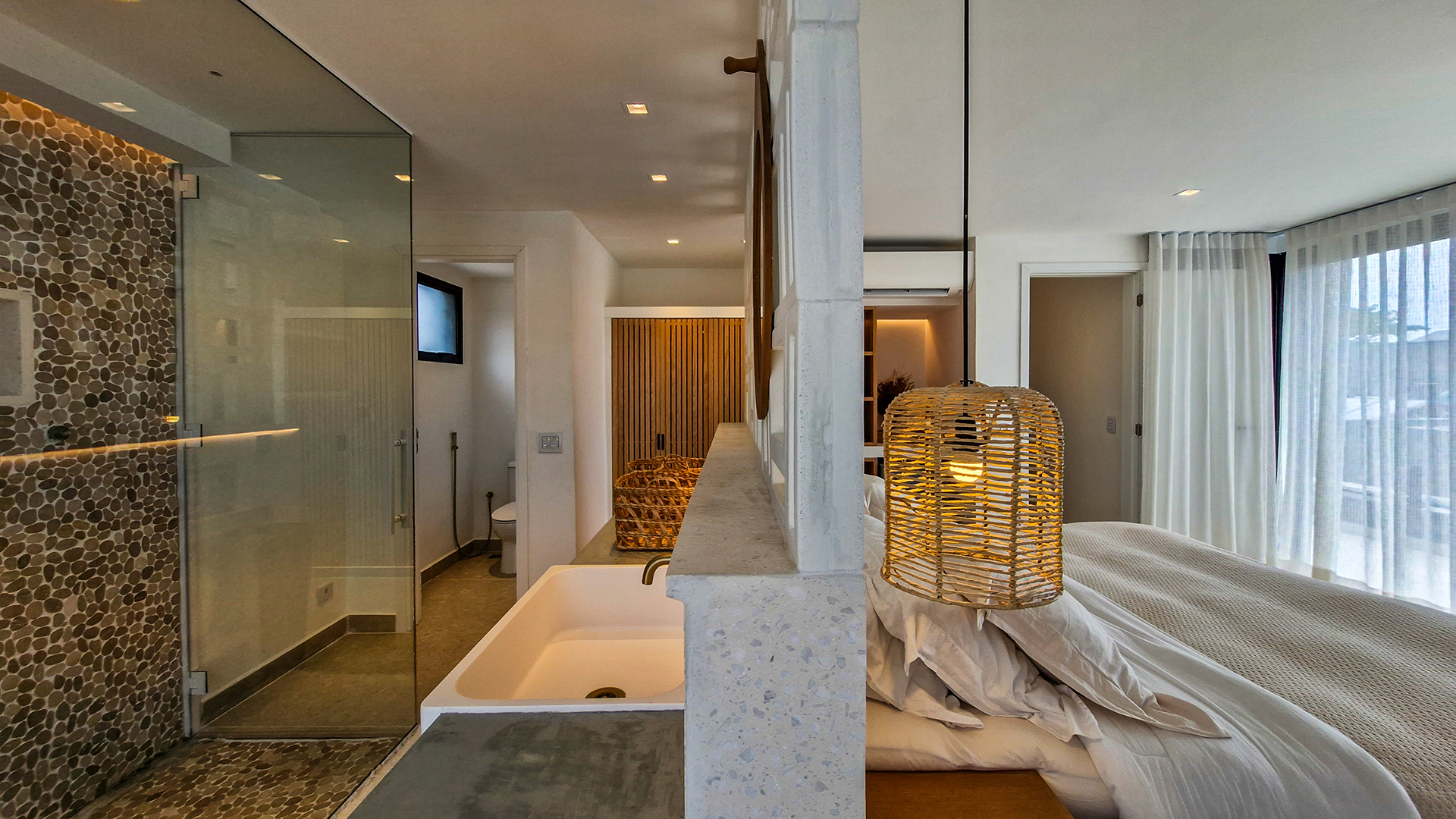 Logo na entrada, a arquitetura contemporânea com elementos naturais já antecipa o padrão elevado. Internamente, o projeto valoriza o conceito aberto: sala de estar, jantar e cozinha formam um ambiente amplo e integrado, complementado por lavabo interno e uma fluidez perfeita para o dia a dia e para receber.