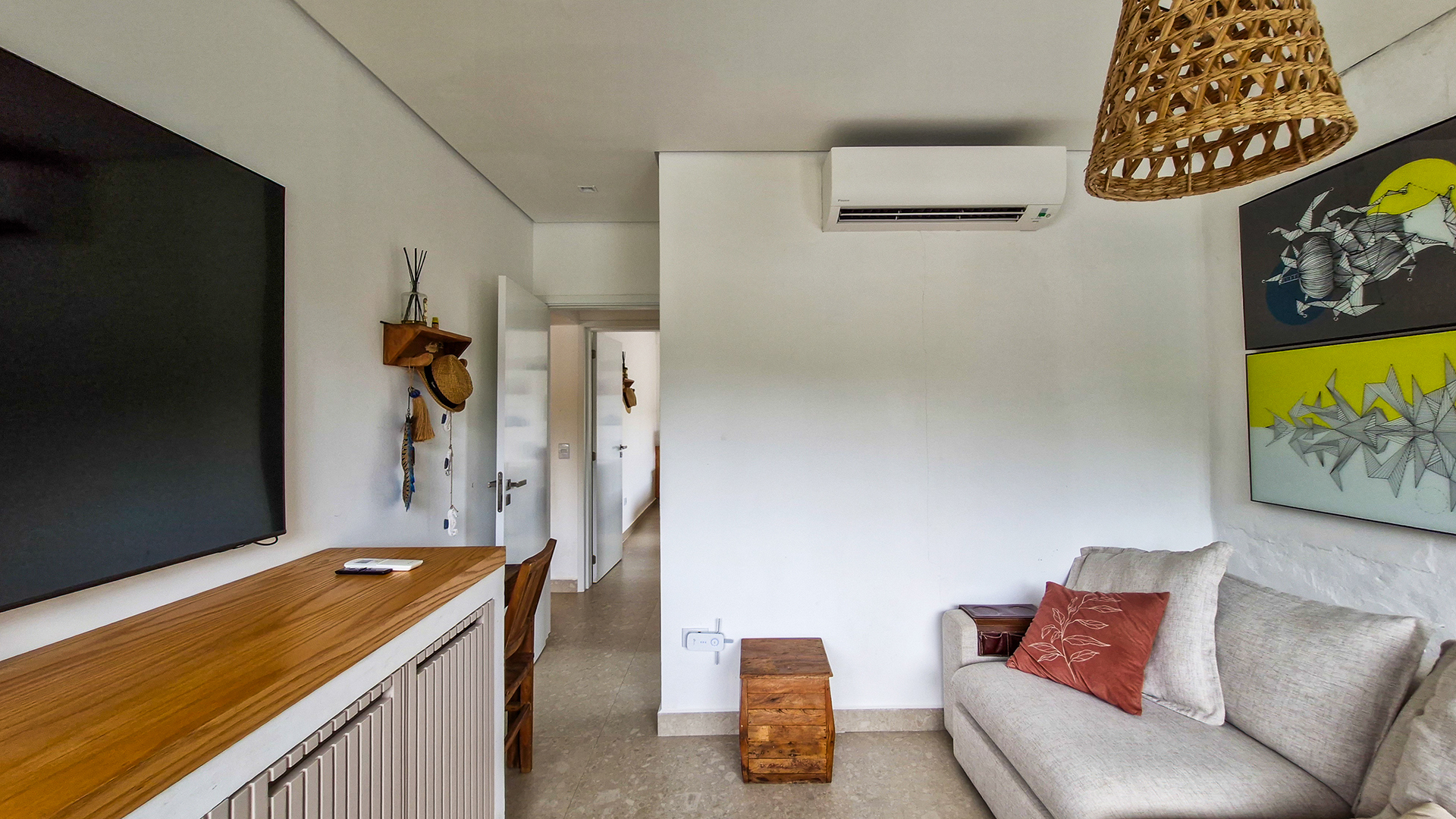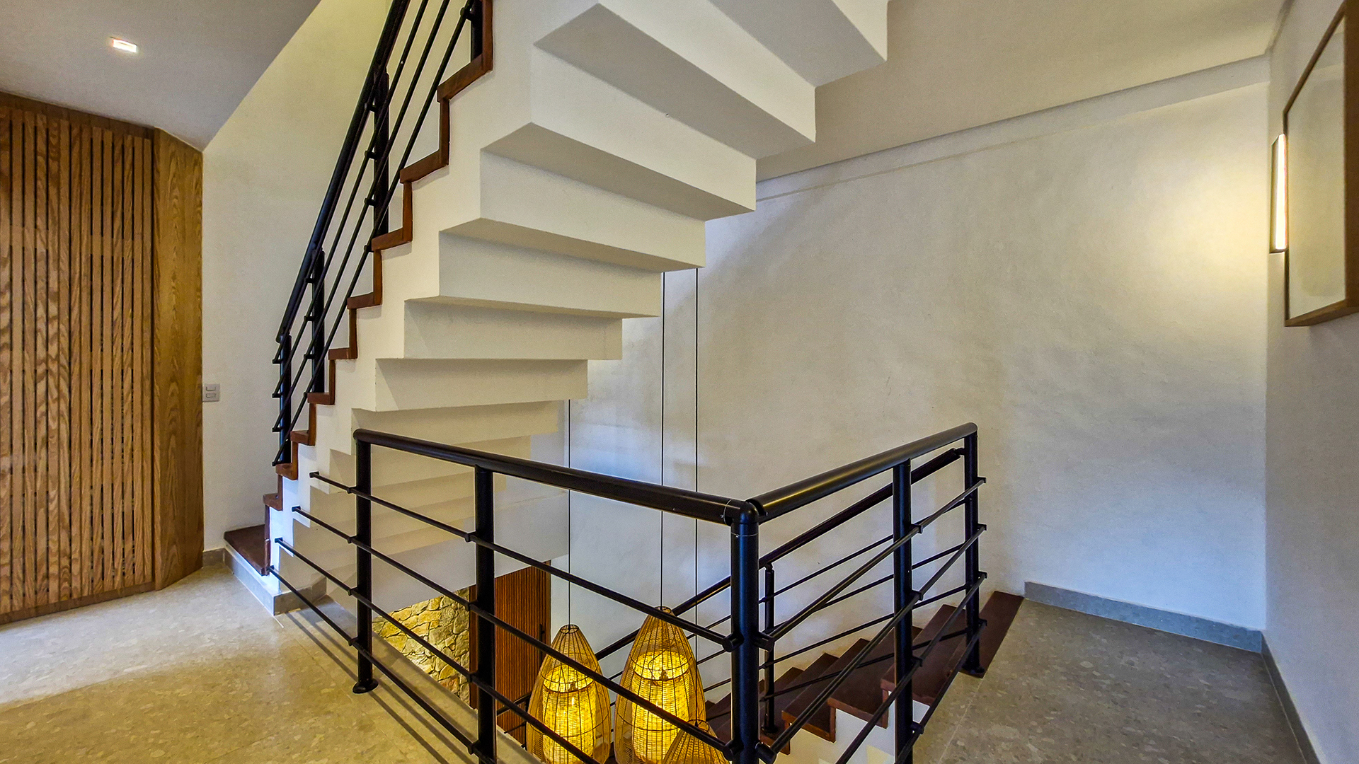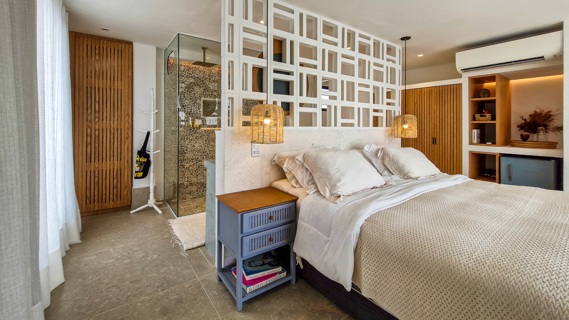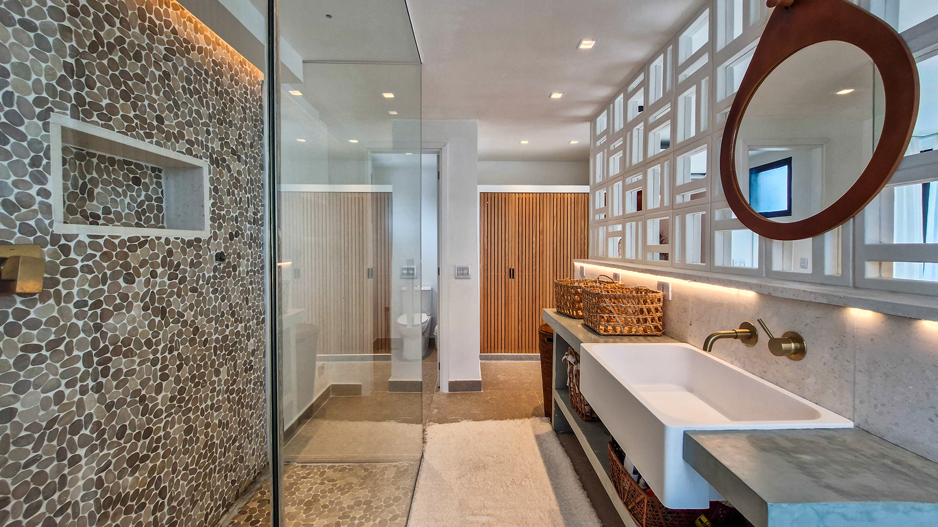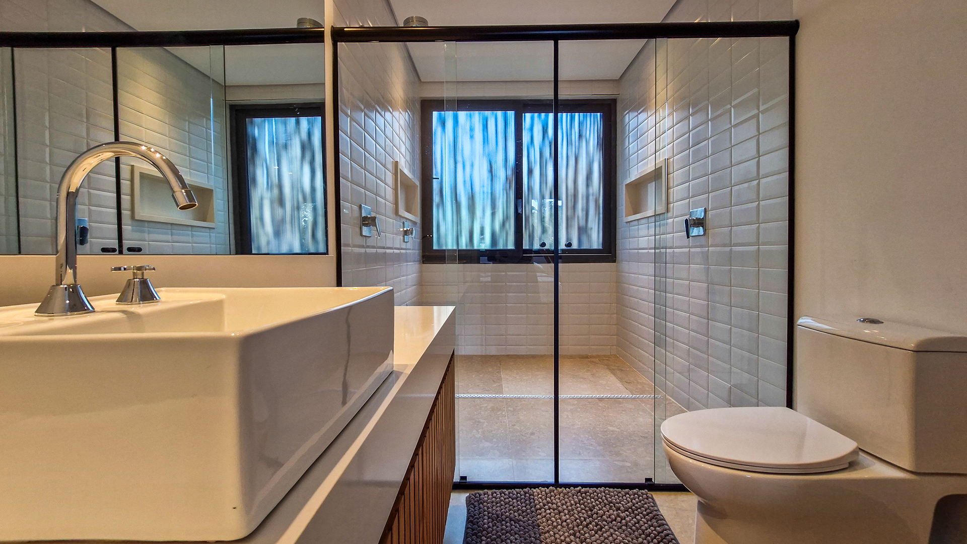 Logo na entrada, a arquitetura contemporânea com elementos naturais já antecipa o padrão elevado. Internamente, o projeto valoriza o conceito aberto: sala de estar, jantar e cozinha formam um ambiente amplo e integrado, complementado por lavabo interno e uma fluidez perfeita para o dia a dia e para receber.
