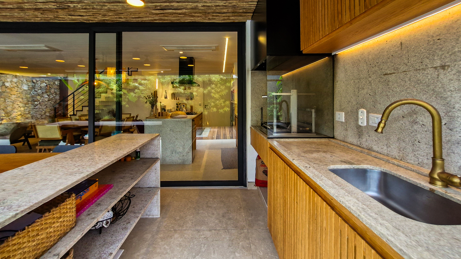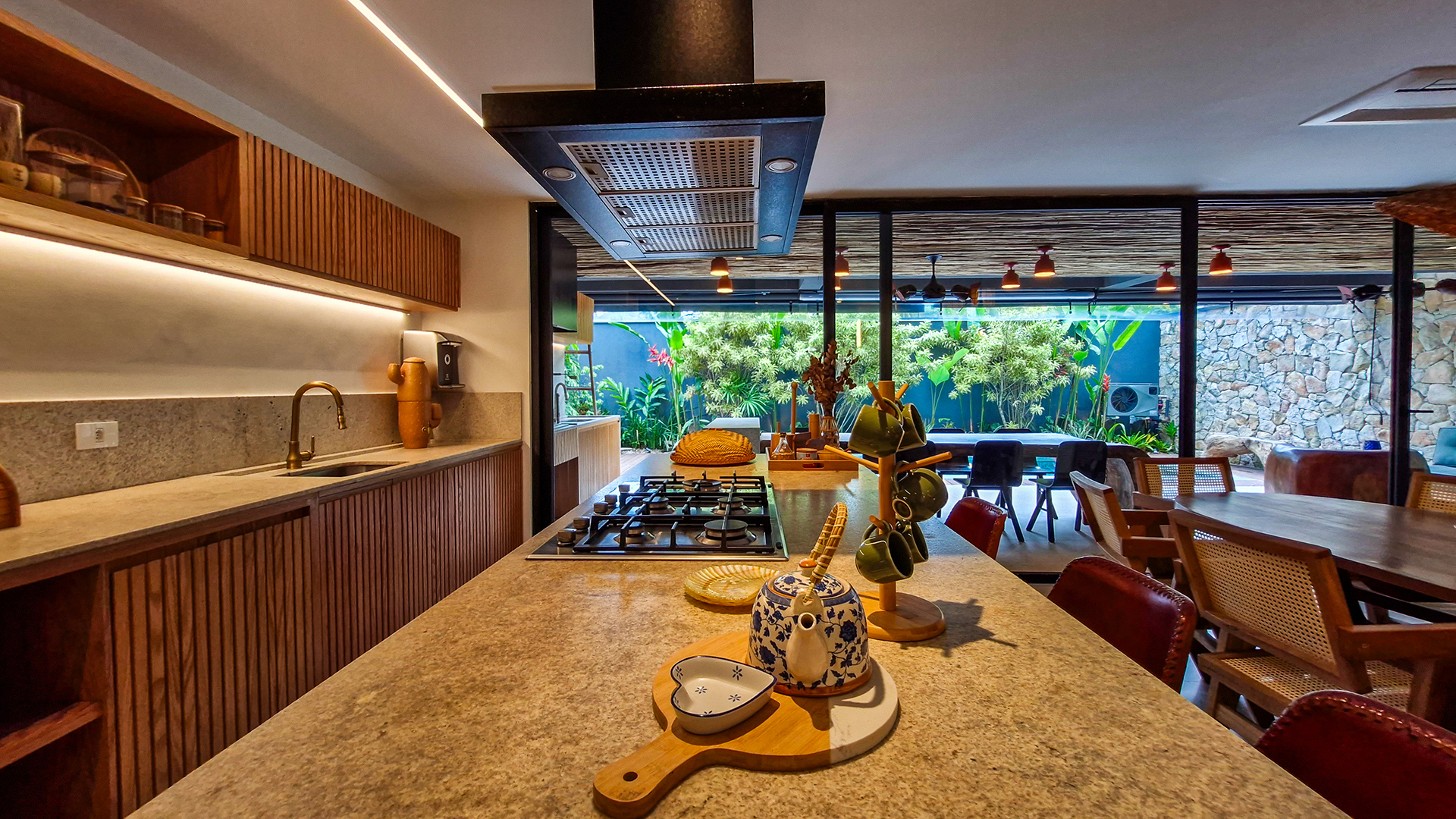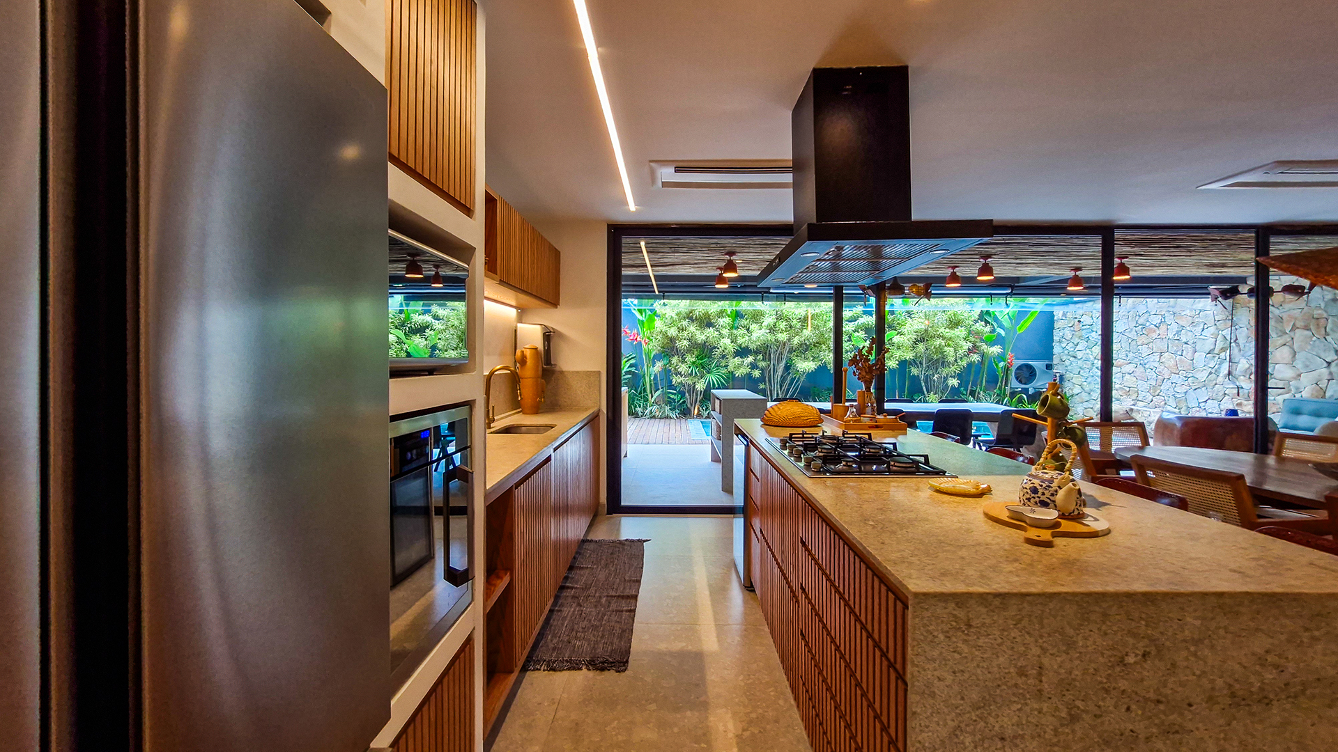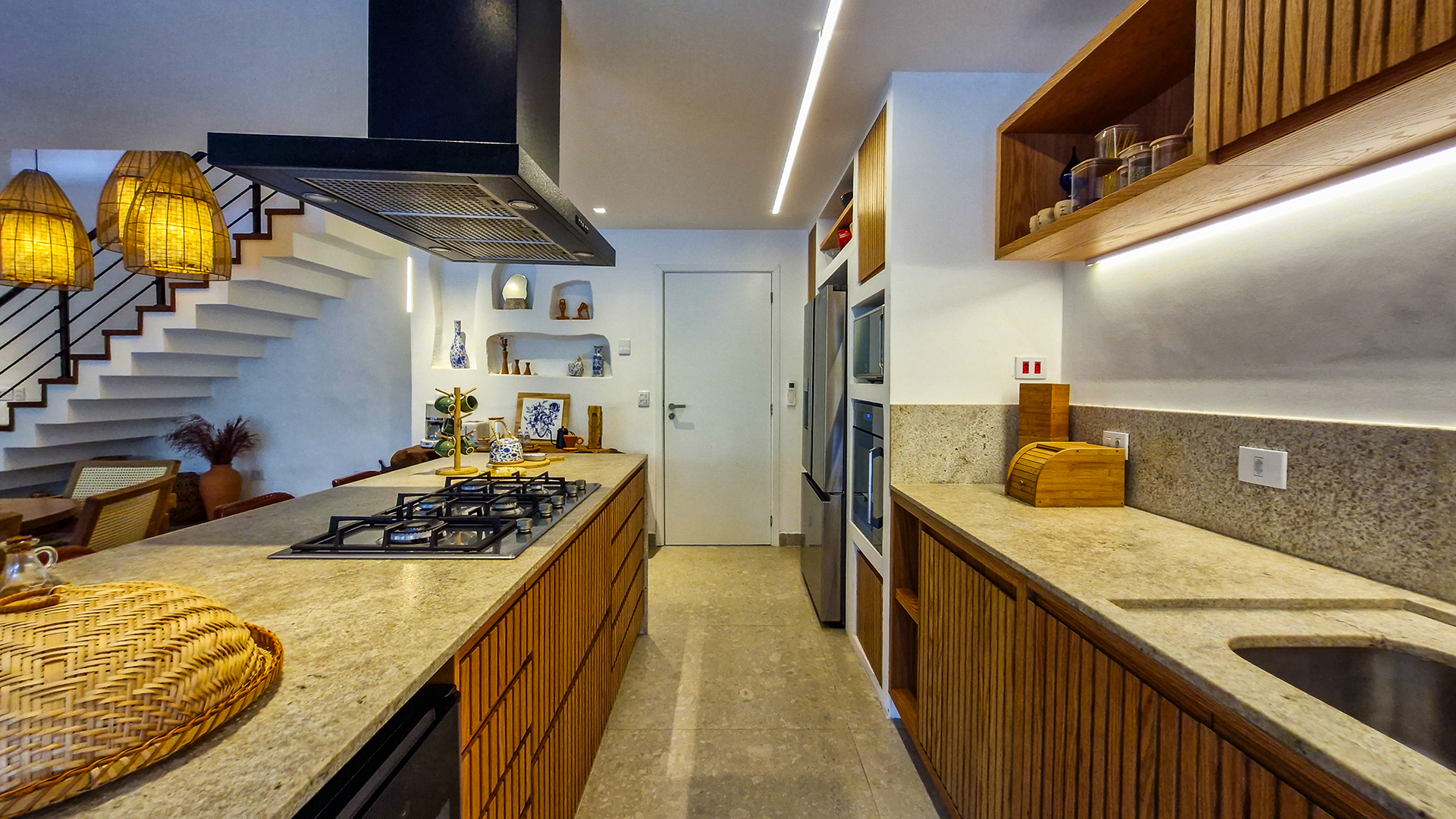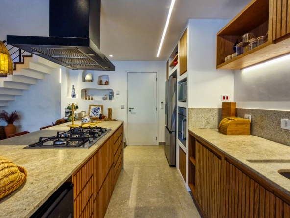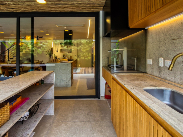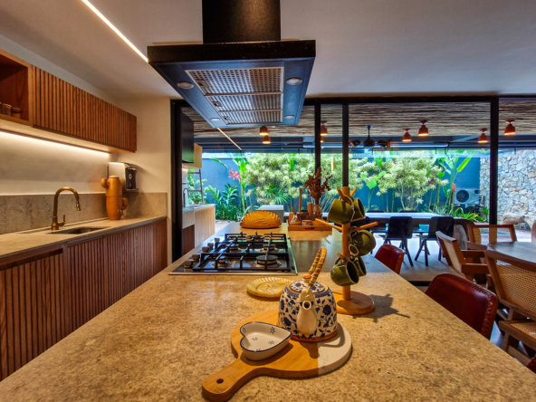 A cozinha e o espaço gourmet são protagonistas, com bancadas, frontões e ilhas em Granito Itaúna escovado, além de exaustores tanto na churrasqueira quanto na ilha — um diferencial técnico importante que garante conforto e eficiência.