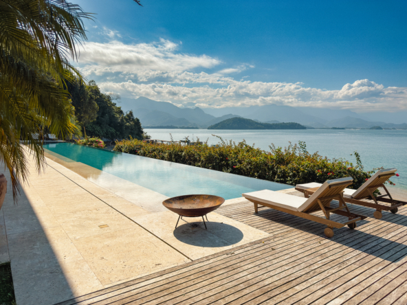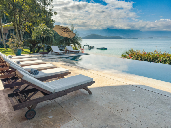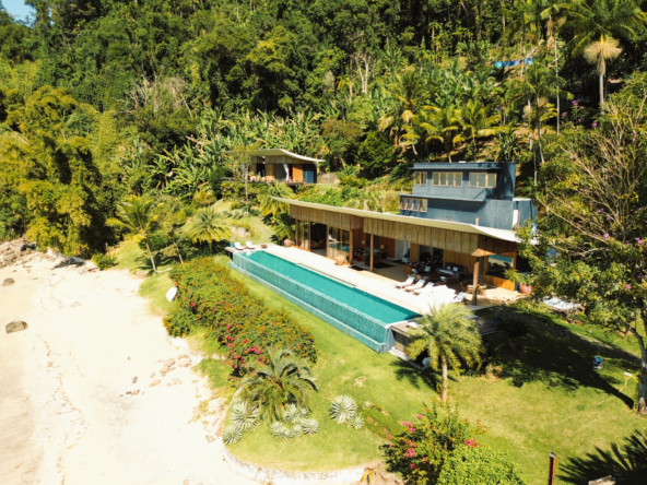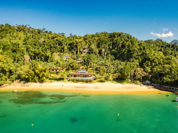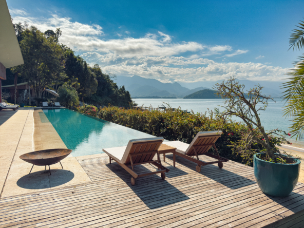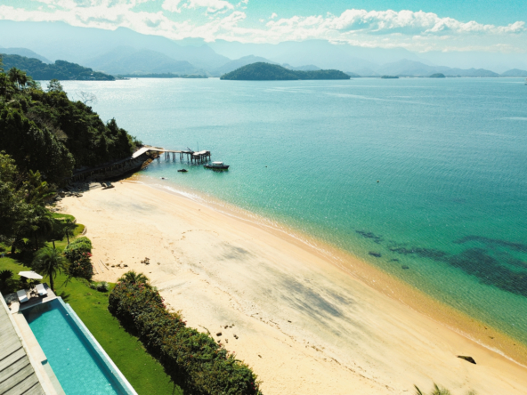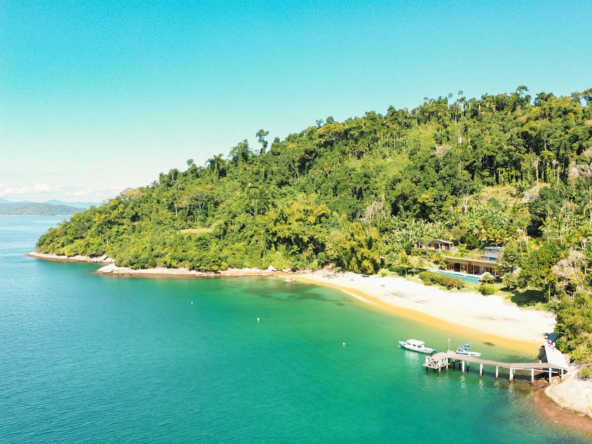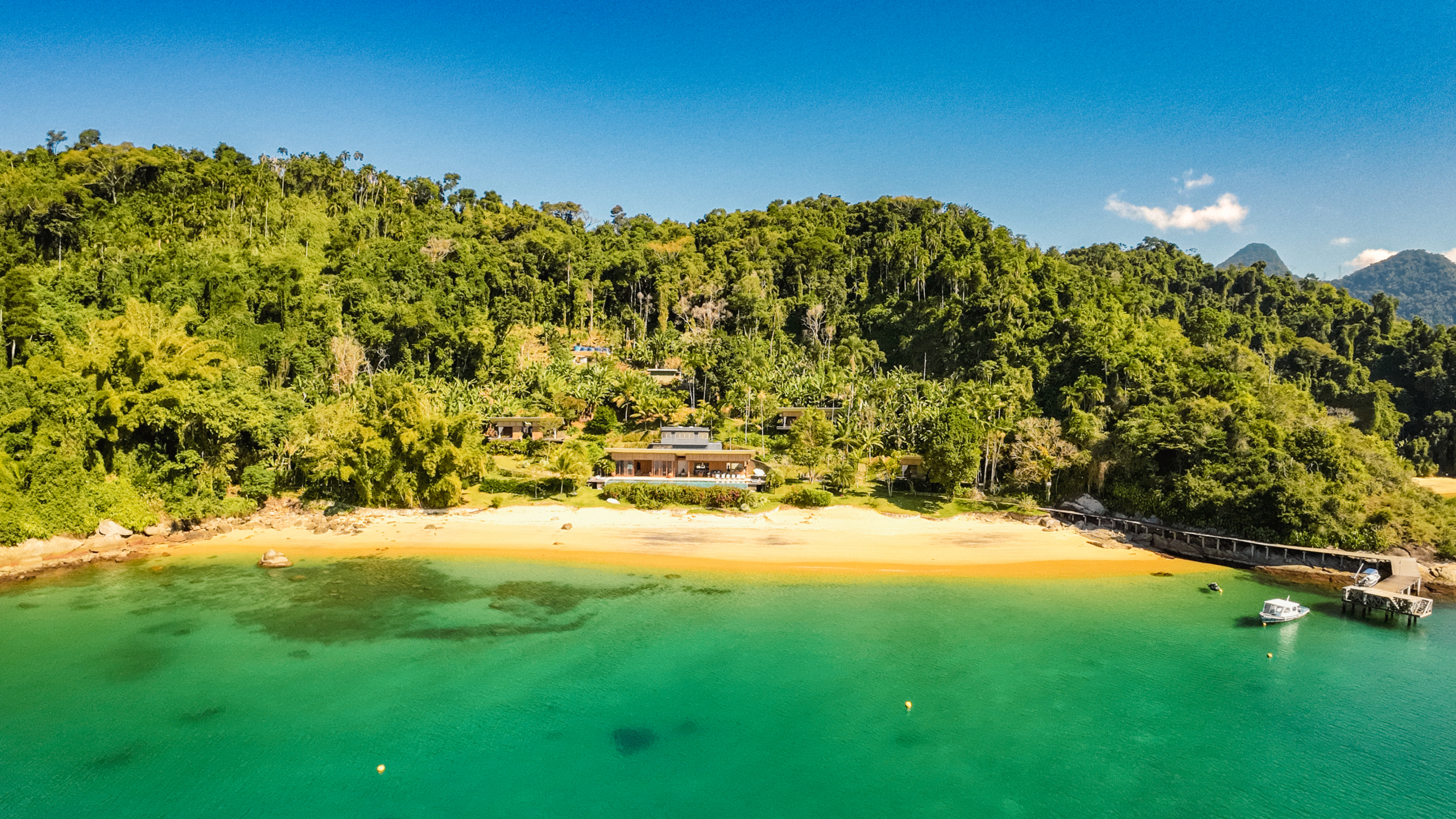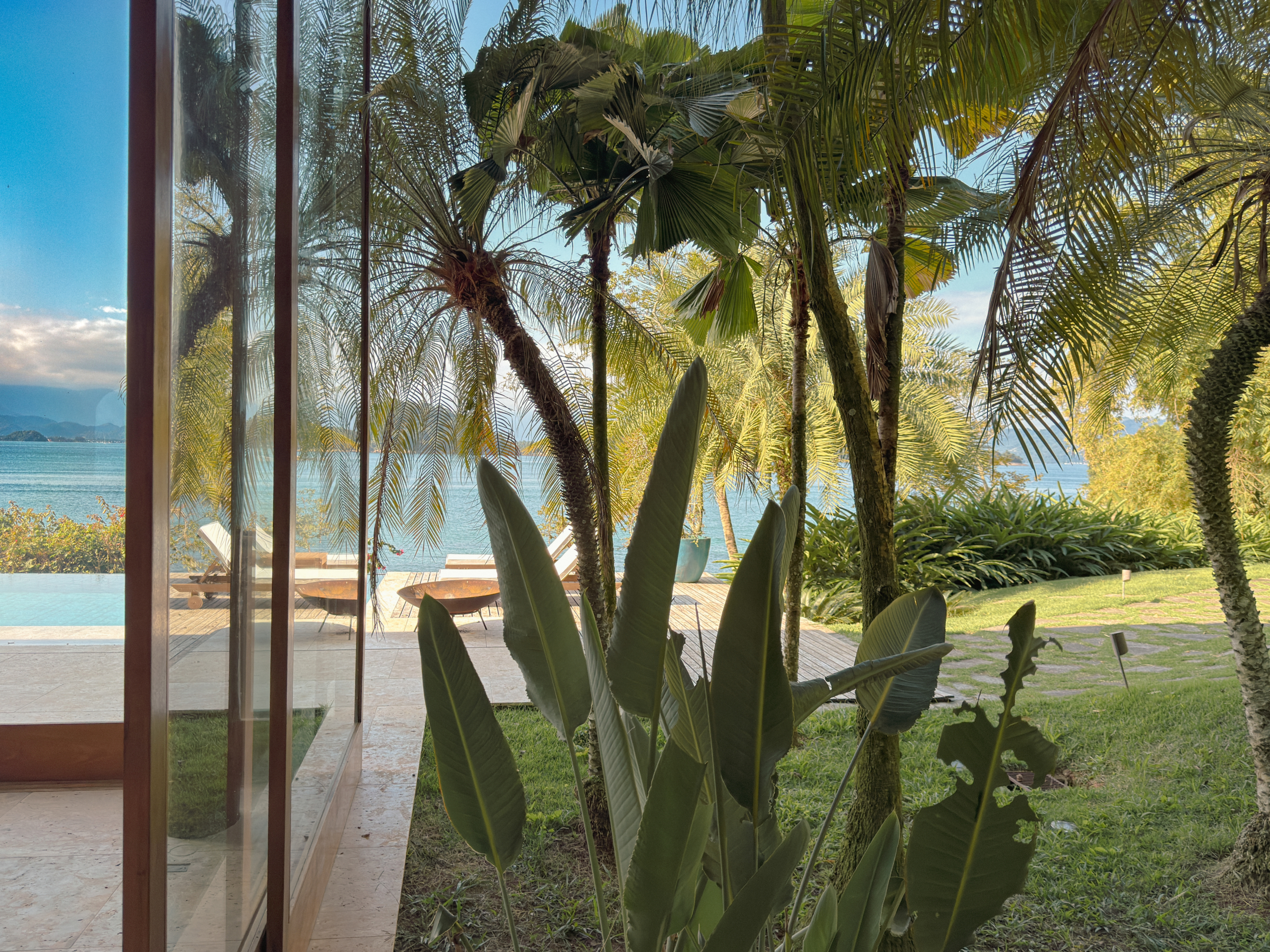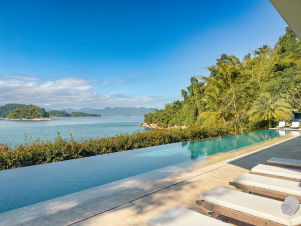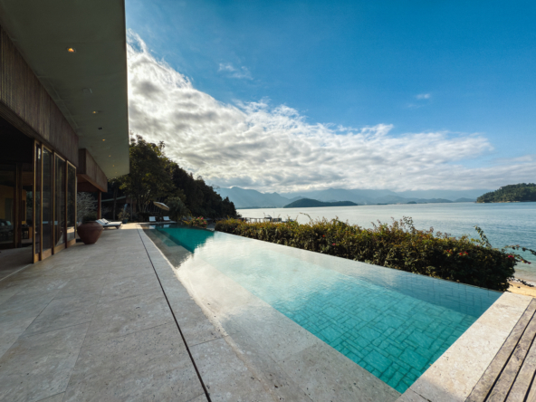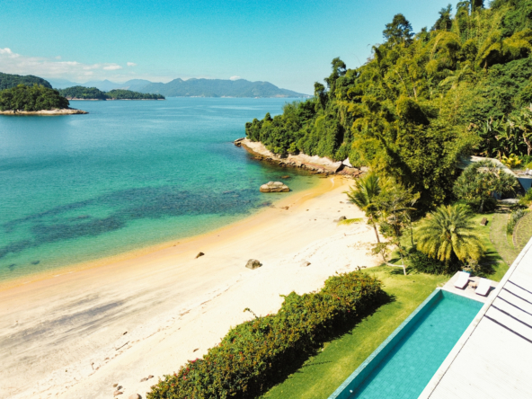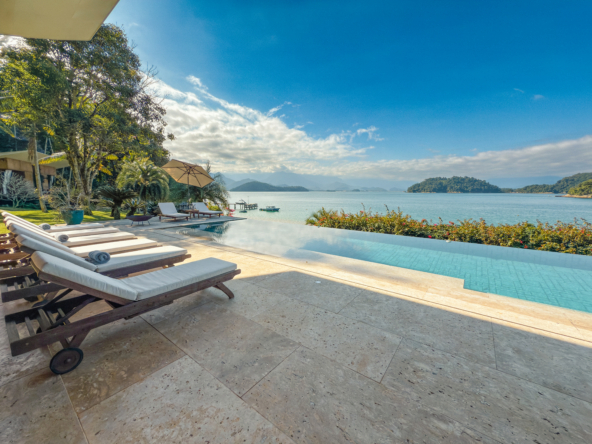 Na área externa, o cenário é paradisíaco: piscina de borda infinita com 36 metros, sauna, jacuzzi e uma praia particular com 200 metros de extensão, além de um píer privativo com capacidade para grandes embarcações. A propriedade também possui heliponto e gerador próprio, garantindo total autonomia e exclusividade.