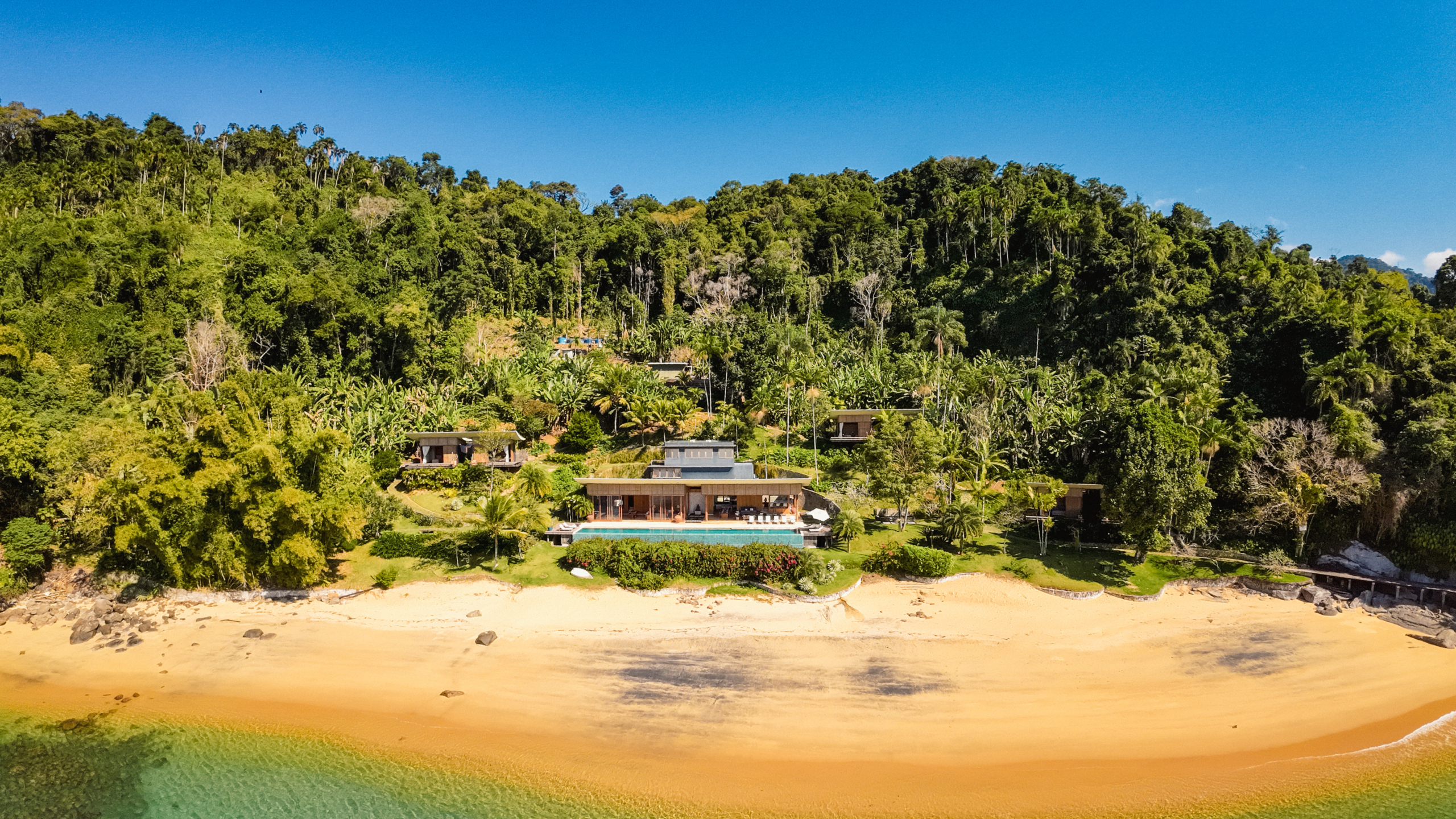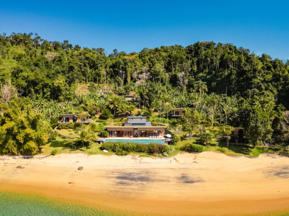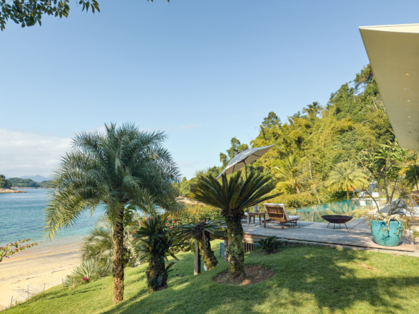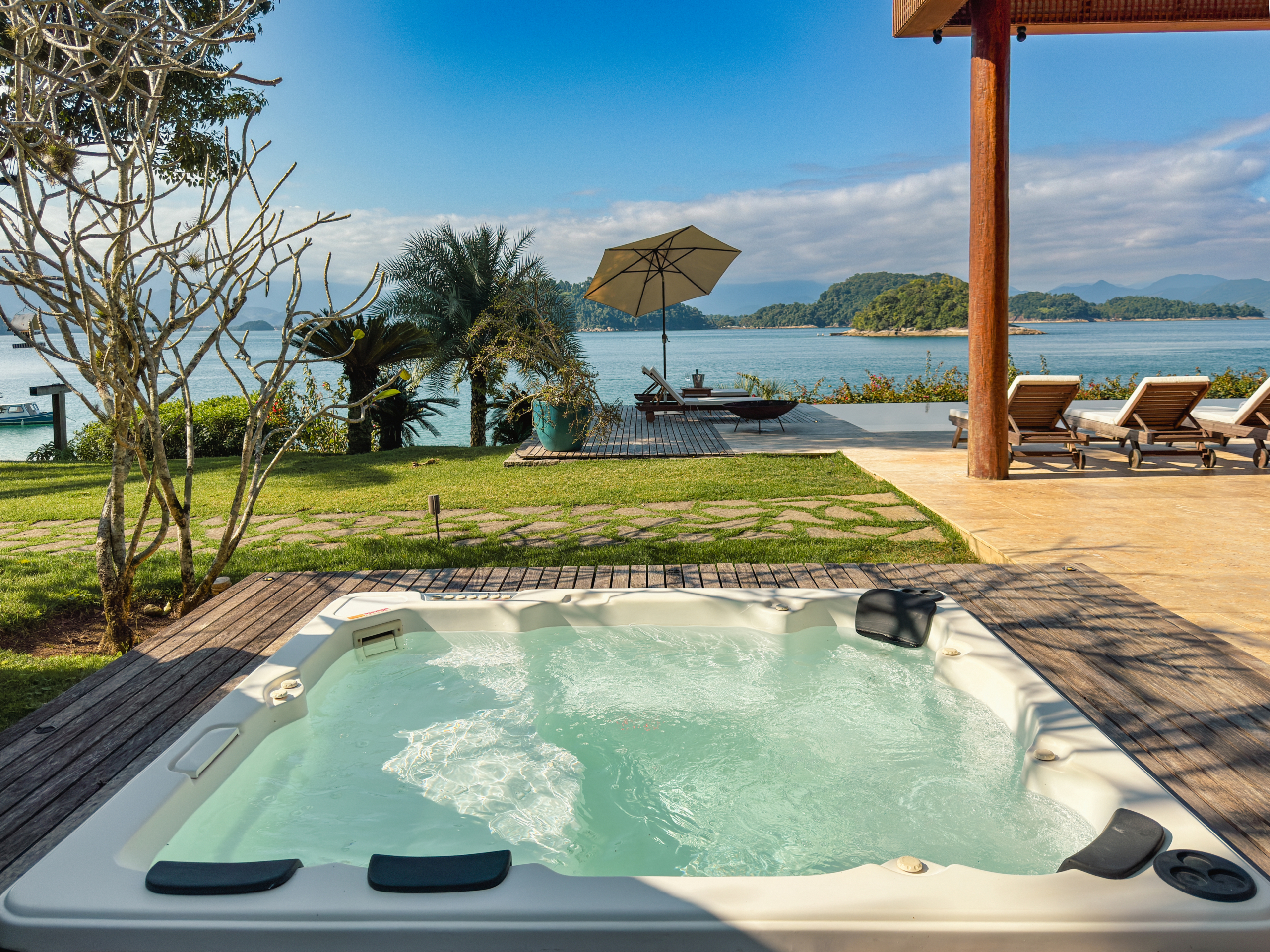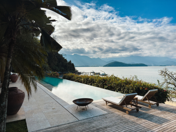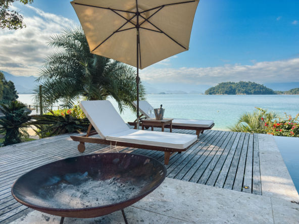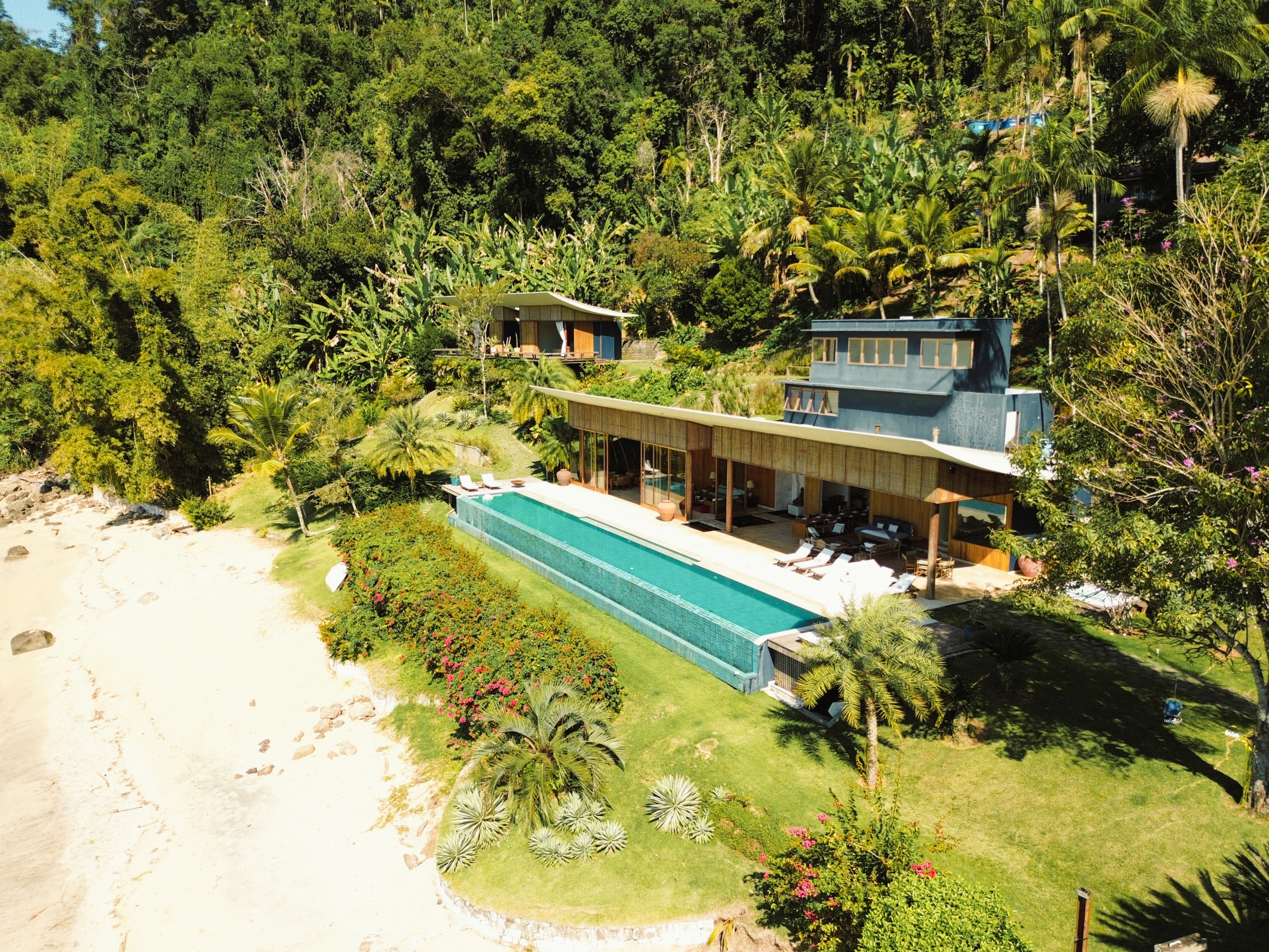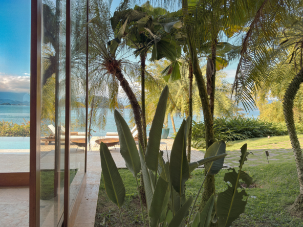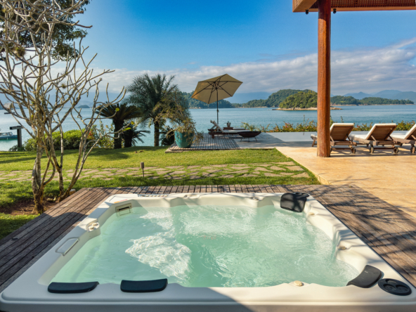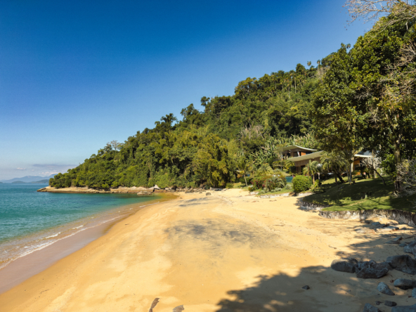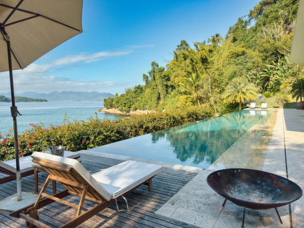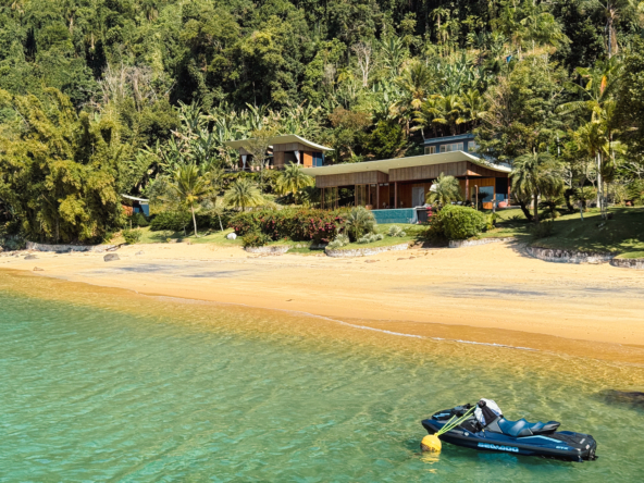 Na área externa, o cenário é paradisíaco: piscina de borda infinita com 36 metros, sauna, jacuzzi e uma praia particular com 200 metros de extensão, além de um píer privativo com capacidade para grandes embarcações. A propriedade também possui heliponto e gerador próprio, garantindo total autonomia e exclusividade.