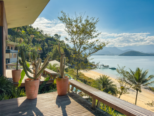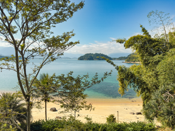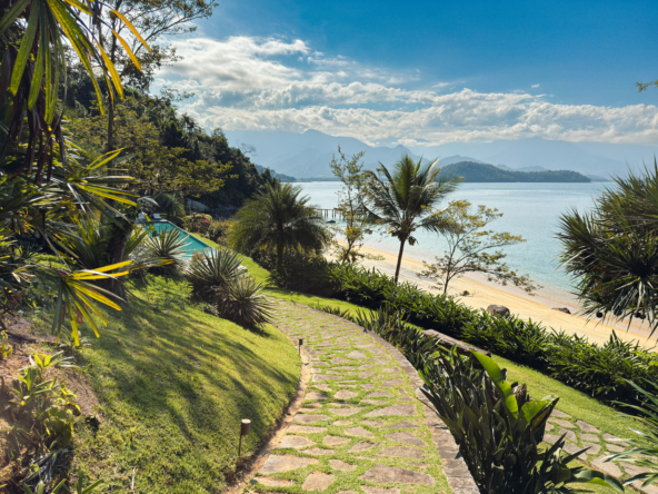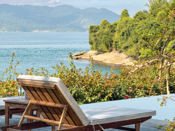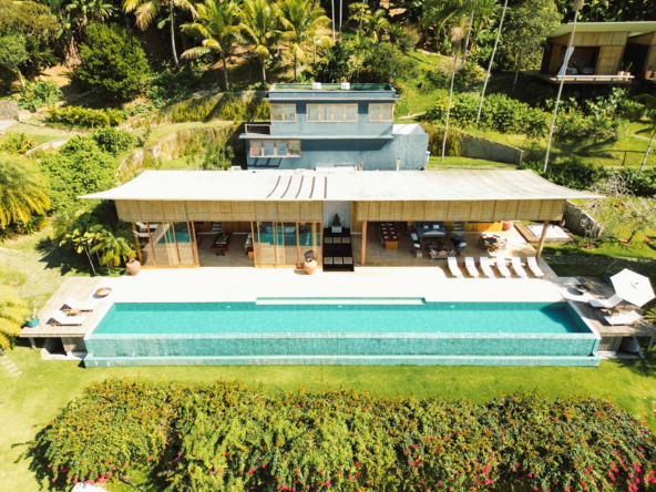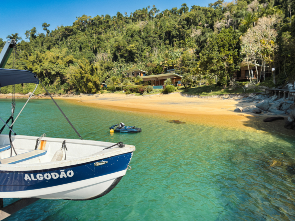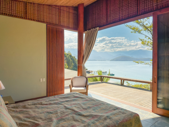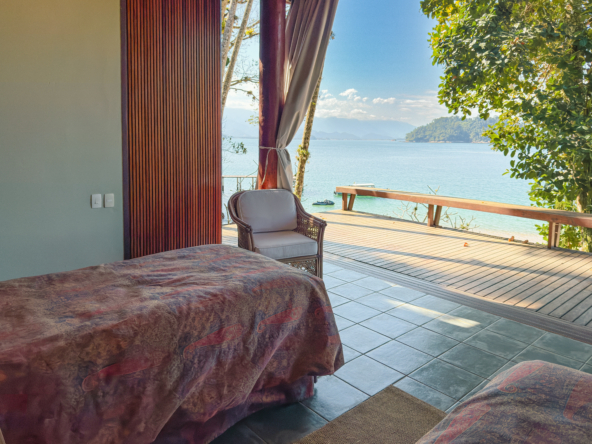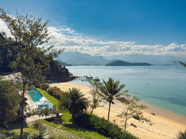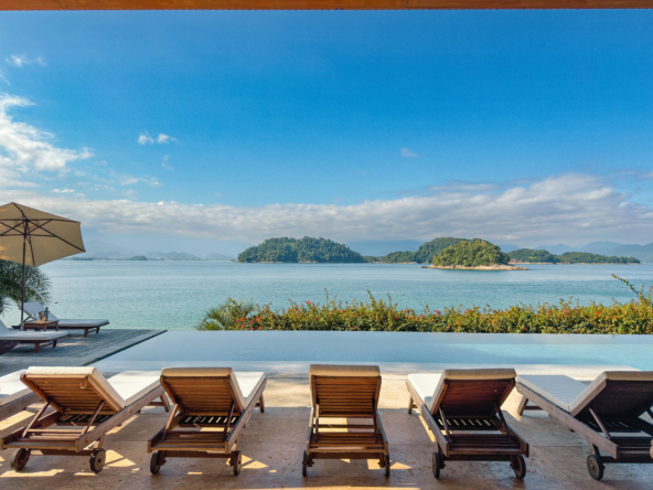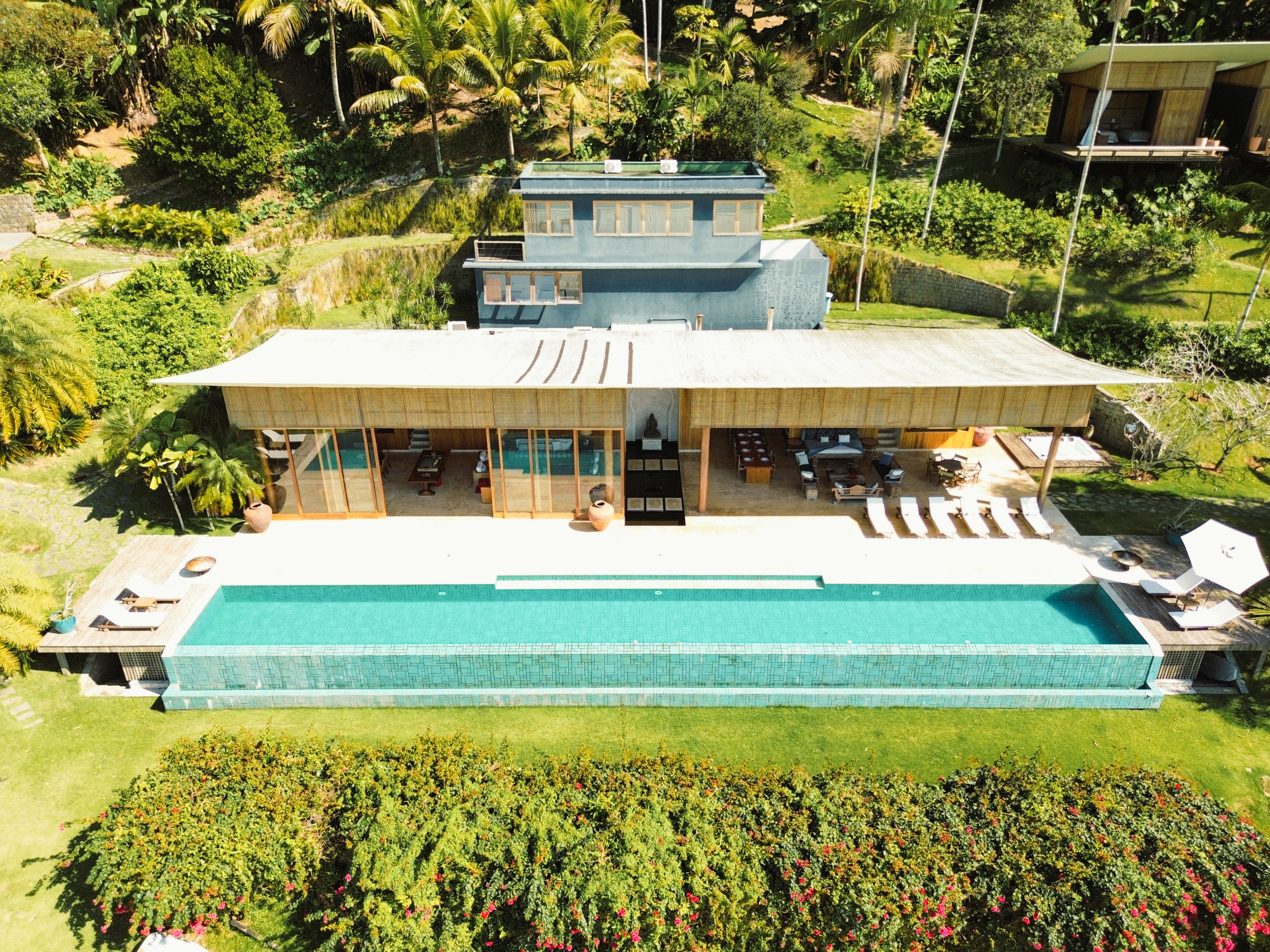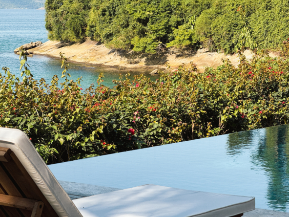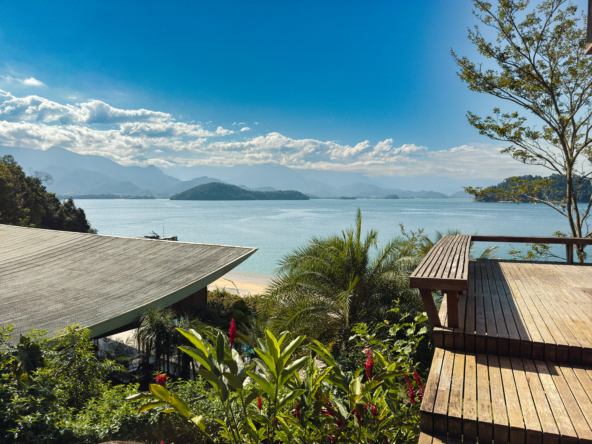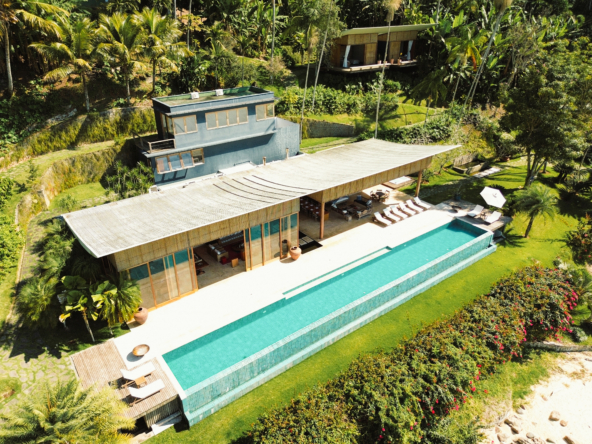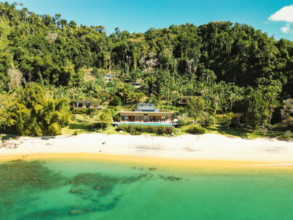 Na área externa, o cenário é paradisíaco: piscina de borda infinita com 36 metros, sauna, jacuzzi e uma praia particular com 200 metros de extensão, além de um píer privativo com capacidade para grandes embarcações. A propriedade também possui heliponto e gerador próprio, garantindo total autonomia e exclusividade.