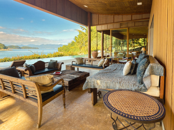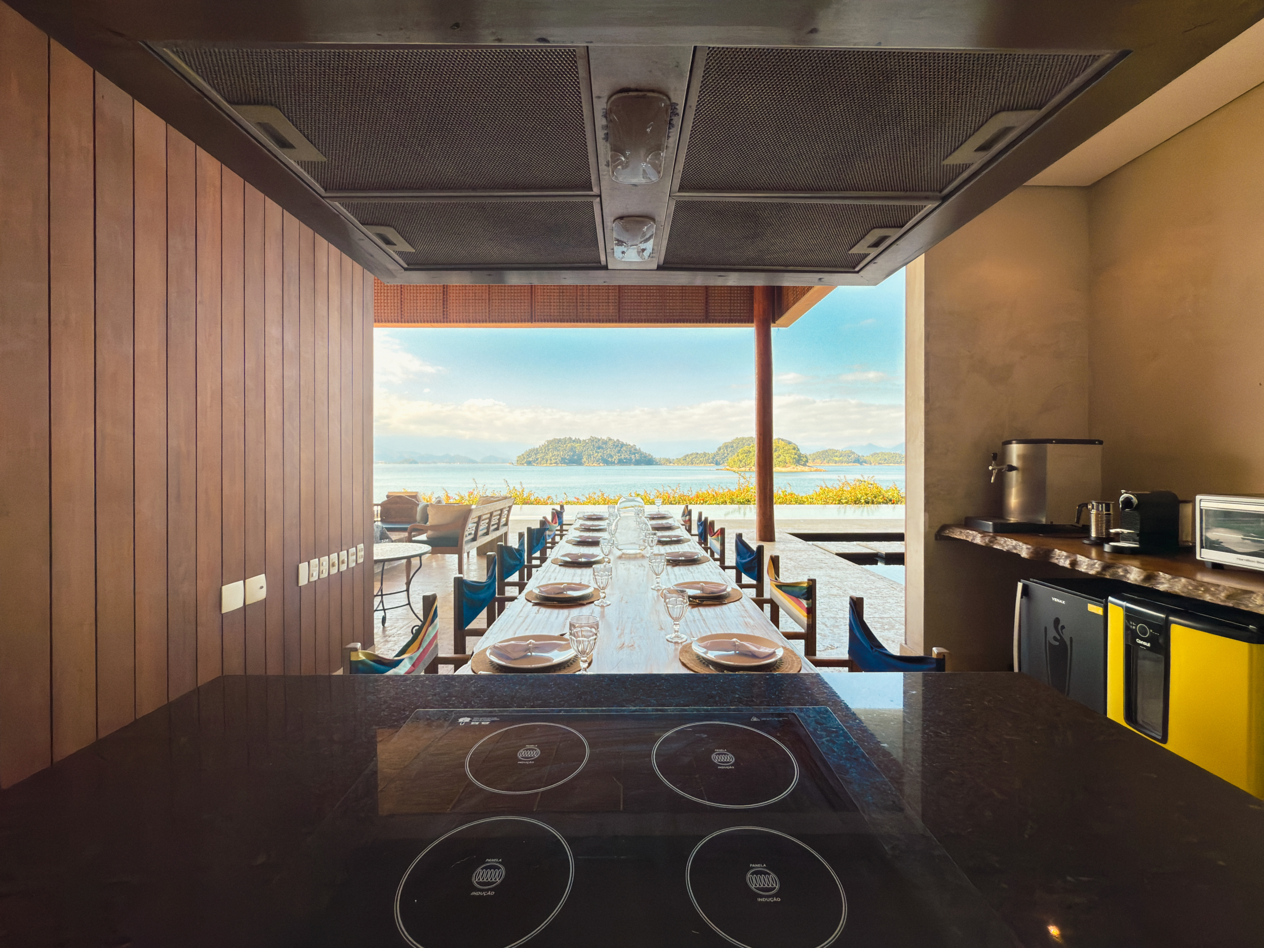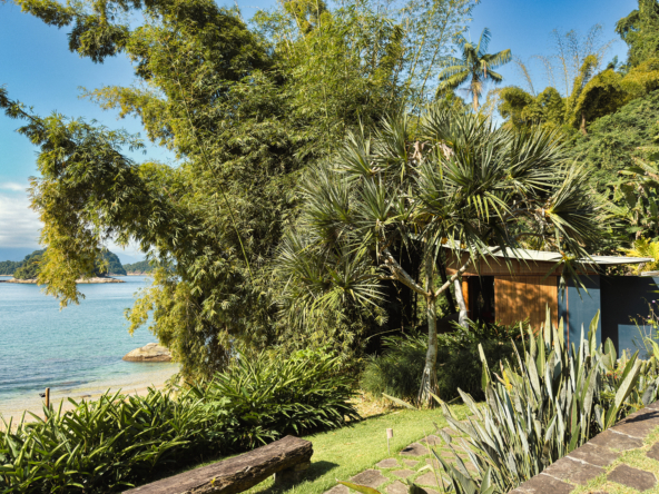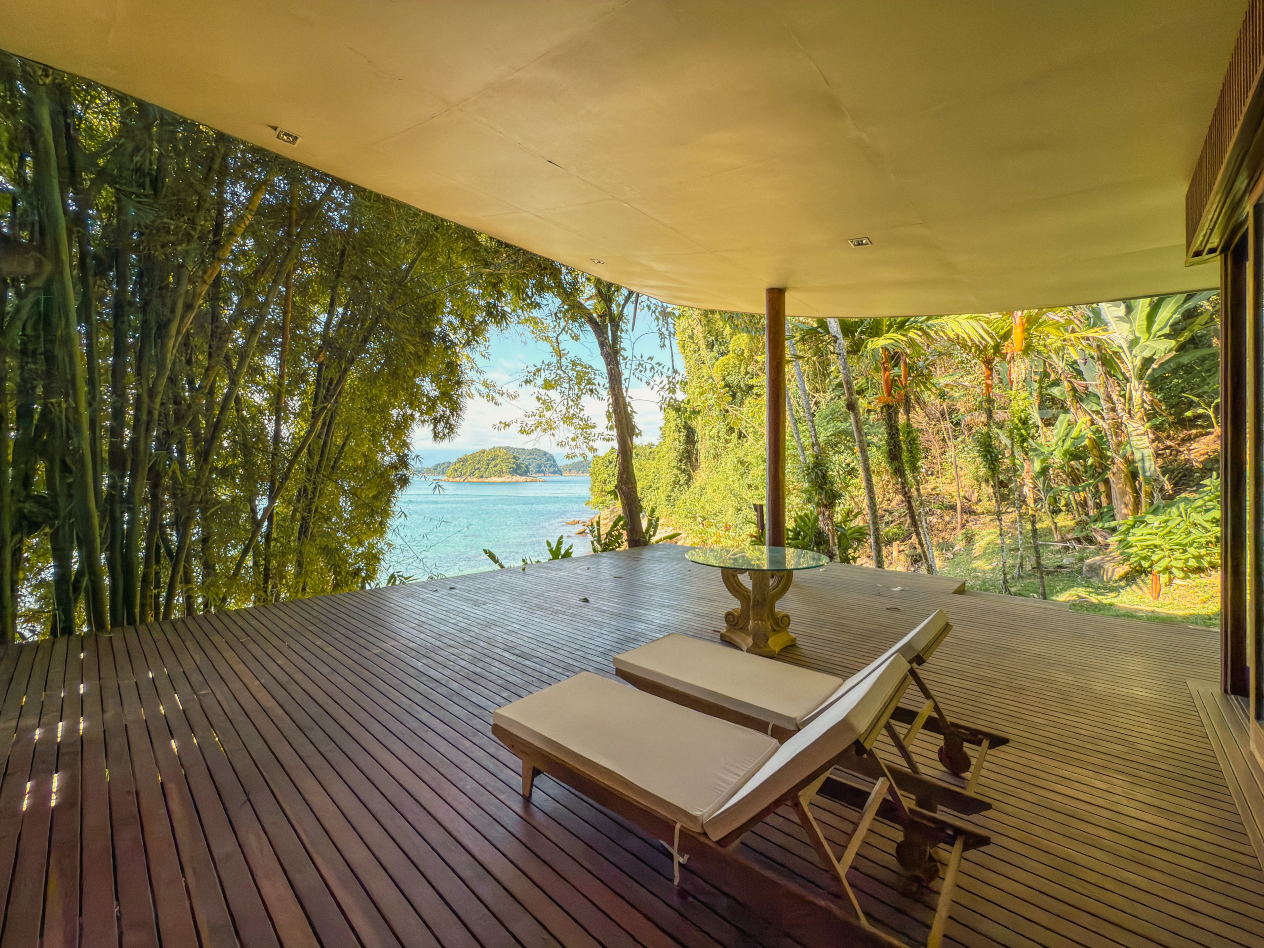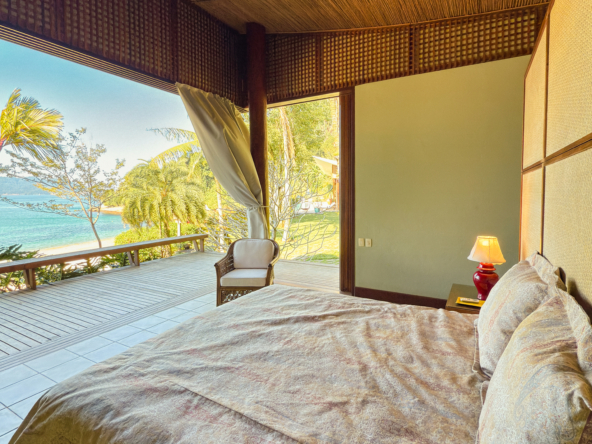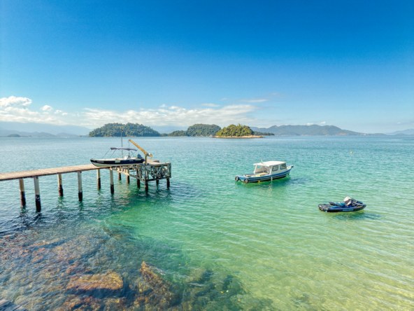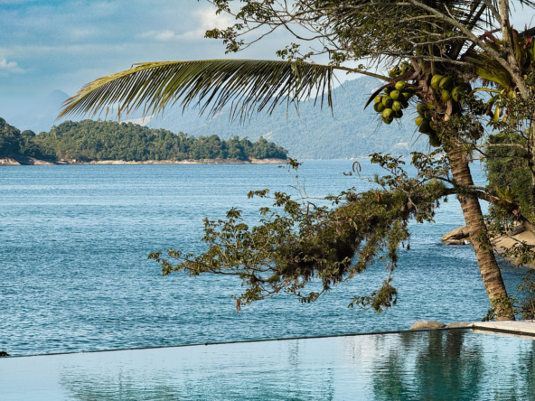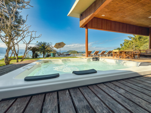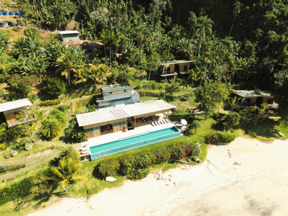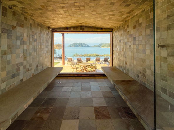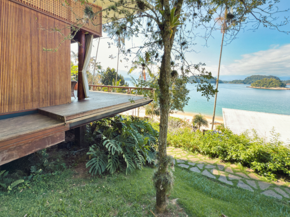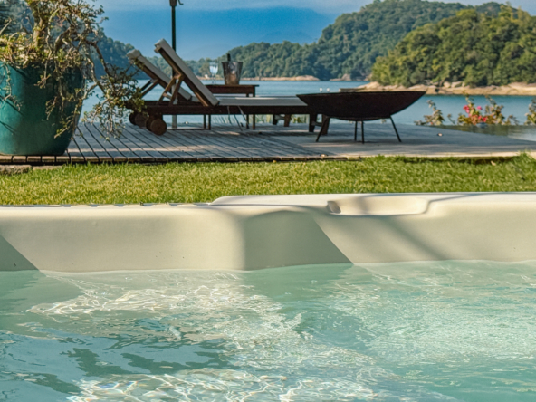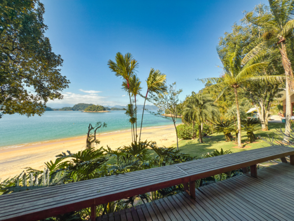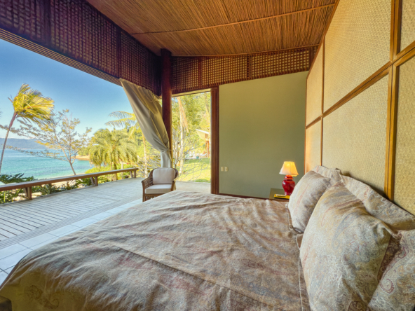 Na área externa, o cenário é paradisíaco: piscina de borda infinita com 36 metros, sauna, jacuzzi e uma praia particular com 200 metros de extensão, além de um píer privativo com capacidade para grandes embarcações. A propriedade também possui heliponto e gerador próprio, garantindo total autonomia e exclusividade.