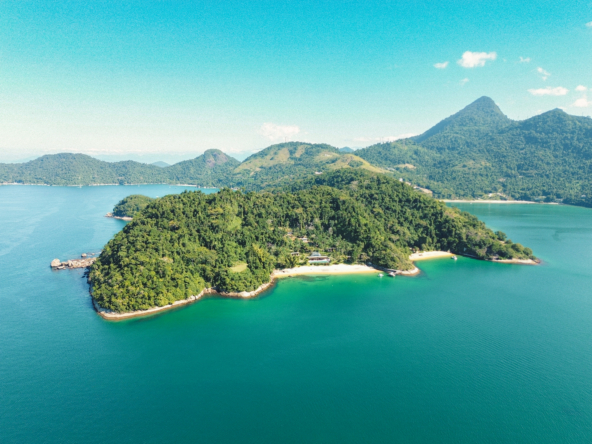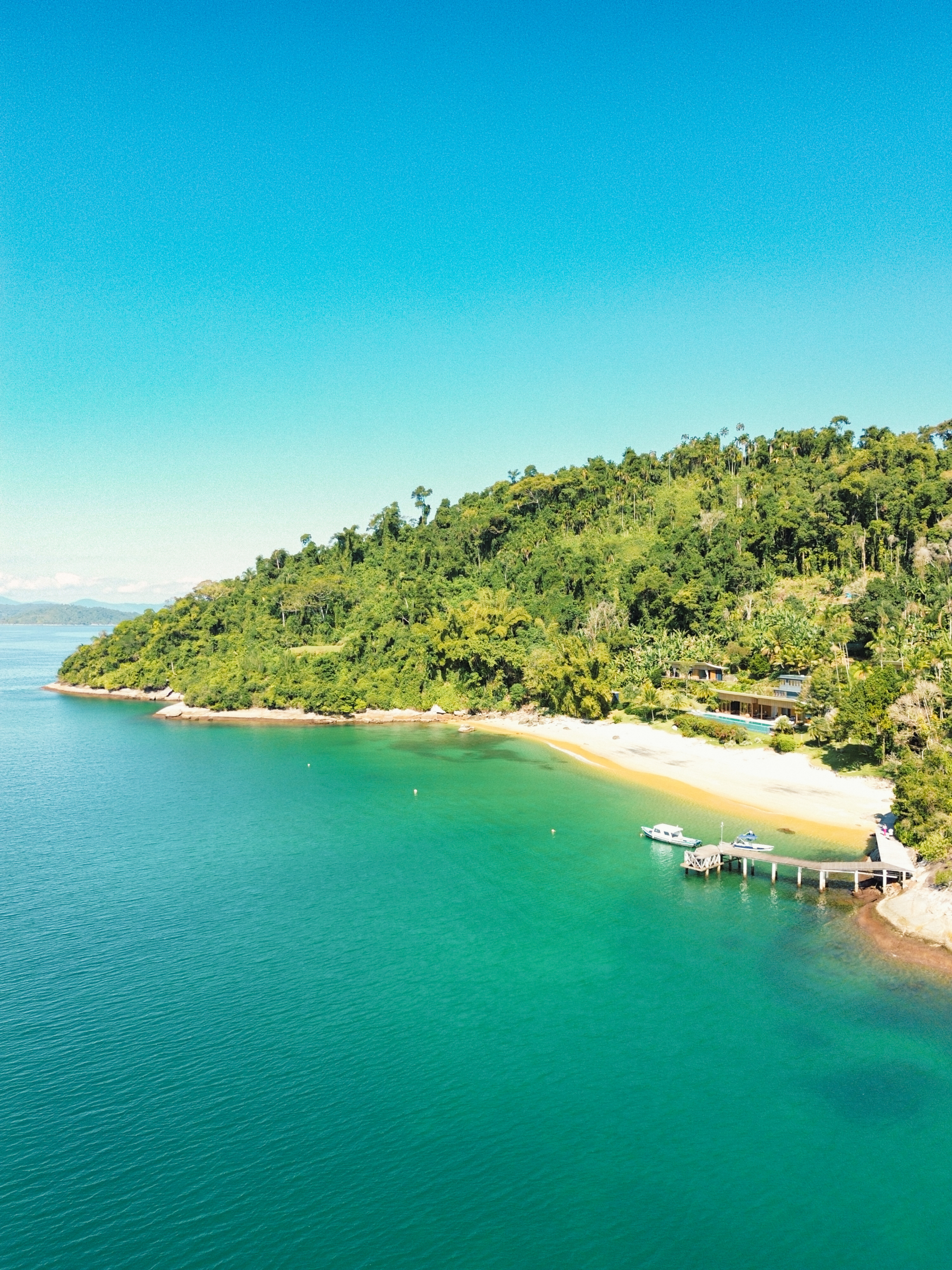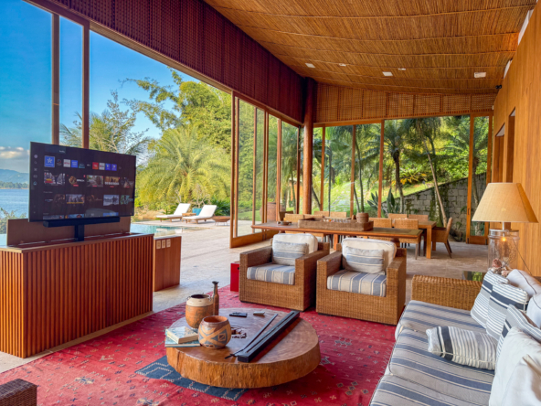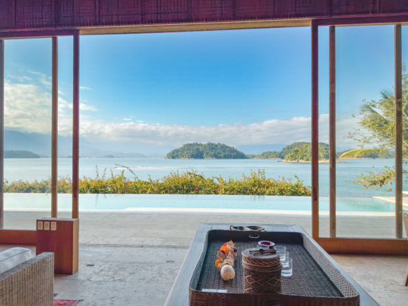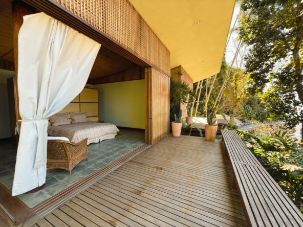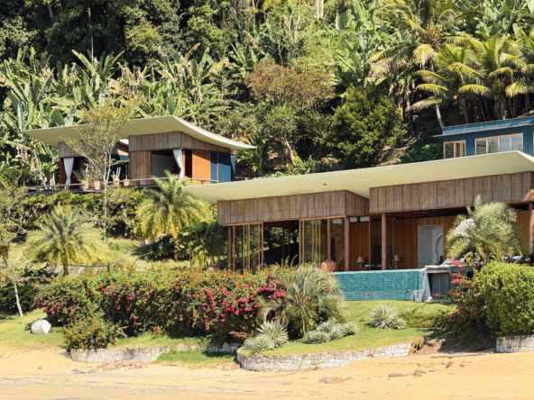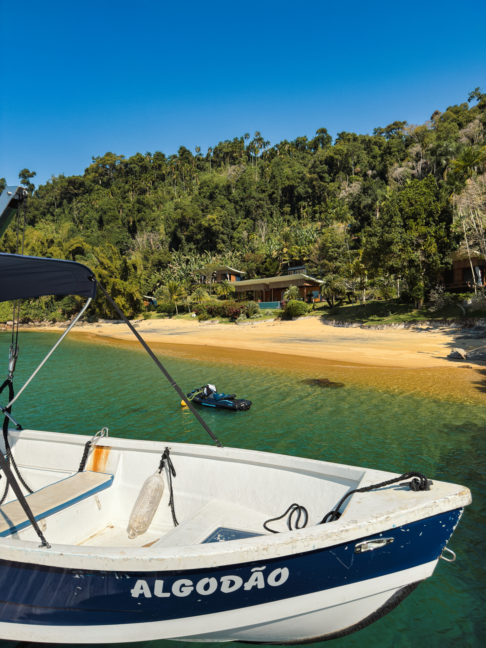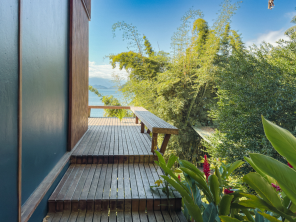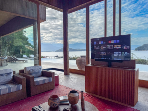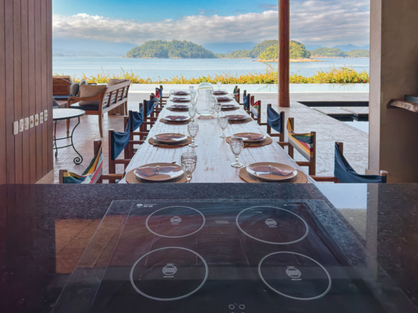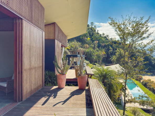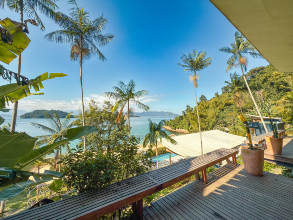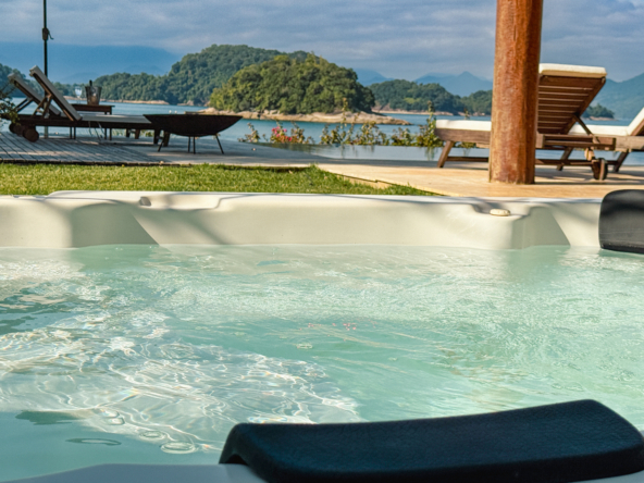 Na área externa, o cenário é paradisíaco: piscina de borda infinita com 36 metros, sauna, jacuzzi e uma praia particular com 200 metros de extensão, além de um píer privativo com capacidade para grandes embarcações. A propriedade também possui heliponto e gerador próprio, garantindo total autonomia e exclusividade.