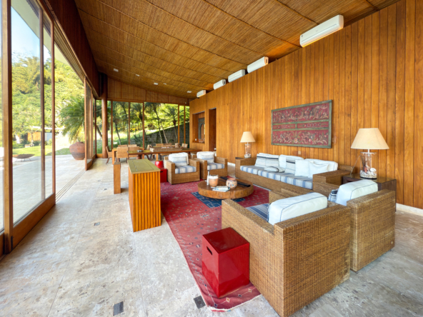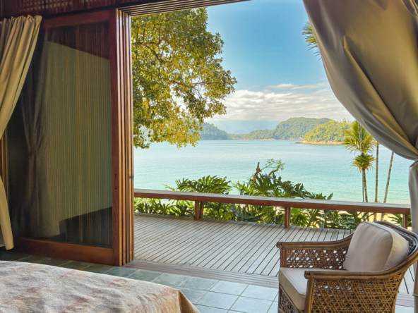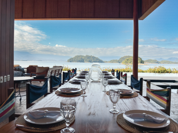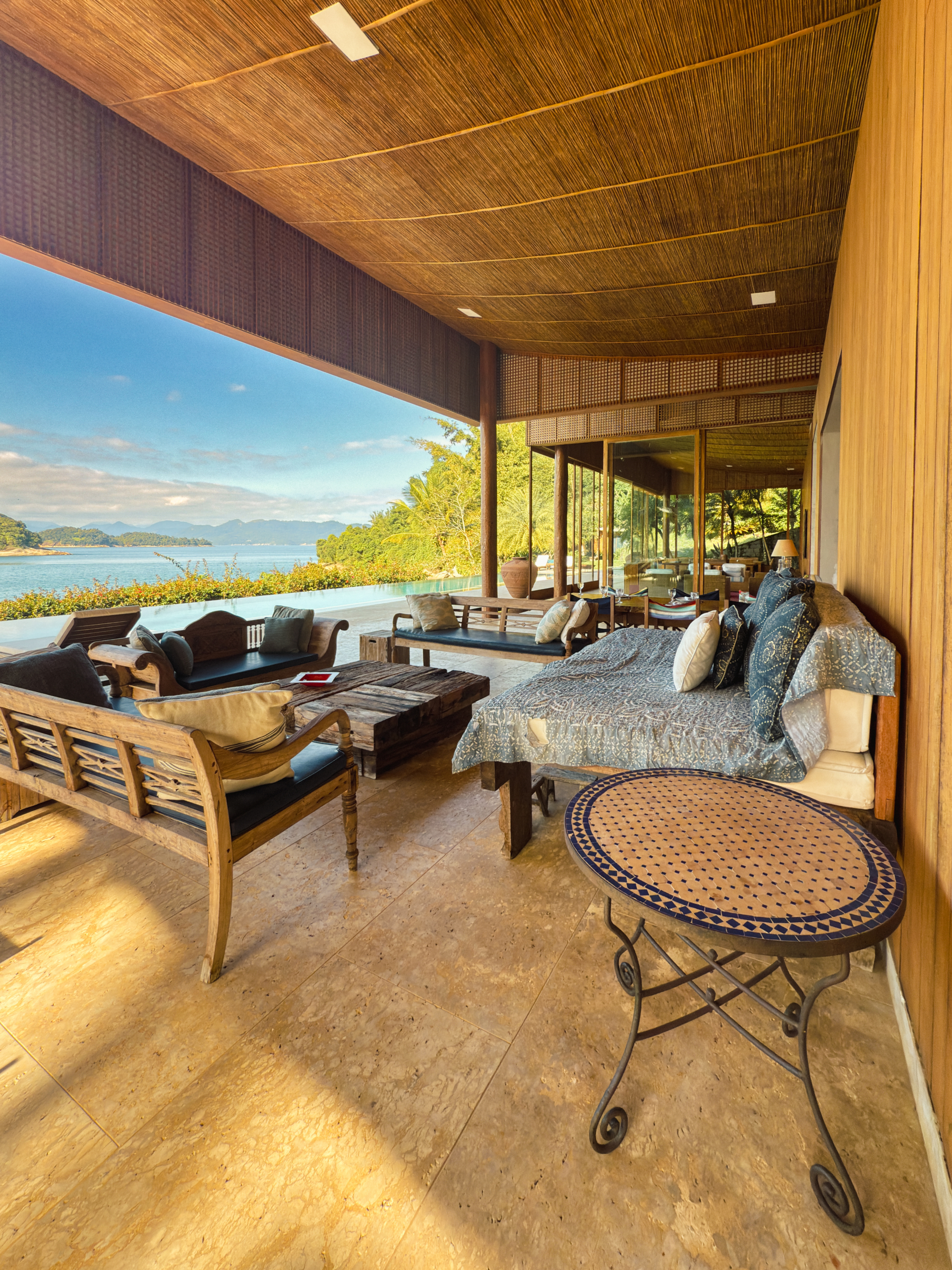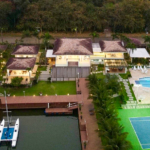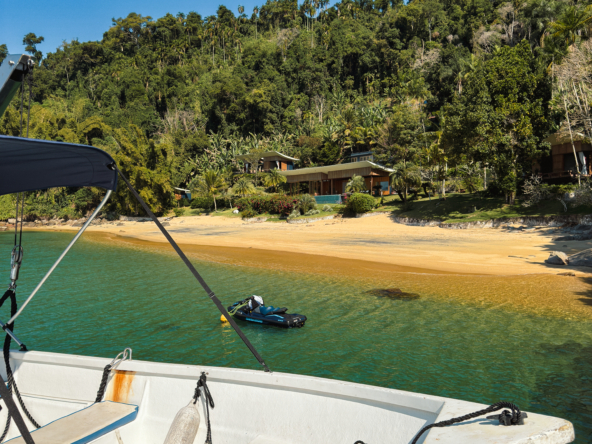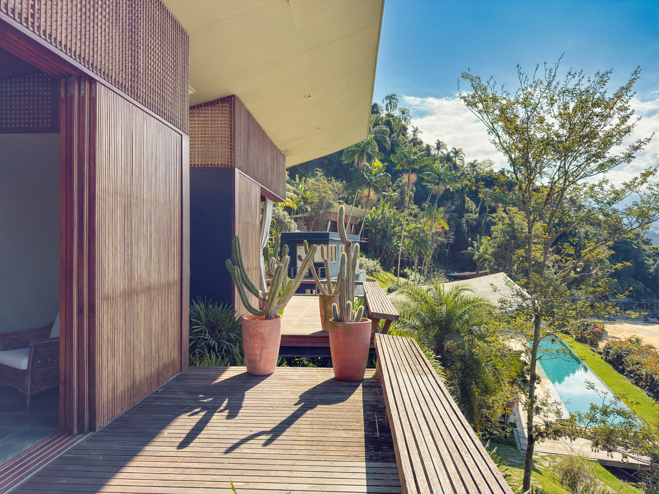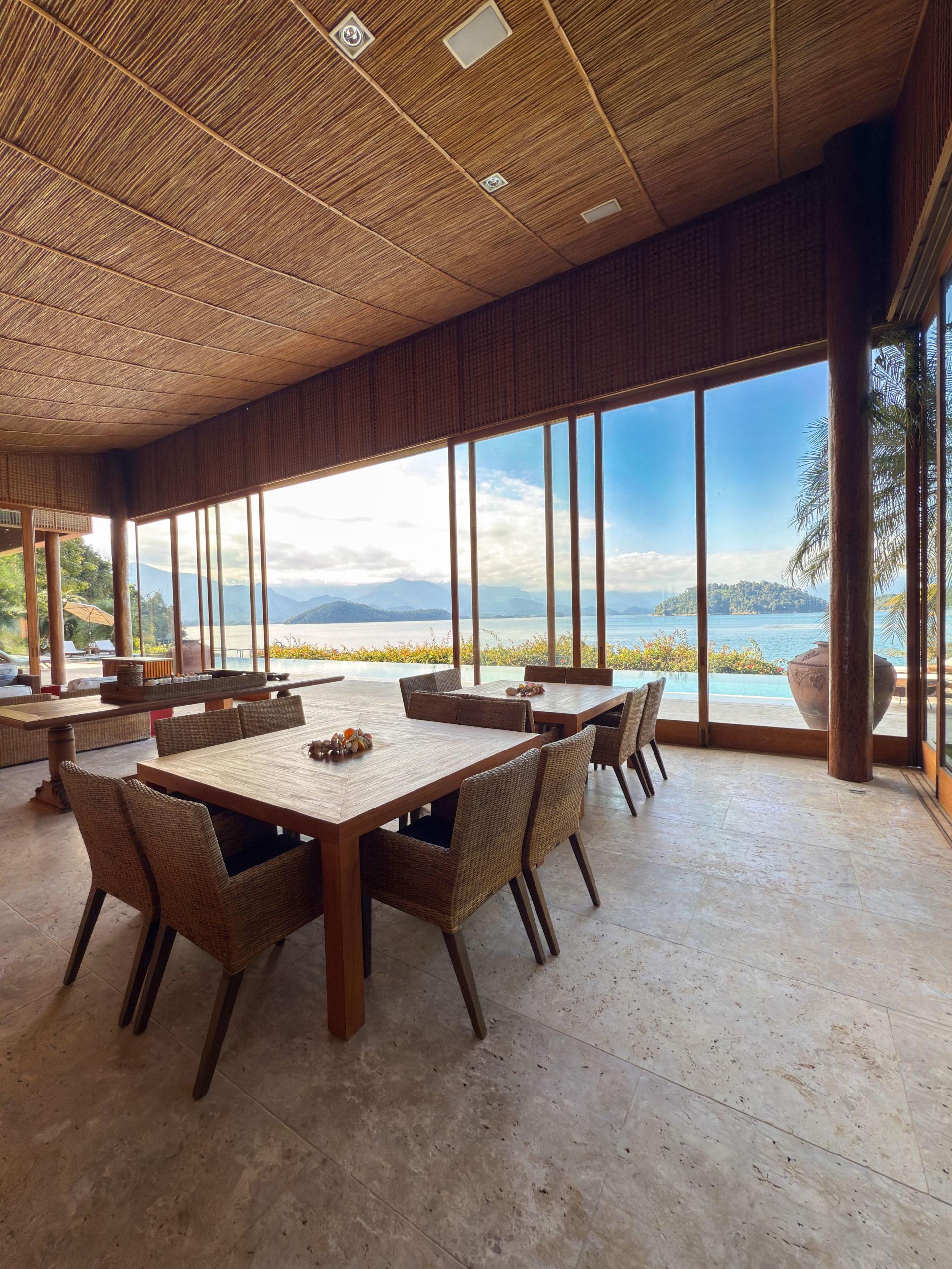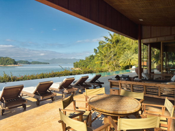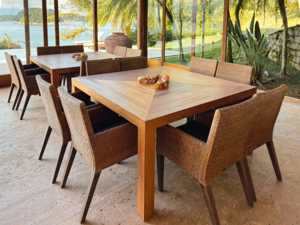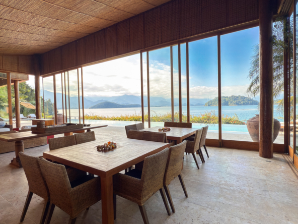 Na área externa, o cenário é paradisíaco: piscina de borda infinita com 36 metros, sauna, jacuzzi e uma praia particular com 200 metros de extensão, além de um píer privativo com capacidade para grandes embarcações. A propriedade também possui heliponto e gerador próprio, garantindo total autonomia e exclusividade.