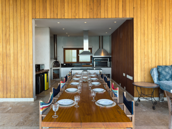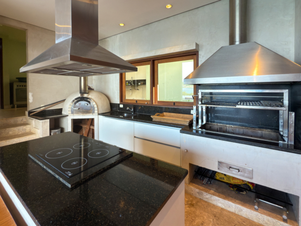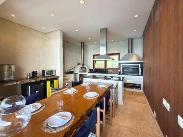 A casa principal conta com amplos ambientes e uma sala de estar com vista deslumbrante para o mar. A cozinha é completa e equipada, acompanhada por uma área de serviço funcional. Para momentos de lazer e gastronomia, o espaço gourmet é um verdadeiro destaque, com chopeira, forno a lenha e churrasqueira.