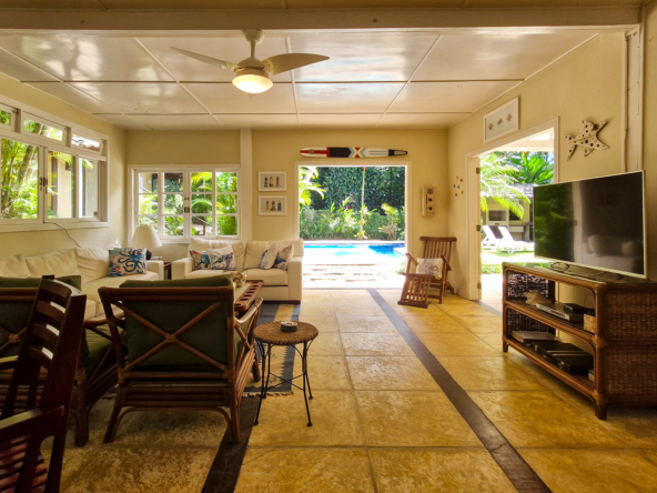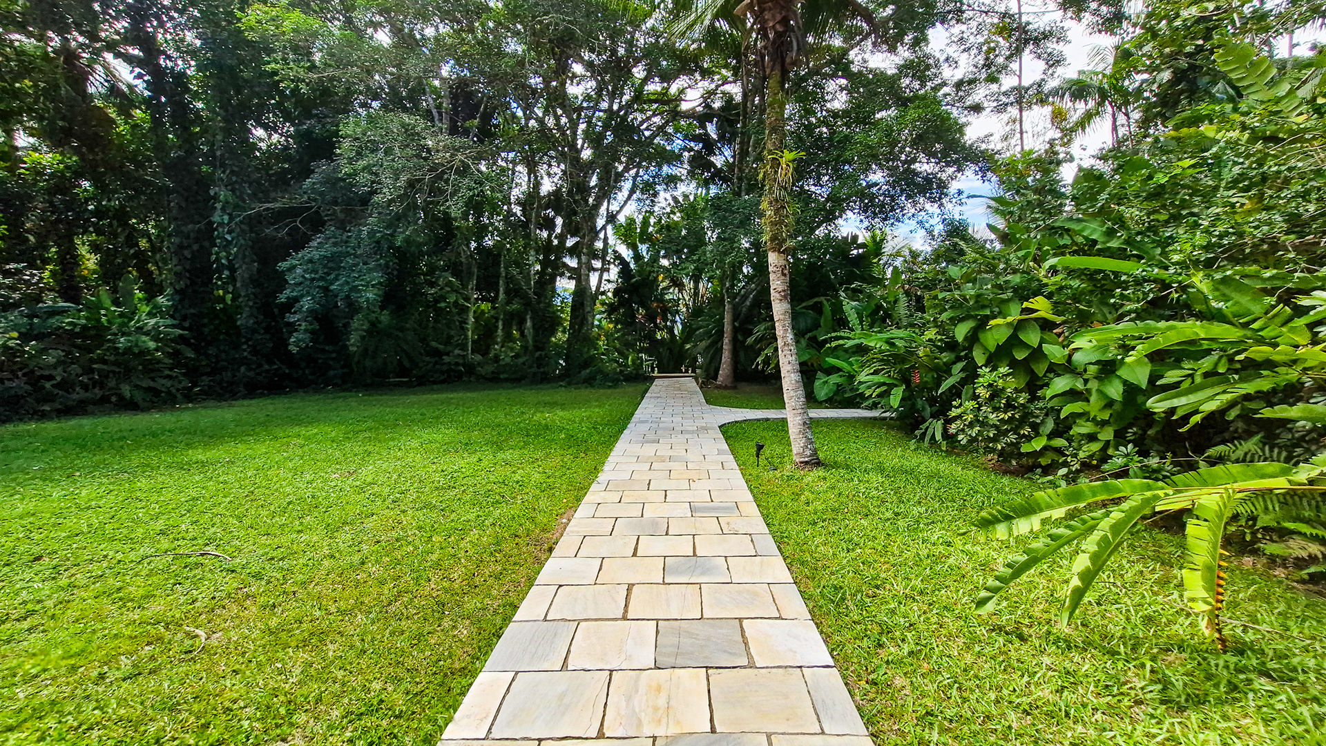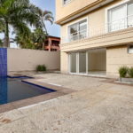 O projeto valoriza a amplitude dos espaços e a fluidez entre interior e exterior. As áreas sociais se conectam ao jardim tropical e à área de lazer, onde a piscina surge como um refúgio privativo cercado pelo verde.